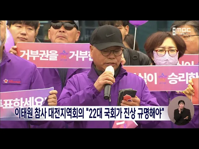 뉴스데스크 뉴스데스크뉴스투데이뉴스데스크 VOD(전체 다시보기)뉴스투데이 VOD(전체 다시보기)유튜브뉴스페이스북 뉴스카카오톡 뉴스인스타그램 뉴스 prev 2024.4.6 - 토요일 next 마지막 주말 총력전..사전투표율 최고/데스크 ◀ 앵 커 ▶4·10 총선을 앞두고, 마지막 주말을 맞아여야 모두 유권자들의 한표를 호소하는총력전에 나서며 관심과 지지를 호소했습니다.오늘까지 진행된 사전투표는 역대 총선 가운데 가장 높은 투표율로 ... 뉴스팀 이태원 참사 대전지역회의 "22대 국회가 진상 규명해야" 10.29 이태원 참사 대전지역회의가 오늘, 대전역 앞에서 기자회견을 열어제22대 국회가 이태원 참사의 진상을 철저하게 규명해야 한다고 주장했습니다.이들은 이태원 참사 특별법이 국회에서 제정됐지만, ... 이승섭 대전 서구선관위, 불법 선거운동 혐의 주민자치위원 경찰 고발 대전 서구선거관리위원회가 4.10 총선에서 불법 선거운동을 한 혐의로 대전 서구의 주민자치위원 한 명을 경찰에 고발했습니다. 이 주민자치위원은 특정 정당의 후보자들이 올린 SNS 게시물에 지지, 선전... 고병권 홍성·예산 강승규 후보 측 "현수막 훼손" 경찰 수사 제22대 국회의원 선거를 앞두고, 홍성·예산 지역구에서 투표를 독려하는 내용을담은 특정 후보 측의 현수막이 훼손됐다는 신고가 접수돼 경찰이 수사에 나섰습니다.경찰은 오늘 오전, 현수막을 훼손한 남... 이승섭 '주가 조작 혐의' 대전 모 IT 기업 재판 2년 만에 재개 허위 정보를 흘려 주가를 조작해수백억 원의 부당이득을 챙긴 혐의로 기소된대전의 한 IT기업 관계자들의 재판이 2년여 만에 재개됐습니다.어제 대전지법 제12형사부 심리로 열린공판에서 재판부는 주요 ... 이승섭 일면식 없는 행인 흉기로 살해한 20대 중형 대전지법 형사 12부가 흉기를 휘둘러 행인을 숨지게 한 혐의로 기소된 20대에게 징역 18년과 전자발찌 부착 명령 15년을 선고했습니다.재판부는 '묻지마' 범죄는 누구나 피해자가될 수 있다는 점에서 사회... 뉴스팀