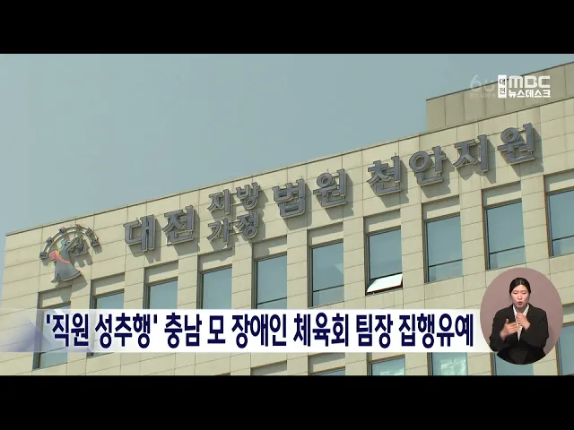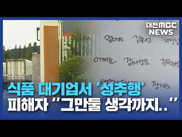 뉴스데스크 뉴스데스크뉴스투데이뉴스데스크 VOD(전체 다시보기)뉴스투데이 VOD(전체 다시보기)유튜브뉴스페이스북 뉴스카카오톡 뉴스인스타그램 뉴스 prev 2024.8.1 - 목요일 next 대전 펜싱 영웅 금메달..모교서 열띤 응원/데스크 ◀ 앵 커 ▶대전이 낳은 펜싱 영웅, 오상욱·박상원 선수가 '올림픽 3연패'라는 새 역사를 썼습니다.두 선수의 모교에서는 늦은 밤까지 열띤 응원전이 이어졌습니다.김성국 기자입니다.◀ 리포트 ▶시작부터 상... 김성국 체감 온도 36도까지..내일 5에서 20mm 비 대전과 세종을 비롯해 아산과 공주 등 충남 9개 시군에 폭염 경보가, 나머지 6개 시군에 폭염 주의보가 유지 중인 가운데체감온도가 36도까지 오르는 찜통더위가 이어졌습니다.오늘 한낮 수은주는 논산 35... 김성국 폭우로 내려앉은 대전 유등교 전면 철거 뒤 신축 대전시가 지난달 집중호우로 침하된유등교를 전면 철거한 뒤 오는 2027년까지 새 다리를 놓습니다.시는 유등교 점검 결과 붕괴 우려가 있는E등급을 받아 전면 철거가 불가피하다며 교통 혼잡을 줄이기 위... 박선진 대청호 문의 수역 조류경보 '관심' 단계 발령 금강유역환경청이 대청호 문의 수역에 대해조류경보 '관심' 단계를 발령했습니다.환경청은 여름철 집중 호우로 상류에서 오염원이 유입되고 폭염으로 수온이 오르면서유해남조류가 늘었기 때문으로 분석했... 김지훈 식품 대기업서 성추행..."피해자만 고통"/데스크 ◀ 앵 커 ▶충남에 있는 식품 대기업 공장 직원이여직원을 성추행하는 사건이 있었는데, 제대로 된 분리 조치가 없어 피해자가 한 달 넘게 불안에 떨어야 했습니다.피해자의 호소에도 꿈적하지 않던 대기업.... 뉴스팀 신입 직원 성추행 장애인 체육회 팀장 집행유예 대전지법 천안지원 형사1단독 정은영 부장판사가 20대 신입 직원을 강제 추행한 혐의로 충남의 한 장애인 체육회 소속 40대 팀장에게 징역 6개월에 집행유예 2년을 선고했습니다.피고인은 지난 2019년 6월... 김성국 대전 어린이집 아동학대 의혹…경찰 수사 중 대전경찰청은 지난 5월 대전 유성구의 한 어린이집에서 교사 두 명이 두세 살배기 원아들을 이불 위로 던지는 등 학대하는 CCTV를 봤다는 신고가 접수돼 수사 중이라고 밝혔습니다.현재까지 확인된 피해 ... 윤소영 대전 중구청장 재선거 후보자 선거법 위반 혐의 고발 대전중구선거관리위원회가 지난 4월 치러진 중구청장 재선거에서 선거비용 규정을 어긴 후보자와 선거캠프 관계자 7명 등 8명을 검찰에 고발했습니다. 해당 후보자는 선거사무원 40여 명에게 법정수당과 ... 박선진 충남도, 내년 초까지 안면도 개발사업 계약 해지여부 검토 충남도가 안면도 개발 투자이행금 70억 원을 내지 못한 사업자와의 계약 해지 여부를 내년 초 결정합니다.충남도는 증권사 등 8개 기업이 참여한 사업시행자 온더웨스트 컨소시엄이 토지 대금 일부 등 149... 김태욱 태안군 "화력발전 폐지에 맞춰 대체발전소 건설해야" 태안군이 화력발전소 폐지에 맞춰 신규 대체발전소 건설 지원과 해상풍력단지 개발을 위한 단지를 지정해 줄 것을 충남도에 건의했습니다.태안군은 내년 2기를 시작으로 오는 2032년까지 태안화력 내 발전... 김태욱