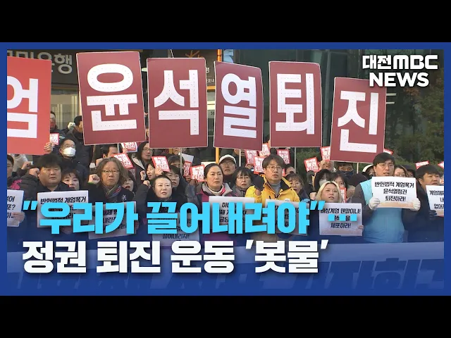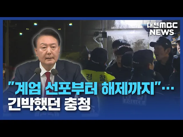 뉴스데스크 뉴스데스크뉴스투데이뉴스데스크 VOD(전체 다시보기)뉴스투데이 VOD(전체 다시보기)유튜브뉴스페이스북 뉴스카카오톡 뉴스인스타그램 뉴스 prev 2024.12.4 - 수요일 next 국공립대교수연합 "대통령 탄핵해야"..최교진 "민주주의 교훈으로 가르쳐야" 충남대와 공주교대 등 전국 40개 국공립대학교수회연합회가 시국 성명을 통해 불법적 비상 계엄으로 대한민국을 극도의 혼란과 불안에 빠뜨린 윤석열 대통령의 탄핵과 관련자 처벌을 촉구했습니다.또, 헌... 조형찬 들끓는 충청...이시각 정권 퇴진 집회 현장/데스크 ◀ 앵 커 ▶12·3 비상계엄 사태에 대해 대통령 탄핵을 요구하는 목소리가 전국에서 터져 나오는 가운데, 충청권 민심도 들끓고 있습니다.시민들은 대전 도심에 나와윤석열 정권 퇴진을 외치고 있는데요.현장... 김성국 "우리가 끌어내려야"...정권 퇴진 운동 '봇물'/데스크 ◀ 앵 커 ▶국회의 의결로 6시간 만에 해제됐지만, 윤석열 대통령의 비상계엄 선포에 대한 민심의 불안과 분노는 컸습니다.아침 출근길부터 도심 곳곳에서 대통령 퇴진을 외치는 목소리가 울려 퍼졌고,각계 ... 김윤미 '초유의 6시간'⋯"명백한 헌정 유린"/데스크 ◀ 앵 커 ▶이번 12·3 비상계엄 사태는 명백한 헌정 유린인 만큼 대통령이 책임을 져야 한다는 데에뜻이 모아지고 있습니다.대통령을 향한 각계각층의 목소리를 들어봤습니다.고병권 기자가 보도합니다.◀ 리... 고병권 "2024년 맞나?"...비상계엄에 충격·분노/데스크 ◀ 앵 커 ▶법과 상식을 뒤엎는 비상계엄은불과 6시간 만에 끝이 났지만,그 파장은 여전히 뜨겁습니다.충격과 분노에 휩싸인 시민들은대통령에게 그 책임을 물어야 할 때라고 목소리를 높였습니다.이어서 시... 윤소영 "계엄 선포부터 해제까지"...긴박했던 충청/데스크 ◀ 앵 커 ▶45년 만의 비상계엄.어젯밤, 윤석열 대통령이 비상계엄을 선포하면서 대전과 세종, 충남 지역도긴장감 속에 하루를 보냈습니다.군과 경찰이 비상 대기에 들어갔고,각 지방자치단체는 비상 상황에... 이승섭