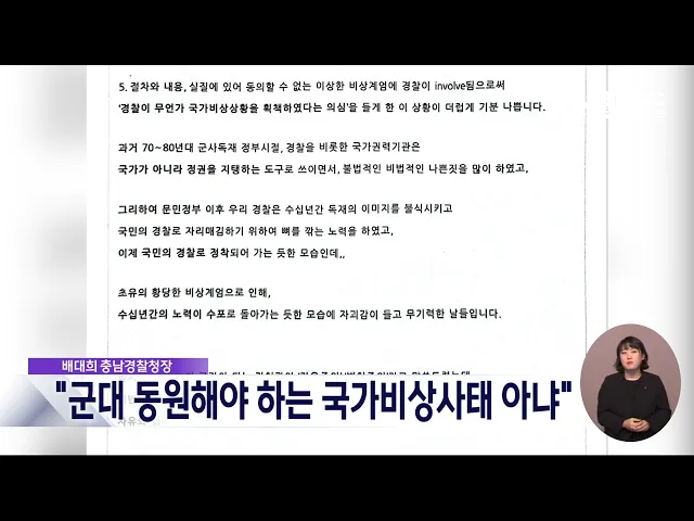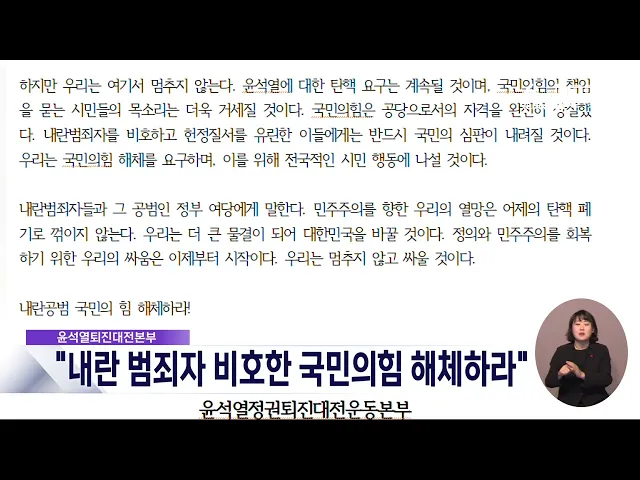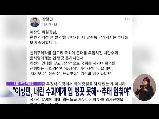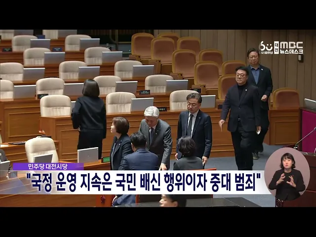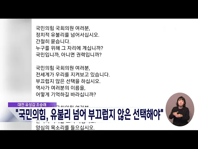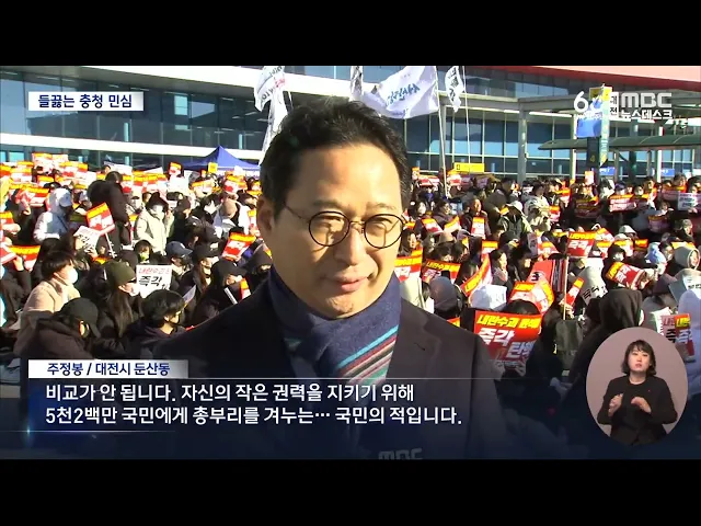 뉴스데스크 뉴스데스크뉴스투데이뉴스데스크 VOD(전체 다시보기)뉴스투데이 VOD(전체 다시보기)유튜브뉴스페이스북 뉴스카카오톡 뉴스인스타그램 뉴스 prev 2024.12.8 - 일요일 next 무산된 대통령 탄핵..들끓는 충청 민심/데스크 ◀ 앵 커 ▶윤석열 대통령에 대한 탄핵소추안 표결이 국민의힘 의원들의 불참으로 무산되면서충청권 민심이 들끓고 있습니다.표결 무산 하루 만에 거리로 나온 시민들은대통령의 탄핵을 촉구하고,무책임한 ... 윤소영 윤석열퇴진대전본부 "내란범죄자 비호한 국민의힘 해체하라" 대전지역 30여 개 시민사회단체로 구성된윤석열정권퇴진 대전운동본부는 성명을 통해,불법 계엄 주동자인 윤석열 대통령의 체포와탄핵소추안 표결을 막은 국민의힘 해체를요구했습니다.본부는 "국민의힘의... 윤소영 국민을 배신한 탄핵 거부..국민의 저항은 끝나지 않았다 민주당 대전시당이 탄핵안 표결 무산에 대해성명을 내고, "국민의 저항은 끝나지 않았으며내란 주범 윤석열과 공범 국민의힘은 역사의 심판을 받을 것"이라고 주장했습니다.또 "국민의힘의 조직적인 반대 ... 조형찬 '탄핵 투표' 놓고 이상민-장철민 '설전' 이상민 국민의힘 대전시당위원장이 어젯밤 윤석열 대통령 탄핵소추안 표결에서 여당 의원들의 동참을 촉구하며 '투표 종료' 선언을 보류한 우원식 국회의장에 대해 자신의 SNS를 통해 '우스꽝스럽다'며 비... 조형찬 조승래, 국민의힘에 호소…"부끄럽지 않은 선택해야" 더불어민주당 수석대변인이자대전 유성갑이 지역구인 조승래 의원은자신의 SNS를 통해 탄핵 표결을 거부한국민의힘을 향해 "정치적 유불리를 넘어부끄럽지 않은 선택을 해야 한다"고 촉구했습니다.조 의원... 윤소영 배대희 충남경찰청장, 비상계엄 선포 비판..내부 지지 이어져 배대희 충남경찰청장이 경찰 내부망에 올린윤석열 대통령의 비상계엄 선포를 비판한 게시글이 수만 건의 조회를 기록하며경찰 내부의 지지를 얻고 있는 것으로 전해졌습니다.배 청장은 "관료 탄핵과 예산 ... 윤소영 안종혁 충남도의원, 안철수 탄핵 표결 참여 지지 국민의힘 소속 안종혁 충남도의원이윤석열 대통령 탄핵소추안 표결에 참여한안철수 국회의원을 지지한다고 밝혔습니다.안 의원은 자신의 SNS에 안철수 의원이 국회 본회의장에 자리를 지키고 있는 TV 화면... 윤소영 금산 단독주택 가건물서 불...인명피해 없어 어제 저녁 7시쯤, 금산군 금산읍의 한단독주택 가건물에서 불이 나 2시간 만에 꺼졌습니다.이 불로 인명피해는 없었으나 가건물 내부가모두 타 소방서 추산 3백여만 원의 재산피해를 냈고 경찰과 소방당국... 윤소영