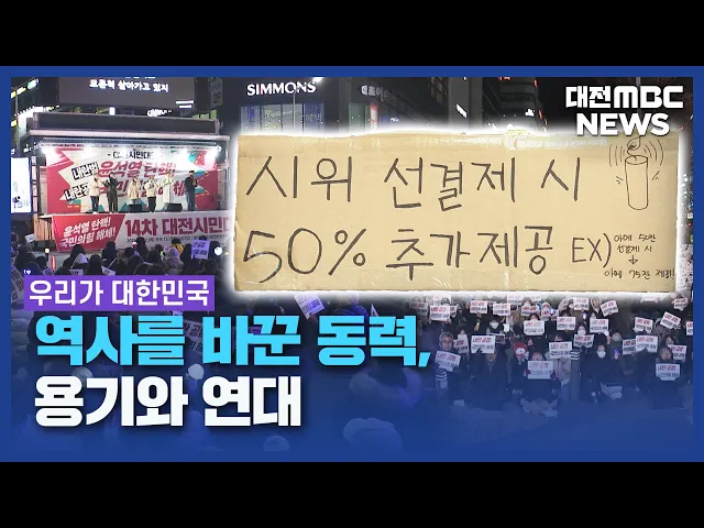 뉴스데스크 뉴스데스크뉴스투데이뉴스데스크 VOD(전체 다시보기)뉴스투데이 VOD(전체 다시보기)유튜브뉴스페이스북 뉴스카카오톡 뉴스인스타그램 뉴스 prev 2024.12.16 - 월요일 next "충청의 아들 내세웠지만"⋯문중도 지역도 '싸늘'/데스크 ◀ 앵 커 ▶부친의 고향이 논산인 탓에 대선 당시 '충청의 아들'을 내세워표심에 호소했던 윤석열 대통령.탄핵 가결 이후, 윤 대통령의 문중에서마저 착잡하다는 반응이 터져 나왔습니다.계엄 선포 하루 전,... 김성국 조기 대선 현실화?...충청 표심 '촉각'/데스크 ◀ 앵 커 ▶지난 주말 윤석열 대통령 탄핵소추안이 국회를 통과하면서 정치권의 시선은 이제다음 대통령 선거를 향해 있습니다.내년 상반기 조기 대선 가능성이 높아지면서 역대 선거의 풍향계 역할을 해 온... 문은선 역사를 바꾼 동력, 용기와 연대/데스크 ◀ 앵 커 ▶12.3 내란 사태를 맞아 대전MBC가 마련한 기획보도, '우리가 대한민국' 순서입니다.비상계엄 해제부터 탄핵안 가결까지.그 모든 역사적인 순간이 가능했던 건,전국 곳곳에서 묵묵히 각자의 역할... 윤소영 민주주의 지킨 시민들…"끝이 아닌 시작"/데스크 ◀ 앵 커 ▶매서운 추위에도 하루도 빠짐없이 거리로 나와 윤석열 대통령 탄핵안 가결을 이끌어 낸시민들.하지만 탄핵안 가결은 끝이 아닌 시작이라며 다시 거리로 나섰습니다.신속한 파면 결정과 끝까지 당... 박선진 목원대 시국선언 "헌재는 윤석열을 파면하라" 윤석열 대통령의 탄핵소추안이국회를 통과한 가운데 목원대 학생들이학내 중앙도서관 앞에서 시국선언을 발표하고"당장 윤석열을 파면하라"고 촉구했습니다.학생들은 "분노한 민심이 윤석열 정권의탄핵소... 문은선 지방의회서도 '비상계엄 규탄' 관련 국힘 의원 집단 반발 확산 대통령 탄핵 이후 지방의회가 추진 중인비상계엄 규탄 결의안에 대해 국민의힘 소속 의원들의 반발이 이어지고있습니다.충남도의회는 본회의에서 의회 차원의 12·3 비상계엄 사태 규탄 결의안을 채택하려 ... 조형찬 세종시의회, 국정 운영 정상화 촉구 결의안 채택 세종시의회가 윤석열 대통령의 탄핵안 가결에 따른 국정 공백 해소 등 신속한 국정 운영 정상화를 촉구하는 결의안을 채택했습니다.세종시의회는 또 일상 회복과 소상공인 피해를 막기 위해 정부와 국회가... 김윤미 청양 산란계 농장서 고병원성 AI⋯올해 들어 지역 3번째 서산과 세종에 이어 청양에서도고병원성 조류인플루엔자 항원이 검출돼 충남도가 긴급 방역에 나섰습니다.충남도는 청양군 비봉면의 산란계 농장에서 어제부터 집단 폐사 신고를 접수하고 정밀검사를 진행... 김지훈 천안 일대 멧돼지 4마리 출몰⋯2마리 포획 오늘 아침 8시쯤 천안시 청당동의 한 아파트 단지에서 멧돼지 4마리가 출몰해, 경찰과 소방당국이 수색 두 시간 만에 멧돼지 2마리를 포획했습니다.천안시 청당동과 쌍용동 등 일대에서 멧돼지를 봤다는 ... 김성국 아산 공장서 불...4시간 만에 진화 오늘 오전 11시 40분쯤,아산시 음봉면의 한 테이프 제조 공장에서 불이 나 소방당국이 진화장비 50대를 투입해 4시간 만에 큰 불길을 잡았습니다.인명피해는 없었지만 공장 한 동이 전소됐고,경찰과 소방... 윤소영 대전MBC '재소자 집단 폭행 사건' 목요언론인상 수상 대전MBC가 집중 보도한 '대전교도소 재소자 집단폭행·은폐 사건'이 목요언론인클럽의 이달의 기자상에 선정됐습니다.대전MBC 김태욱, 김성국, 윤소영, 신규호 기자가 보도한 이번 사건은 취재가 쉽지 않은... 김지훈 무역협회, 2024 대전·세종 수출 유공자 시상식 개최 제61회 무역의날을 맞아한국무역협회 대전세종충남지역본부가 대전 오노마 호텔에서 '2024 대전·세종 수출의 탑과 유공자 시상식'을 개최했습니다.이 자리에서 대전 28개 기업과 세종 4개 기업 등이 수출... 박선진