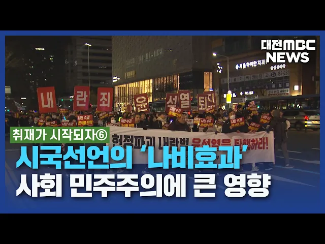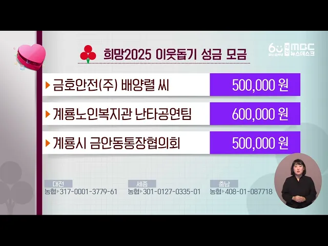 뉴스데스크 뉴스데스크뉴스투데이뉴스데스크 VOD(전체 다시보기)뉴스투데이 VOD(전체 다시보기)유튜브뉴스페이스북 뉴스카카오톡 뉴스인스타그램 뉴스 prev 2024.12.31 - 화요일 next 신정호 지방정원 보완 완료..내일부터 임시 개방 아산 신정호 지방정원이 안전시설과 안내판 설치 등 보완 작업을 마치고 새해 첫날인 내일부터 임시 개방됩니다.아산시는 지난달 신정호 지방정원의 중점 조성지 준공에 이어 자전거 도로 등에 안전시설을... 김윤미 대전시, 소상공인 아이돌봄 지원 사업 대전시가 KB금융그룹과 한국경제인협회와 함께, 생업 종사로 인한 양육 공백을 메우기 위해'소상공인 아이돌봄 지원' 사업을 추진합니다.지원 대상은 만 12살 이하 자녀가 있고대전에서 6개월 이상 사업장... 조형찬 새해 낮부터 비교적 포근...당분간 아침 영하권 새해 첫날인 내일, 대전과 세종·충남은 가끔 구름 많은 가운데, 평년 기온을 웃도는 포근한 겨울 날씨가 이어지겠습니다.내일 아침 최저기온은 영하 6도에서 영상 1도로 다소 춥겠지만, 한낮 기온은 8도에... 윤소영 희망2025 이웃돕기 성금 모금 다음은 저희 방송에 희망 2025 이웃돕기성금을 보내주신 분들입니다.청양축협 5십만 원서천경찰서 이미진 씨 6십만 원 서천군의회 5십만 원서천군 새마을부녀회 5십만 원천안시 김도곤 씨 5십만 원 ... 조형찬 태안 야산서 불..40분 만에 꺼져 오늘 오후 1시 반쯤 태안군 남면원청리에 있는 한 야산에서 불이 나 헬기 1대와 장비 16대, 인력 30명이 투입돼 40분 만에 꺼졌습니다.산림 당국은 야산 인근 주택에서 불이 시작돼 산으로 번진 것으로 보... 김성국 충청권 세계U대회 선수촌 세종 5-1생활권에 착공 오는 2027년 충청권 4개 시도가 공동 개최할하계세계대학경기대회를 위한 선수촌이세종시 5-1 생활권에서 착공했습니다.대회 조직위원회는 선수촌으로 쓰일 공동주택 조성 일정 단축을 위해우선 시공이 가... 김윤미 민주당, 아산시장 재선거 후보 오세현 단수 추천 민주당 공직선거 후보자 추천관리위원회가내년 4월 2일 치러지는 아산시장 재 선거 후보에 오세현 전 시장을 단수 추천했습다.또 대전시의원 유성구 제 2선거구에는 방진영 유성구갑 지역위 소상공인 위원... 김지훈 시국선언의 '나비효과'/데스크 ◀ 앵 커 ▶올 한 해 대전MBC 뉴스가 만들어낸 우리 사회의 의미 있는 변화를 살펴보는 연말 기획보도 '취재가 시작되자' 순서입니다.대전MBC는 충청권 첫 시국선언을 시작으로 대학가로 들불처럼 번진 정권... 김윤미 '아듀 2024' 엄숙한 분위기 속 마지막 해넘이/데스크 ◀ 앵 커 ▶올해 마지막 해도 저물면서 2024년이 얼마 남지 않았는데 다들 어떻게 보내셨나요?비상계엄의 충격이 채 가시기도 전에 여객기 참사가 발생하면서, 그 어느 때보다엄숙한 분위기 속에 마지막 해... 김성국 서산 운반선 전복 5명 사망·실종..."배가 기울어진다"/데스크 ◀ 앵 커 ▶어제 오후 서산 고파도 인근 해상에서 발생한운반선 전복 사고로 실종됐던 5명 중 2명이숨진 채 발견됐습니다.해경 등이 인력 수백 명과 선박 등을 총 동원해 수색작업을 벌이고 있는데, 중장비... 김광연 소멸 위기 농촌에 젊은 피를/데스크 ◀ 앵 커 ▶소멸 위기에 처한 농촌의 가장 어려운 현실중의 하나는 급속한 고령화와 이로 인한 인구 감소인데요. 농촌에 젊은 피를 수혈하는 이른바 스마트팜을 활용한 청년 농업인 양성 계획이 새해부터 본... 최기웅