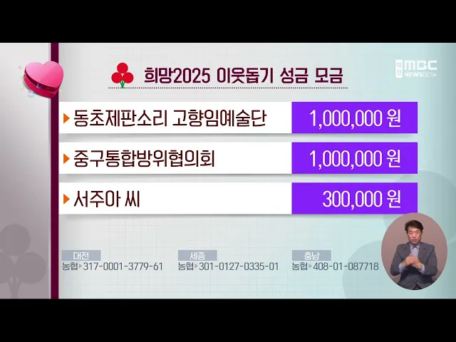 뉴스데스크 뉴스데스크뉴스투데이뉴스데스크 VOD(전체 다시보기)뉴스투데이 VOD(전체 다시보기)유튜브뉴스페이스북 뉴스카카오톡 뉴스인스타그램 뉴스 prev 2025.1.2 - 목요일 next 대전 중구, 민생회복 지원 87억 원 긴급 추경안 제출 김제선 대전 중구청장이 "민생 회복을 위한 87억 원의 규모의 긴급 추경 예산안을 중구의회에 제출하겠다"고 밝혔습니다.이번 추경안에는 소상공인 만 천여 명에게 공공요금 50만 원씩을 지원하는 예산 등... 김지훈 사용 기한 지난 의약품 저장·진열 대전 약국 3곳 적발 대전시 민생사법경찰과가 약국과 의약품 도매상 등에 대한 단속을 벌여사용 기한이 지난 일반의약품과 전문의약품 등 8종을 저장·진열한 약국 등 3곳을 약사법 위반으로 적발했습니다.적발된 의약품 가운... 김윤미 희망2025 이웃돕기 성금 모금 다음은 저희 방송에 희망 2025 이웃돕기성금을 보내주신 분들입니다.(주)아토테크놀로지 1백만 원(주) 에프에스 1백만 원 낭월석천들아파트 입주민 일동 5십만 원동초제판소리 고향임예술단 1백만 원중구... 김윤미 '수사 도중 또 불법 촬영' 고교생 항소심도 실형 불법 촬영 혐의로 검찰 수사를 받던 도중 또다시 불법 촬영을 저지른 10대 고등학생이 항소심에서도 실형을 선고받았습니다.대전MBC가 단독 보도로 알려지게 된 이번 사건에 대해 대전지법 형사항소 5-3부... 김성국 펜싱 국가대표 오상욱, 대전고향사랑기부제 최고액 기부 지난해 파리올림픽 금메달리스트인대전시청 펜싱팀 소속 오상욱 선수가대전에 고향사랑기부금 천만 원을 기부했습니다.이는 대전고향사랑기부제가 시행된 이후 최고 금액으로, 오 선수는 "한결같이 응원해... 박선진 우원식 국회의장, 대전현충원 홍범도 장군 묘역 참배 우원식 국회의장이 국립대전현충원 홍범도 장군 묘역을 참배한 뒤 "2025년은 힘센 희망이 대한민국을 다시 불러일으키는 한 해가 되기를 기대한다"고 밝혔습니다.앞서 홍범도 장군 기념사업회 이사장을 맡... 김지훈 서해호 실종자 탑승 덤프트럭 발견..주변 수색 집중 지난달 30일 서산 고파도 인근에서 발생한서해호 전복 사고로 4명이 숨지고 1명이 실종된 가운데, 해경이 마지막 실종자가 타고 있던 24톤 덤프트럭을 발견하고 주변 수색에 집중하고 있습니다.해경은 잠... 김성국 "풍요와 생명력"...수년 째 건강한 뱀 식구/데스크 ◀ 앵 커 ▶풍요와 생명력, 지혜를 의미하는 '푸른 뱀의 해'가 60년 만에 찾아왔습니다.그 뜻과 걸맞게 대전의 한 동물원에는 수년째 아픈 적 없이 건강하게 잘 자라고 있는 뱀 식구가 있다고 하는데요.을사... 김성국 수백 번의 헌혈..."봉사, 그 이상의 의미"/데스크 ◀ 앵 커 ▶우리 지역 선한 영향력을 소개하는기획보도 이음 순서입니다.올겨울, 독감과 코로나19의 동시 유행으로 헌혈의 집을 찾는 발길이 줄고 있는데요.혈액 수급이 위태로운 상황이지만, 그래도 꾸준히... 윤소영 추모로 새해 시작...시무식 연기·축소 잇따라/데스크 ◀ 앵 커 ▶제주항공 여객기 참사 희생자 추모 분위기 속에맞은 을사년, 정치권은 추모로 새해 업무를 시작했습니다.차분한 분위기 속에서 시무식을 축소해 진행하거나 일부 기관은 국가 애도 기간 이후로 ... 김광연 탄핵정국 속 2025 충청의 선택은?/데스크 ◀ 앵 커 ▶2025년 새해는 정치적으로 큰 변화가 예상됩니다.탄핵정국 속에 조기대선 가능성이 높아정치권은 우선 90일 앞으로 다가온4월 재보궐 선거를 주목하고 있는데요.특히 민심의 풍향계로 불리는충청... 문은선