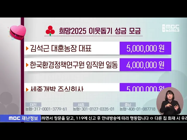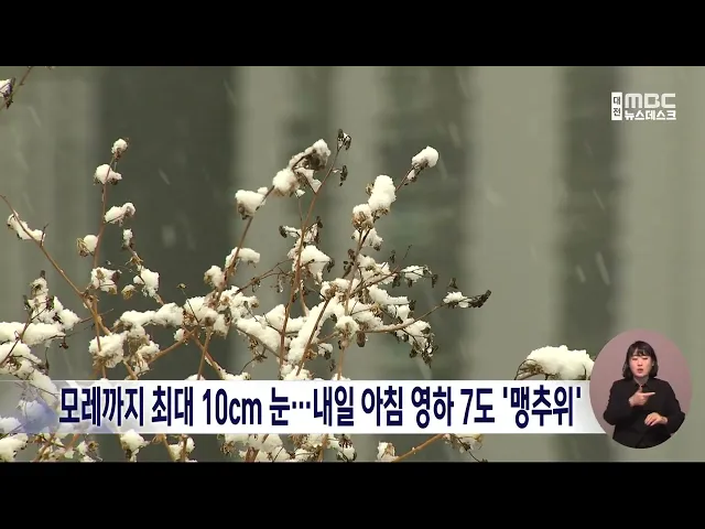 뉴스데스크 뉴스데스크뉴스투데이뉴스데스크 VOD(전체 다시보기)뉴스투데이 VOD(전체 다시보기)유튜브뉴스페이스북 뉴스카카오톡 뉴스인스타그램 뉴스 prev 2025.1.6 - 월요일 next 보호관찰소서 분신 시도 50대 징역 15년 구형 검찰이 지난 8월, 천안준법지원센터에서 보호관찰 업무에 불만을 품고 자신의 몸에 불을 질러, 18명을 다치게 하고 3억 원의 재산 피해를 낸 혐의로 기소된 50대에게 징역 15년을 구형했습니다. 검찰은 대... 김성국 대전통영고속도로서 차량 3대 추돌⋯3명 중·경상 오늘 오전 9시 20분쯤 금산군 추부면 대전통영고속도로 대전 방향 마달터널에서 8.5t 화물차가 앞서가던 승합차를 들이받는 등 차량 3대가 잇따라 추돌했습니다. 이 사고로 승합차가 옆으로 넘어지면서 80... 김성국 육군, 논산서 2025년 첫 현역병 1천5백 명 입영 행사 육군이 논산 육군훈련소에서 입영 장정 천5백여 명이 참석한 가운데 2025년 첫 현역병 입영 행사를 열었습니다. 훈련병들은 앞으로 6주 동안 정신 전력과 제식, 개인화기, 각개전투 등 다양한 교육훈련을 ... 김지훈 모레까지 최대 10cm 눈⋯내일 아침 영하 7도 '맹추위' 내일 대전과 세종, 충남에는 강한 추위와 함께 많은 눈이 내리겠습니다. 내일 오전부터 모레 밤까지 예상 적설량은 충남이 3에서 10cm, 대전과 세종이 1에서 5cm으로, 특히 내일 밤부터 시간당 3cm가 넘는... 윤소영 희망2025 이웃돕기 성금 모금 다음은 저희 방송에 희망 2025 이웃돕기 성금을 보내주신 분들입니다. 주식회사 고려소재연구소 김영숙 대표 500만 원 주식회사 금창 레미콘 500만 원 주식회사 켐 트로닉스 500만 원 산장가든 정해석 대... 김지훈 서산 캠핑장서 부자 참변⋯"가스 중독 추정"/데스크 ◀ 앵 커 ▶ 주말 나들이 겸 캠핑을 떠난 50대 아버지와 10대 아들이 텐트에서 숨진 채 발견됐습니다. 경찰은 이들 부자가 텐트 안에서 휴대용 난로를 쓰다 일산화탄소에 중독된 것으로 보고 있습니다. 윤소... 윤소영 '구조 중 순직' 산림청 공중진화대원 대전현충원 안장 설악산에서 낙상환자를 헬기로 구조하다 순직한 고 이영도 산림청 공중진화대원이 대전현충원에 안장됐습니다. 고 이영도 대원은 설악산 수렴동 계곡 인근에서 낙상환자를 구조한 뒤 헬기에 오르던 중 추... 김윤미 천안 실내 동물원서 9살 어린이, 악어에 손 물려 어제 오후 5시 50분쯤 천안시 불당동에 있는 한 실내 동물원에서 9살 어린이가 악어에게 물려 인근 병원으로 옮겨졌습니다. 천안서북소방서에 따르면, 사고 당시 피해 어린이는 50cm에서 1m가량 크기의 악... 김성국 청와대 복귀 대신 '세종'? "대통령실 완전 이전"/데스크 ◀ 앵 커 ▶ 윤석열 대통령 탄핵 국면에서 대통령 집무실 세종 이전이 뜨거운 관심거리로 떠올랐습니다.조기 대선이 치러질 경우, 용산 대통령실이 청와대로 복귀하는 대신, 제2 집무실이 아닌 완전한 형태... 김윤미 내란 여파에 치솟은 환율..밥상물가 '비상'/데스크 ◀ 앵 커 ▶ 12·3 내란 사태 여파로 환율이 고공행진을 하면서 소비자 물가 부담이 커지고 있습니다. 특히 지난해에 이어 과일, 채솟값이 크게 올라 새해에도 밥상 물가에 비상이 걸렸습니다. 문은선 기자가... 문은선 "대통령 수사 중단해야" 충청권 시도지사 주도/데스크 ◀ 앵 커 ▶ 이렇게 이장우 대전시장이 대전MBC에 날을 세운 건 국민의힘 시도지사협의회가 내놓은 입장문이 발단이었습니다. 이들은 윤석열 대통령에 대한 수사와 체포 영장을 중단해야 한다고 주장했는데... 김성국 "MBC에는 답을 안 하겠다"..대전시장 '입틀막' 언론관/데스크 ◀ 앵 커 ▶ "MBC에는 답을 안 하겠다. 왜곡할 텐데." 이장우 대전시장이 신년 기자회견에서 대전MBC 기자의 질문에 내놓은 답변입니다.12·3 내란 당시 자신의 행적을 집요하게 물은 대전MBC 취재진에게 불... 이승섭