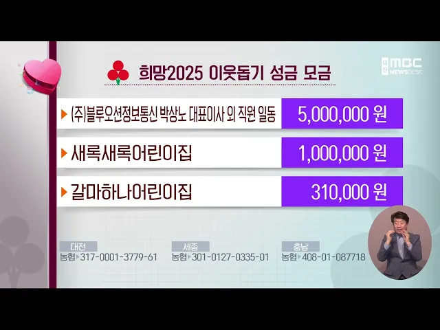 뉴스데스크 뉴스데스크뉴스투데이뉴스데스크 VOD(전체 다시보기)뉴스투데이 VOD(전체 다시보기)유튜브뉴스페이스북 뉴스카카오톡 뉴스인스타그램 뉴스 prev 2025.1.21 - 화요일 next 천안서 가상 자산 거래 미끼 43억 챙긴 20대 징역형 대전지법 천안지원 형사1부 전경호 부장판사가 천안 일대에서 가상 자산에 투자하면 최대 17%의 수익을 보장한다고 속여 지난 2021년 9월부터 두 달 동안 43억 원을 가로챈 혐의로 기소된 20대에게 징역 4... 김지훈 희망2025 이웃돕기 성금 모금 다음은 저희 방송에 희망 2025 이웃돕기 성금을 보내주신 분들입니다. 대전 가양2동 올레노래방 김창희 대표 50만 원 온양 여자중학교 3학년 학생 일동 40만 6천 원 대한 건설협회 대전광역시회 최문규 회... 조형찬 "안 보여도 공간 확인"⋯재난 구조 촉각 기술/데스크 ◀ 앵 커 ▶ 국내 연구팀이 시각이 아닌 촉각으로 공간 정보를 전달하는 기술을 개발했습니다. 앞이 잘 보이지 않는 대형 화재 등 각종 재난에서 드론이나 로봇의 원격 제어가 가능해서, 사람의 생명을 구하... 박선진 대통령 제2집무실·국회세종의사당 설계 본격화 세종시 대통령 제2 집무실과 국회 세종의사당 건립을 위한 설계 작업이 본격화합니다. 행정도시건설청은 이르면 다음 달 국회 세종의사당과 대통령 제2 집무실이 들어서는 세종시 세종동 일대 210만㎡에 ... 김지훈 대전·충남 연 매출 1억 미만 소상공인 50만 원 지원 대전시와 충남도가 경제 위기를 극복하기 위해 연 매출 1억 원 미만 소상공인 21만 3천 명에게 50만 원씩을 지원합니다. 대전시는 431억 원을 투입해 해당 소상공인 8만 6천 명에게 3월 말까지 50만 원씩 ... 김지훈 "설 대목 노리고⋯" 원산지 위반 '수두룩'/데스크 ◀ 앵 커 ▶ 설 대목을 노린 원산지 가짜 표시가 기승을 부리고 있습니다. 보름 동안 전국에서 3백 건 넘게 적발됐는데 설 연휴 직전까지 단속이 계속됩니다. 원산지 단속 현장을, 김광연 기자가 동행했습니... 김광연 '명절' 업무추진비로 수천 만 원...공개 자료는 부실/데스크 ◀ 앵 커 ▶ 공직 사회에서 업무추진비를 연말에 쌈짓돈처럼 사용하는 관행, 저희가 앞서 보도해 드렸는데요. 명절을 앞두고도 다르지 않았습니다. 많은 단체장이 명절 선물을 사기 위해 천만 원이 넘는 업... 윤소영 곳곳에 초미세먼지 주의보..모레까지 탁해 대전 동부와 세종, 충남 북부와 동남부 권역에 초미세먼지 주의보가 내려진 가운데 당분간 공기질이 탁한 날이 이어지겠습니다. 오늘 오전 6시부터 비상저감조치를 발령해 공공 2부제 등을 시행하고 있는 ... 김광연 세종시장 "윤 대통령 죄인처럼 예단하면 안 돼" 국민의힘 소속 최민호 세종시장이 "윤석열 대통령 죄인처럼 예단하는 행태들이 난무해선 안 된다"고 주장했습니다. 최 시장은 자신의 sns 글에서 "무죄 추정의 원칙에 의해 죄가 확정되기 전까지는 인권뿐... 김지훈 '입틀막 논란' 대전시장⋯"언론과 소통하겠다"/데스크 ◀ 앵 커 ▶ "왜곡 보도하는 MBC에 답을 하지 않겠다" 이른바 'MBC 입틀막' 파문을 일으킨 이장우 대전시장이 보름 만에 "언론과 소통을 강화하겠다"고 공식 입장을 내놨습니다.하지만, 무엇이 왜곡 보도인... 김성국