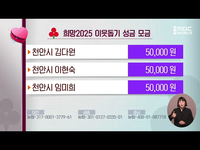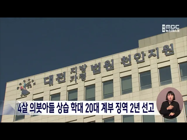 뉴스데스크 뉴스데스크뉴스투데이뉴스데스크 VOD(전체 다시보기)뉴스투데이 VOD(전체 다시보기)유튜브뉴스페이스북 뉴스카카오톡 뉴스인스타그램 뉴스 prev 2025.1.23 - 목요일 next 충남도, 올해 4조 원대 공공기관 공사·용역 발주 올해 충남도와 시·군, 도교육청 등 도내 공공기관이 발주하는 공사와 용역이 4조 원 규모에 달할 전망입니다. 충남도에 따르면 도내 공공기관이 발주하는 1억 원 이상 건설공사와 천만 원 이상 용역 사업... 최기웅 천안 대체 소각시설 건립 갈등 해결 실마리 찾아 천안 대체 소각시설 설치를 놓고 3년여 동안 지속된 천안시와 아산시 간 갈등이 해결의 실마리를 찾았습니다. 충남도와 천안시, 아산시는 '천안시 대체 소각시설 상생협력' 협약을 맺고 대체시설의 성공적... 최기웅 4살 의붓아들 학대한 20대 계부에 징역 2년 선고 대전지법 천안지원 형사5단독 류봉근 부장판사가 발달장애가 있는 4살 의붓아들을 상습적으로 학대한 혐의로 기소된 20대 계부에게 징역 2년 등을 선고했습니다. 피고인은 지난해 9월부터 두 달 동안 잠을... 김광연 세종·대전서 차량 상가 돌진 사고 잇따라⋯2명 다쳐 어젯밤 8시 45분쯤 세종시 아름동에서 60대 운전자가 몰던 1t 화물차가 지하주차장을 빠져나오다, 상가 1층 약국으로 돌진해 유리창과 내부가 파손됐습니다. 사고 당시 약국은 영업이 끝나 다행히 인명 피... 김성국 시청자위 "권력 감시 보도 효과적⋯훈훈한 지역 소식 호응 대전MBC에서 열린 1월 시청자위원회에서 위원들은 대통령 탄핵 정국과 내란 동조 세력에 대해 지역의 시각에서 집중적으로 보도한 점을 높이 평가했습니다. 또 혼란한 정국 속에서도 오늘M 등을 통해 소개... 김지훈 '교도소 재소자 집단 폭행' 대전MBC, 참글상 수상 지난해 하반기 '대전교도소 재소자 집단 폭행 은폐 사건'을 집중 보도한 대전MBC가 대전·세종·충남 기자협회가 주관하는 제17회 참글상을 수상했습니다. 심사위원들은 "취재가 어려운 교도소를 상대로 끝... 김성국 희망2025 이웃돕기 성금 모금 다음은 저희 방송에 희망 2025 이웃돕기 성금을 보내주신 분들입니다. (사)충남장애인부모회천안지회 강서경 5만 원 천안시 이정선 5만 원 천안시 김주식 5만 원 천안시 김다원 5만 원 천안시 이현숙 5만 ... 조형찬 황선홍 감독 "우승 도전의 원년"/데스크 ◀ 앵 커 ▶ K리그 개막을 앞둔 대전하나시티즌의 태국 전지훈련을 취재한 대전MBC의 연속 보도, 두 번째 순서입니다. 황선홍 감독은 지난해 여름, 2부 리그 강등 위기에 놓인 대전을 맡아 잔류에 성공했습... 이승섭 수도권 전철 천안 '청수역' 신설 청신호.."경제성 확인" 수도권 전철 천안역과 청수지구 등을 잇는 청수역 신설의 경제성이 확인돼 사업에 청신호가 켜졌습니다. 천안시는 청수역 신설 사업에 대한 사전타당성 조사 용역 결과, 비용 대비 편익이 1.0 이상으로 나... 김윤미 서해선 KTX 예타 통과...홍성서 서울 용산까지 45분 오는 2031년에는 KTX를 타고 충남 홍성역에서 서울 용산역까지 45분 만에 이동할 수 있게 됐습니다. 충남도는 서해선 복선전철과 경부고속선을 잇는 '서해선 KTX 연결 사업'이 기획재정부 예비 타당성 조... 최기웅 마음도 전하고 쌀 소비도 늘리고..쌀로 빚은 설 선물/데스크 ◀ 앵 커 ▶ 설 명절을 앞두고 설 선물 준비하는 분들 많으시죠. 100% 지역에서 생산된 좋은 쌀만 사용해 품질을 높이고 농민들도 살리는 전통주와 떡을 준비해 보시는 건 어떨까요? 김성국 기자가 소개해 ... 김성국 "미세먼지 걱정 없어요" 공공형 실내놀이터 확대/데스크 ◀ 앵 커 ▶ 요즘처럼 미세먼지가 기승을 부릴 때는 아이들이 마음껏 야외나 놀이터에서 뛰어놀기도 어려운데요. 아동이 전체 인구의 22%를 차지할 정도로 전국에서 아동 비율이 가장 높은 세종시에서는 미... 김윤미 '초미세먼지 주의보' 해제⋯대기질 회복 대전과 세종, 충남 지역의 대기질이 점차 회복하면서, 나흘째 기승을 부렸던 '초미세먼지 주의보'가 모두 해제됐습니다. 오늘 오후부터 대기 순환이 활발해지면서 서산과 아산, 천안 등 충남 일부 지역을 ... 김성국 허태정 "대전·충남 행정 통합 공론화 과정 필요" 전 대전시장인 허태정 더민주전국혁신회의 공동상임대표가 대전시청에서 기자들과 만나 대전과 충남의 행정 통합은 공론화 과정이 필요하다고 밝혔습니다. 허 대표는 시도시자의 합의만으로 행정을 통합해... 이승섭 행정통합민관협 "경제과학수도 대전충남특별시 추진" 대전·충남 행정통합 민관협의체가 새로운 통합 자치단체의 미래 비전으로 '대한민국 경제과학 수도 대전충남특별시'를 제시했습니다. '경제과학 수도 대전충남특별시'는 대전의 첨단 과학기술과 충남의 산... 최기웅 정당 현수막, 이제는 공해 수준⋯"제도 개선 시급"/데스크 ◀ 앵 커 ▶ 최근 들어, 거리마다 자극적인 문구가 적힌 정당 현수막이 나붙고 있습니다. 심지어 자유당의 폭정을 끝낸 4·19 혁명을 이번 비상계엄과 동일시하는 글귀마저 등장했는데요. 탄핵 정국 속 설 민... 윤소영