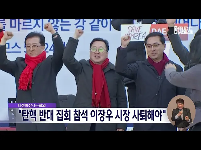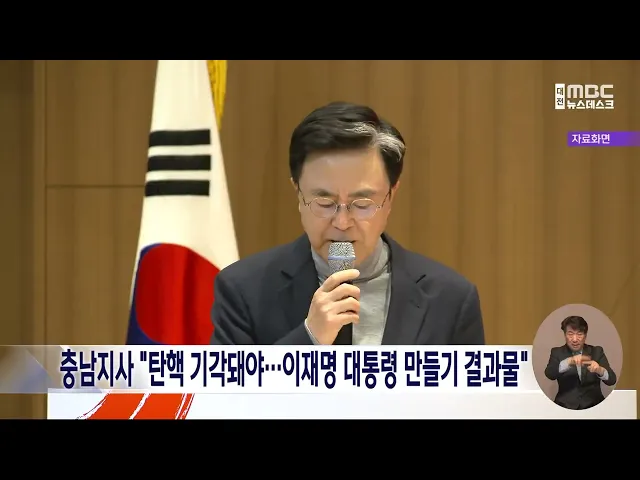 뉴스데스크 뉴스데스크뉴스투데이뉴스데스크 VOD(전체 다시보기)뉴스투데이 VOD(전체 다시보기)유튜브뉴스페이스북 뉴스카카오톡 뉴스인스타그램 뉴스 prev 2025.2.26 - 수요일 next '정전 피해' 서산 LG화학·롯데케미칼 이틀째 가동 중단 어제 오전 정전 피해를 본서산 대산공단 내 LG화학과 롯데케미칼의공장 가동 중단이 이틀째 이어지고 있습니다.해당 업체들은 어제 생산 공정에 투입된 원료를 태우는 작업 등을 진행한 데 이어 오늘은 공... 김지훈 당진 교차로서 차량 3대 잇따라 충돌...3명 사상 오늘 오후 2시 20분쯤, 당진시 고대면의 한 교차로에서 화물차와 SUV 등 차량 3대가 잇따라 부딪히는 사고가 났습니다.이 사고로 60대 화물차 운전자가 숨졌고,나머지 차량 운전자 등 2명이 다쳐 병원으... 윤소영 대전 제약회사서 불..직원 30여 명 긴급 대피 오늘 오후 1시 20분쯤, 대전시 탑립동의 한 제약회사에서 불이 나 약 40분 만에 꺼졌습니다.건물에 있던 직원 30여 명이 긴급 대피해 다행히 인명 피해는 없었습니다.경찰과 소방당국은 정확한 화재 원인... 윤소영 황사 영향으로 대기질 '나쁨'..당분간 악화 전망 어제 오전 중국에서 발원한 황사의 영향으로 오늘 대전과 세종, 충남의 미세먼지 농도가 한때 '나쁨' 수준을 기록했습니다.내일 오전에는 대기질이 '보통' 수준을 유지하겠지만, 오후부터 미세먼지가 유입... 윤소영 충남지사 "탄핵 기각돼야..이재명 대통령 만들기 결과물" 김태흠 충남지사가 윤석열 대통령 탄핵과 관련해 "계엄에 반대했지만 탄핵에 대해서도 반대한다"는 입장을 밝혔습니다.김 지사는 자신의 SNS에서 "이번 탄핵 과정이 공정성과 정당성을 잃어기각돼야 마땅... 김지훈 대전비상시국회의 "탄핵 반대 집회 참석 대전시장 사퇴해야" 지난 주말 대전에서 열린 탄핵 반대 집회에 참석해 단상에 오른 이장우 대전시장 등에 대한 사퇴 요구가 거세지고 있습니다.대전비상시국회의는 성명을 내고"이장우 시장과 국민의힘 소속 구청장들이 내란... 김윤미 경찰, '하늘 양 살해' 교사에 사이코패스 검사 검토 고 김하늘 양을 살해한 40대 교사가 '반사회적 인격장애'에 해당할 가능성이 제기되면서, 경찰이 사이코패스 검사를 진행하는 방안을 검토하고 있습니다.사건을 수사 중인 대전서부경찰서는 아직 검사 실... 윤소영 현대엔지니어링 대표, 고속도로 붕괴 사고 공식 사과 10명의 사상자를 낸 세종포천 고속도로 붕괴 사고와 관련해, 시공사인 현대엔지니어링 주우정 대표이사가 "필요한 조치에 최선을 다하겠다"고 공식 입장을 밝혔습니다.주 대표이사는 입장문을 통해 "유가... 윤소영 일본어 걷어낸 '한글 토지대장' 첫선/데스크 ◀ 앵 커 ▶올해는 광복 80주년이지만,우리 사회와 문화 곳곳에는여전히 일제 잔재가 남아있는데요.삼일절을 앞두고 충남에서 일본 연호와 일본식 한자 등을 모두 걷어낸 '한글 토지대장'이 처음으로 완성됐... 최기웅 세종연구원 독립..세종시-시의회 2라운드?/데스크 ◀ 앵 커 ▶세종시 자체 싱크탱크인종합정책연구기관 설립을 놓고시와 시의회 사이 갈등이 재연되면서여론전으로 발전하는 모양새입니다.시와 의회가 번번이 정치 논리에 기대 감정 대립을 하는 것처럼 비치... 문은선 '위험천만' 인도 질주에 역주행..."단속 피하려고.."/데스크 ◀ 앵 커 ▶대전 도심에서 인도를 질주하고역주행까지 일삼으며 아찔한 도주극을 벌인 50대 운전자가 경찰에 붙잡혔습니다.면허정지 수준으로 술에 취한 상태에서6km를 운전하다 음주단속을 피하려고 벌인 ... 김광연 "또 무너질까 무서워요" 주민들 불안·불편/데스크 ◀ 앵 커 ▶10명의 사상자를 낸 고속도로 교량 붕괴 사고, 하루가 지났지만 주민들은 여전히 불안합니다.크레인 등이 50m 높이 교각에 걸쳐 있는 데다교각 역시 사고 충격을 받은 만큼 추가 붕괴를 걱정하는... 김성국