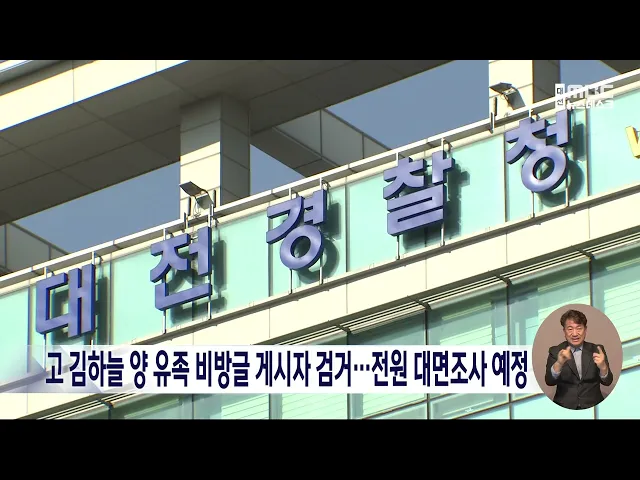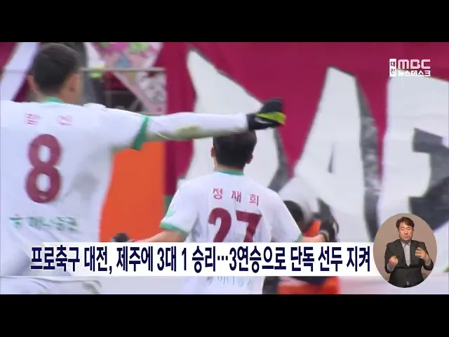 뉴스데스크 뉴스데스크뉴스투데이뉴스데스크 VOD(전체 다시보기)뉴스투데이 VOD(전체 다시보기)유튜브뉴스페이스북 뉴스카카오톡 뉴스인스타그램 뉴스 prev 2025.3.15 - 토요일 next 충남농업기술원 '벼 직파재배 기술' 확산 총력 탄소 저감과 노동력 절감에 유용한벼 직파 재배기술이 확산하고 있습니다.충남도 농업기술원 조사 결과지난해 충남 지역의 벼 직파재배 면적은전년 대비 56% 늘어난 1,645.3ha로농가소득도 10% 이상 향상... 조형찬 공주 '사백 년 인절미 축제' 개막 인절미의 유래가 전해지는 공주시에서'사백 년 인절미 축제'가 공주 산성시장 문화공원 일대에서 오늘 개막해 내일까지 계속됩니다.축제에서는 문화 공연과떡메치기, 인절미 굽기 체험 등다양한 프로그램... 조형찬 프로축구 대전, 3연승 달리며 단독 선두 지켜 프로축구 K리그1 대전하나시티즌이 3연승을 달리며 단독 선두를 지켰습니다.대전은 오늘 제주월드컵경기장에서 열리 제주와의 경기에서 주민규 선제골 이후 동점골 내줬지만, 경기 종료 직전 정재희 결승... 조형찬 '교실 피살' 김하늘 양 유족 악플러 고소…경찰, 5건 수사 중 교실에서 피습된 고 김하늘 양의 유족이 인터넷에 악성 댓글을 단 누리꾼을 경찰에 고소해, 경찰이 수사에 나섰습니다. 대전경찰청은 지난달부터 김 양 유가족에게 악의적인 내용의 게시글을 올린 게시자... 조형찬 부여·서천서 또 산불..건조함 속 불씨 각별 유의 오늘 오전 10시 반쯤 부여군 임천면 구교리의 야산에서 불이나 28분 만에 꺼졌고,어제 저녁 7시 20분쯤 서천군 마서면신포리에서도 산불이 발생해 진화차량과 인력이 투입돼 1시간 10분 만에 진화했습니다... 조형찬 4.2 재·보궐선거 충남·대전지역 후보자 등록 마감, 평균 3.3대1 경쟁률 그제부터 이틀간 4.2 재,보궐선거의 후보자 등록을 진행한 결과, 대전과 충남 3개 선거구에서 10명이 등록해, 평균 3.3대 1의 경쟁률을 보였습니다. 각 선관위에 따르면, 박경귀 시장의 낙마로 치러지는 ... 조형찬 "탄핵 촉구" 총결집...선고까지 농성 이어가/데스크 ◀ 앵 커 ▶윤석열 대통령의 탄핵 심판 선고가 다음 주로 미뤄지면서 오늘 서울 광화문에는 전국 각지에서 사람들이 결집했습니다.우리 지역에서도 많은 사람들이 상경해신속한 파면을 촉구하는 목소리를 높... 김광연