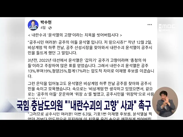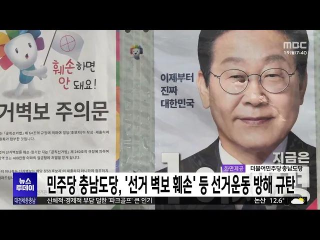 뉴스데스크 뉴스데스크뉴스투데이뉴스데스크 VOD(전체 다시보기)뉴스투데이 VOD(전체 다시보기)유튜브뉴스페이스북 뉴스카카오톡 뉴스인스타그램 뉴스 prev 2025.5.19 - 월요일 next 민주당 충남도당, 선거운동 방해 강력 규탄 더불어민주당 충남도당이, 최근 충남 곳곳에서 당 선거 사무원에 대한 위협과 선거 벽보 훼손이 잇따르고 있다며, 강력 규탄하고 나섰습니다. 민주당 충남도당은 논평을 내고 예산에서 당 선거운동원에게 ... 박선진 세종시·세종시의회, 공공기관장 인사청문회 도입 합의 인사청문회 도입을 둘러싸고 첨예한 갈등을 빚은 세종시와 세종시의회가 인사청문회 도입에 전격 합의했습니다.최민호 세종시장은 임채성 시의회 의장과의 면담 자리에서 시 산하 기관장에 대한 인사청문... 김윤미 "초등생 살해하고도 연금 절반 받아"..논란의 공무원연금법 지난 2월 대전에서 초등생을 살해한 교사 명재완이 공무원 연금 절반을 받을 수 있게 되면서 공무원연금법에 대한 논란이 커지고 있습니다.대전시교육청은 최근 징계위를 열어 명 씨에게 최고 수준의 징계... 김지훈 김태흠 충남지사 "대전·충남 행정통합 속도…8월 법안 제출" 김태흠 충남지사가 대전·충남의 행정통합과 관련해 공청회 개최와 특별법안 제출 등 속도감 있는 행정 절차를 주문하고 나섰습니다. 김 지사는 오늘 도청에서 실국장들과의 회의에서 "대전충남 행정통합 ... 최기웅 김종민, 원내 7당 의원 참여한 '개헌절차법' 대표발의 국회 원내 7당 소속 의원들이 모두 참여한 '초당적 개헌절차법'이 22대 국회에서 처음 발의됐습니다.세종시 갑이 지역구인 무소속 김종민 의원이 대표발의한 법안은 헌법개정절차법과 국회법 등 3종 패키... 김윤미 충남 야4당·광장대선연대, 이재명 후보 지지 선언 더불어민주당과 조국혁신당,진보당과 기본소득당 등 충남 지역 4개 야당과진보 인사들이 모인 광장대선충남연대가천안시청에서 기자회견을 열어 민주당 이재명 후보의 지지를 선언했습니다.이들은 사회대... 이승섭 국민의힘 충남도의원 "'내란수괴의 고향' 박수현 사과해야" 국민의힘 소속 충남도의원들이 충남도청에서 기자회견을 열고자신의 SNS에 '공주시는 내란수괴의 고향'이라고 적은 더불어민주당 박수현 의원을 비판했습니다.의원들은 박 의원이 자신의 지역구를 '내란수... 이승섭 대선 선거벽보 훼손 잇따라..10여 건 접수 제21대 대통령 선거가 보름 앞으로 다가온가운데 대전과 세종, 충남에서 대선 후보들의선거벽보 훼손이 잇따르고 있습니다.대전과 세종, 충남선거관리위원회는지난 15일, 선거벽보를 게시하고 지금까지대... 이승섭 세종서 김문수 유세 차량서 '이재명 홍보'..황당 실수 잇따라 세종시에서 국민의힘 김문수 대선후보유세차에서 이재명 더불어민주당 후보의 출정식 영상이 노출된 사실이 뒤늦게 알려졌습니다.세종시 온라인 커뮤니티에 따르면, 공식 선거운동 첫날이었던 지난 12일세... 문은선 이재명, 제2중앙경찰학교 '아산·남원 동시 공약' 논란 이재명 더불어민주당 대선 후보의제2중앙경찰학교 유치 지원 공약이아산과 전북 남원에 똑같이 포함돼 있어중복 공약 논란이 일고 있습니다.개혁신당 이준석 후보는 어제대선 후보 TV 토론회에서 "민주당... 문은선 존폐 위기의 '지역 방송'‥"정책적 지원 절실"/데스크 ◀ 앵 커 ▶지역 방송은 지역 여론 형성의 장이자 지역 균형 발전의 핵심 역할을 담당하고 있습니다.하지만 방송 산업의 침체가 길어지면서 특히 지역 방송들이 큰 영향을 받고 있는데요.지역 소멸 대응을 ... 폰세 18K 대기록..이글스·시티즌 모두 '흐림'/데스크 ◀ 앵 커 ▶우리 지역의 스포츠 소식을 전해드리는 스포츠 톡톡 시간입니다.프로야구 한화이글스의 '에이스' 코디 폰세가, 한 경기에서 18개의 삼진을 잡아내며,한국 프로야구의 전설 선동열과어깨를 나란히... 하천 뒤덮은 하루살이 떼..원인은 하천 준설?/데스크 ◀ 앵 커 ▶요즘 대전 하천변을 지나다 보면예년보다 벌레떼가 부쩍 늘면서,마스크와 안경 없이는 걷기 힘들 정도라는 말까지 나옵니다.일각에선 대전시의 3대 하천 준설 이후생태계에 이상 조짐이 나타난 ... 윤소영 정부세종청사 새판짜기? '부처 이전' 공약 후끈/데스크 ◀ 앵 커 ▶이번 대선에서는 해양수산부 부산 이전 등 정부 부처의 이전 공약도 뜨겁습니다.아직 서울에 남아 있는 각종 행정기관을추가로 세종시로 옮기자는 공약도잇따라 나오고 있는데요.세종시를 행정수... 김윤미 7개월 새 2명 사망..시의회 '충격'/데스크 ◀ 앵 커 ▶이용기 대전시의원이 숨진 채 발견됐습니다.이 의원은 자신의 신변을 비관한 것으로알려졌는데요.불과 7개월 사이에 현직 시의원 2명이 숨지자대전시의회는 충격에 휩싸였습니다.이승섭 기자입니... 이승섭