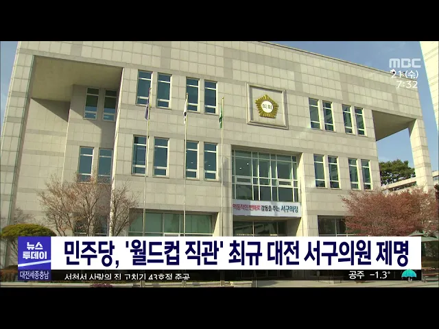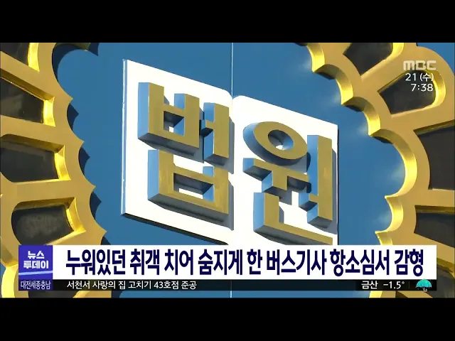 뉴스투데이 뉴스데스크뉴스투데이뉴스데스크 VOD(전체 다시보기)뉴스투데이 VOD(전체 다시보기)유튜브뉴스페이스북 뉴스카카오톡 뉴스인스타그램 뉴스 prev 2022.12.21 - 수요일 next 트램 돌고 돌아 원점.. 무가선 방식 재추진/투데이 ◀앵커▶ 마치 쳇바퀴 돌 듯 사업이 돌고 돌아 다시 원점입니다. 대전 도시철도 2호선 트램 얘기인데요, 대전시가 민선 7기 때 유·무가선 혼용방식으로 결정했던 트램 급전 방식을 전 구간 무가선으로 다시... 김태욱 코레일, 설 승차권 예매 시작…오늘 경부선 등 한국철도공사의 내년 설 승차권 예매가 오는 22일까지 온라인과 전화 등 100% 비대면 방식으로 이뤄집니다. 배정 좌석의 10%에 해당하는 고령자와 장애인 등을 대상으로 한 승차권 예매는 어제(20) 진행됐... 문은선 민주당 대전시당, 회기 중 카타르행 최규 의원 제명 더불어민주당 대전시당이 정례회 기간 중 월드컵 관람을 위해 카타르에 다녀와 물의를 빚은 대전 서구의회 최규 의원에 대해 제명을 의결했습니다. 민주당 윤리 심판원은 최 의원이 선출직 공직자 신분을 ... 김태욱 공무원 폭행 잇따라.. 여전한 악성민/투데이 ◀앵커▶한 민원인이 동 행정복지센터에 찾아가 소리를 지르며 난동을 피우다, 급기야 공무원을 폭행했습니다. 한 해동안 이런 악성민원이 2만 건 넘게 일어나는데, 뚜렷한 대책이 없어서 근절이 되지 않고 ... 문은선 충남도, 민원 담당 공무원 보호 위한 조례 제정 추진 최근 천안에서 공무원이 민원인에게 폭행당한 사건이 발생한 가운데 충남도가 민원 담당 공무원을 보호하기 위한 조례 제정을 추진하고 있습니다. 도는 내년 2월에 조례안이 통과되면 민원인으로부터 위법... 이승섭 세종시, 내년 모든 부부에 산후도우미·난임시술 지원 세종시 보건소가 저출산 극복을 위해 내년부터 산후도우미 서비스와 난임 시술 지원대상을 소득 수준과 관계없이 지역 내 모든 산모와 난임 부부로 확대합니다. 산후도우미 서비스 신청 기간은 출산 예정... 김태욱 승마장 탈출한 말과 '쾅'..3명 중·경상/투데이 ◀앵커▶ 공주의 한 도로에 말 한 마리가 갑자기 나타나, 달려오던 차량과 부딪혀 3명이 다치고 뒤따라오던 차들이 잇달아 부딪히는 사고가 발생했습니다. 도로 뛰어든 말은 인근 사설 승마장에서 탈출한 것... 문은선 누워있던 취객 치어 숨지게 한 버스기사 항소심 감형 술에 취해 도로에 누워있던 60대를 치어 숨지게 해 1심에서 실형을 받은 시내버스 운전기사가 항소심에서 집행유예로 풀려났습니다. 대전지법 형사 항소1부는 버스정류장 앞 2차로에서 우회전하다 술에 취... 박선진 상병헌 세종시의장 "의장 불신임안, 상황 지켜보며 결 동료 남성 의원 성추행 의혹으로 경찰 수사를 받고 있는 상병헌 세종시의회 의장이 자신에 대한 불신임안 제출과 관련해 상황을 지켜보며 결정하겠다고 밝혔습니다. 시의원 불신임안 처리 권한은 의장이 ... 문은선 국내 1호 '하이브리드 선박' 진수‥/투데이 ◀앵커▶ 우리나라 선박 대부분은 벙커C유나 경유를 연료로 써서 대기오염을 일으키고 있는데요. 하이브리드 자동차처럼 전기와 디젤 기관을 동시에 사용하는 선박이 우리나라에서 처음으로 건조돼 충남에서... 문은선 서천서 '사랑의 집 고치기' 43호점 준공 대전MBC와 대한전문건설협회 세종시·충남도회가 함께 하는 사랑의 집 고치기 43호점 준공식이 서천에 있는 송은섭 씨 집에서 있었습니다. 고령에 거동이 불편한 기초생활수급자인 송 씨는 재래식 화장실과... 문은선 '선심성 논란' 대전 대덕구 어린이 용돈수당 폐지 선심성 논란이 있었던 대전 대덕구 어린이 용돈수당이 1년 만에 폐지됩니다. 구의회를 통과한 대전 대덕구 내년도 본예산안에는 어린이 용돈수당 지급에 필요한 10억 원가량이 전혀 반영되지 않았습니다. ... 문은선 세종시, 23일부터 장애인 택시 누리콜 24시간 운영 세종시가 교통약자의 이동권 보장을 확대하기 위해 장애인 콜택시 '누리콜' 운행 시간을 오는 23일부터 24시간으로 확대합니다. 현재 누리콜은 오전 6시부터 자정까지 운행하는데, 자정 이후 누리콜을 이... 김태욱 충남대·한밭대 오는 28일 통합논의 선포식 한밭대 최고 심의기관인 대학평의원회에서 통합 논의 안건이 가결됨에 따라 충남대와 한밭대가 오는 28일 선포식을 갖고 통합 논의 시작을 공식화합니다. 두 대학은 선포식 이후 본격적인 실무회의를 진행... 박선진 `태안 유류피해 극복 기록물` 세계기록유산 인증서 전달 유네스코 세계기록유산 아시아태평양 지역 목록에 등재된 태안 유류 피해 극복 기록물 인증서가 충남도와 태안군 등 기록물 소유 기관과 개인에게 전달됐습니다. 태안 유류피해 극복 기록물은 지난 2007년... 문은선 충남도, 장애인 복지 향상 위해 5년 동안 2조 원 투입 충남도가 내년부터 5년 동안 장애인 복지를 향상하기 위해 2조 원 넘게 투입해 58개 정책을 추진합니다. 도는 중증 장애인의 긴급 돌봄 서비스를 확대하고, 시설 밖에 있는 장애인에게 정착금을 지원하는 ... 이승섭 산림청, 내포문화숲길 등 6개 국가숲길 난이도 공개 산림청이 내포문화숲길 등 지난해 지정된 국가숲길 6곳의 난이도 조사 데