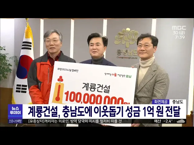 뉴스투데이 뉴스데스크뉴스투데이뉴스데스크 VOD(전체 다시보기)뉴스투데이 VOD(전체 다시보기)유튜브뉴스페이스북 뉴스카카오톡 뉴스인스타그램 뉴스 prev 2022.12.30 - 금요일 next 10년간 유지 '대형마트 의무휴업'..평일로?/투데이 ◀앵커▶ 지난 7월 대형마트 의무휴업 폐지를 검토한다는 정부 발표가 나와, 중소상인과 대형마트 노동자들이 크게 반발했었죠. 그런데 최근 대구시 등 일부 지자체가 의무휴업일을 평일로 옮기는 정책을 ... 박선진 대전 동구의회 예산안 확정.. 준예산 사태 모면 내년 축제 관련 예산 5억여 원을 놓고 여·야 의원들 간 파행을 거듭해 온 대전 동구 의회가 그제임시회 본회의를 열고 내년도 예산안 6,789억 원을 최종 확정했습니다. 대전 동구 의회는 앞서 집행부가 제... 김태욱 윤 대통령, 북한 무인기 도발에 국방과학연구소 방문 최근 북한의 무인기 침투 도발이 잇따른 가운데 윤석열 대통령이 어제 오전 대전 국방과학연구소를 방문해 우리 군의 감시·정찰 요격 시스템을 포함한 국내 무기체계 개발 현황을 점검했습니다. 국방부장... 김태욱 대전시, 시 주관 연말연시 행사 간소화.. 타종식 없어 대전시가 해마다 시 주관으로 진행하던 각종 연말연시 행사를 올해는 차분하고 간소하게 추진합니다. 이에 따라 코로나 확산 이전인 지난 2020년까지 새해 첫날 0시를 기해 대전시청 남문광장에서 진행하... 김태욱 충남도, 잇단 AI 발생에 방역 강화 최근 예산에서 도내 세 번째로 고병원성 조류인플루엔자가 발생한 가운데 충남도가 방역 강화에 나섰습니다. 도는 소독 차량 50여 대를 동원해 철새도래지와 AI 발생지 주변, 산란계 농가 밀집 단지 등의 ... 이승섭 한밭대, 국방핵심기술 특화연구 주관기관 선정…6년간 한밭대학교 표성민 정보통신공학과 교수 연구팀이 국방 핵심 기술 기초연구 특화연구실 과제 공모에서 최종 우선협상대상자로 선정됐습니다. 이에 따라 한밭대는 `우주 계층 지능통신망 특화연구`의 주관 ... 최기웅 우주시대 주역 대전.. 과제는?/투데이 ◀앵커▶ 지난 한해를 키워드로 정리하는 기획뉴스, 오늘은 대한민국 우주시대 개막, 그리고 그 주역 '대전 대덕특구'입니다. 2022년은 한국형 발사체 누리호부터, 다누리의 달 궤도진입 성공까지 우주강국... 김태욱 대전 유성구, 내년 모든 출산가정에 30만 원 지급 대전 유성구가 셋째 이상 아이를 낳는 가정에만 지원하는 출산장려금을 내년부터 아이를 낳는 모든 가정에 30만 원씩 지급합니다. 이에 따라 내년부터 대전 유성구에서 아이를 낳을 경우, 첫만남이용권 2... 김태욱 천안에서 익명의 독지가가 1억 원 기부금 전달 천안에서 익명의 독지가가 어려운 이웃을 위해 써달라며 1억 원 가까운 기부금을 전달했습니다. 어제(투데이 그제) 오후, 천안시 청룡동행정복지센터에 50대로 추정되는 여성이 찾아와 9천9백만 원이 든 ... 이승섭 계룡건설, 충남도에 이웃돕기 성금 1억 원 전달 지역 향토건설 업체인 계룡건설이 충남도에 이웃돕기 성금 1억 원을 기탁했습니다. 기탁식에서 계룡건설 이승찬 사장은 앞으로도 따뜻한 사회를 조성하고, 나눔 문화를 확산하기 위해 노력하겠다고 밝혔고... 이승섭 꽁꽁 얼어붙은 겨울 마음만은 따뜻하게/투데이 ◀앵커▶ 한해가 저물어가는 요즘, 연일 강추위가 이어지면서 몸도 마음도 스산해지기 쉬운데요. 사회적 거리두기가 해제되고 맞이하는 첫 세밑, 저물어가는 한해를 활기차게 마무리할 수 있는 곳을 이연정... 뉴스팀 경찰, '오피스텔 전세 사기' 피의자 추가 영장신청 대전경찰청 반부패경제범죄수사대는 수백억 원대의 오피스텔 전세 사기 사건과 관련해 피의자 2명에 대한 추가 구속영장을 신청하는 등 수사에 속도를 내고 있습니다. 이들 피의자들은 이미 구속 상태인 4... 뉴스팀 대전시 목재문화지수, 전국 광역시 중 1위 산림청이 전국 17개 광역시·도의 목재 이용정도를 측정한 결과 대전시가 전국 광역시 가운데 가장 높은 점수를 받은 것으로 나타났습니다. 목재문화지수는 지역의 목재 생산에서 목조 건축에 이르는 목재 ... 김태욱 충남교육청, 양성평등 우수기관 교육부장관 표창 수상 충남교육청이 교육부가 주관하는 2022년 '교육분야 양성평등' 유공 기관으로 선정돼, 부총리 겸 교육부장관상을 수상했습니다. 도교육청은 성인지교육지원센터를 구축해 성 사안 종합관리 기반을 마련하고... 박선진 대전시, 지역건설경기 활성화 위해 1,555억 신속 집행 대전시 건설관리본부가 올해 지역건설 경기 활성화를 위해 1,555억 원 규모의 공사 계약과 물품, 용역비 등을 신속 집행했다고 밝혔습니다. 대전시는 올해 건설자재 가격 상승과 운송 차질 등 지역 건설업... 김태욱 충남도 유통 의약외품 6건 부적합 판정 충남도 보건환경연구원이 도내에서 유통되는 의약외품 20건의 안전성을 검사한 결과 6건을 부적합 판정했습니다. 검사 결과 구강 청결용 물휴지와 멸균 거즈, 멸균 반창고 제품이 pH와 질량, 점착력 등의 ... 이승섭