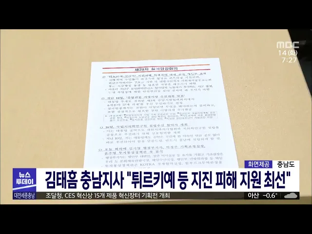 뉴스투데이 뉴스데스크뉴스투데이뉴스데스크 VOD(전체 다시보기)뉴스투데이 VOD(전체 다시보기)유튜브뉴스페이스북 뉴스카카오톡 뉴스인스타그램 뉴스 prev 2023.2.14 - 화요일 next "형제의 나라 도와요" 도움 손길 이어져/투데이 ◀앵커▶ 튀르키예와 시리아를 강타한 지진이 발생한 지 일주일이 지났습니다. 사망자가 3만 명을 훌쩍 넘는 데다 생존자들도 추위와 전염병 등 2차 재난에 노출되면서 도움이 절실해 지고 있는데요, 지역... 박선진 김태흠 충남지사 "지진 피해 지원 최선" 김태흠 충남지사가 지진 피해를 본 튀르키예와 시리아의 빠른 일상 회복을 위해 지원을 아끼지 않겠다고 말했습니다. 김태흠 지사는 실국원장회의에서 희생자에 애도를 표하고, 대한적십자사와 사회복지공... 이승섭 연구개발특구재단, 과학벨트지원사업에 109억 투입 연구개발특구진흥재단이 올해 대전 신동과 둔곡, 도룡지구 등 거점지구와 세종·청주·천안 등 기능지구를 연계·육성하는 과학벨트 지원사업에 109억 원을 투입합니다. 특구재단은 올해 기초·원천기술 실용... 김태욱 합계출산율 0.7명대..대책 마련 고심/투데이 ◀앵커▶ 학령인구와 노동인구 감소, 지역소멸 등 많은 사회문제의 이면에는 낮은 출산율이 자리하고 있습니다. 지자체마다 경제적 지원 외에도 다양한 지원책으로 출산율 끌어올리기에 안간힘을 쓰고 있는... 김광연 대전 20개 초교서 저녁까지 돌봐주는 '늘봄학교' 운영 오후 8시까지 돌봄을 하는 초등 늘봄학교 시범 지역으로 선정된 대전시교육청이 사업에 참여할 20개 학교를 선정했습니다. 시교육청은 동구와 중구, 대덕구 등 동부교육지원청 관할에서 12개, 서구와 유성... 김지혜 논산시, 2025년까지 공공산후조리원 짓는다 논산시가 오는 2025년 상반기까지 공공산후조리원을 건립합니다. 시는 지난해 행정안전부 공모사업과 지방소멸광역기금으로 확보한 100억 원으로 지산동 일원에 산모실 15개와 모자건강증진실을 갖춘 공공... 김태욱 세종시 천연습지를 가다/투데이 ◀앵커▶ 세종시에는 두 강줄기가 만나 수십 년 동안 조성된 천연습지가 있습니다. 사람의 발길이 닿지 않아 다양한 동식물이 서식하며 생태적 가치가 높은 곳인데, 정작 세종시는 국가 보호 습지 신청을 ... 고병권 "유전적 다양성 확보"…예산군, 일본서 황새 2마리 도 천연기념물 황새를 복원하고 있는 예산군이 황새의 유전적 다양성 확보를 위해 일본에서 황새 도입을 추진합니다. 군은 지난 2013년 업무협약을 체결했던 일본 도요오카시 효고현립 황새고향공원에서 오는... 최기웅 대전 서식 일본뇌염·뎅기열 등 매개모기 2.5배로 증 대전에서 서식하는 일본뇌염과 뎅기열 등 매개모기가 2.5배 늘어난 것으로 나타났습니다. 대전보건환경연구원은 지난해 한밭수목원과 성두산근린공원 등 5곳에서 일본뇌염과 황열, 웨스트나일열, 뎅기열, ... 문은선 코로나·AI, 99.99% 친환경적 사멸/투데이 ◀앵커▶ 코로나19나 조류독감 등의 바이러스를 변이까지 효율적으로 사멸하는 친환경 방역 기술이 개발됐습니다. 부식이나 환경파괴 등의 부작용을 크게 줄일 기술로 주목받고 있습니다. 조형찬 기자가 보... 조형찬 대전 시민단체, 건설노조 대전 공안탄압대책위 결성 대전지역 종교·시민단체들이 정부의 민주노총 건설노조 탑압을 규탄하며 공안탄압대책위원회를 결성했습니다. 대책위는 기자회견을 통해 정부가 건설노조를 불법 세력으로 매도해 연일 무리한 압수수색 등... 김지혜 이장우 대전시장 "트램 정거장에 지역 표현 디자인 담 이장우 대전시장이 도시철도 2호선 트램 정거장에 지역 특성을 반영한 디자인을 주문했습니다. 이 시장은 주간업무회의에서 세계적 도시가 되려면 건축디자인이 중요하다고 강조한 뒤 예산을 확정하고 설... 최기웅 충남 산불 절반은 봄철에 집중..소각 부주의가 요인 충남에서 최근 10년 동안 발생한 산불의 절반 이상이 봄철에 발생한 것으로 나타났습니다. 충남소방본부 집계 결과 충남에서 최근 발생한 산불 천 6백여 건 가운데 58.9%가 3월에서 5월 사이에 집중됐고, ... 이승섭 다누리, 달에서 촬영한 첫 달 표면사진 공개 과학기술정보통신부와 한국항공우주연구원은 우리나라 최초의 달 궤도 탐사선 다누리가 시운전 기간 촬영한 달 표면 사진을 공개했습니다. 고해상도 카메라로 처음으로 촬영한 달 사진에는 마그마로 뒤덮... 조형찬 세종시 조치원비행장 비행안전구역 대폭 축소 전망 세종시 조치원비행장의 비행안전구역이 대폭 축소돼 세종시 원도심 일대 건축물 높이 제한 등의 규제가 완화될 전망입니다. 세종시는 국방부가 조치원비행장을 고정익 항공기 등을 운영하는 지원항공 작전... 김태욱 과기정통부, 3월 17일까지 AI·반도체대학원 3곳 모집 과학기술정보통신부가 다음 달(3) 17일까지 인공지능· 반도체 산업 석·박사 고급인재 양성 사업을 맡을 인공지능반도체 대학원 3곳을 모집합니다. 과기정통부는 세계적인 수준의 인공지능 반도체 설계와 ... 김태욱 대전 서구체육회장 당선무효 효력 정지..재선거 중단 서철모 대전 서구청장의 특정 후보자 사퇴 종용 의혹이 불거져 오는 23일 다시 치러질 예