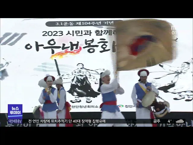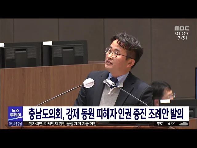 뉴스투데이 뉴스데스크뉴스투데이뉴스데스크 VOD(전체 다시보기)뉴스투데이 VOD(전체 다시보기)유튜브뉴스페이스북 뉴스카카오톡 뉴스인스타그램 뉴스 prev 2023.3.1 - 수요일 next '4년 만 정상 개최' 아우내봉화제/투데이 ◀앵커▶ 오늘은 일제강점기 대한민국의 자주독립을 선언한 독립운동의 상징, 만세운동을 기념하는 3.1 절인데요, 당시 천안에서도 유관순 열사를 중심으로 4월 만세운동이 있었는데 코로나19 이후 4년 만... 문은선 충남도의회, 강제 동원 피해자 인권 증진 조례안 발의 충남도의회 더불어민주당 안장헌 의원이 일제강점기 강제 동원 피해자의 명예 회복과 인권 증진을 위한 조례안을 대표발의했습니다. 조례안에는 피해자 추도 공간과 박물관을 조성하고 피해자에게 생활 보... 이승섭 충남 지역 강제동원 노동자상 제막식 열려 충남 지역 강제동원 노동자상 제막식이 독립기념관 보은의 동산에서 열렸습니다. 노동자상 건립 추진위원회는 일제강점기 강제 동원된 조선인은 780만 명에 달하며 충남에서도 수십만 명 이상이 끌려간 것... 김광연 학교 앞 문구점 점차 역사 속으로/투데이 ◀앵커▶ 3월 새 학기가 다가오는 이맘때쯤이면 가정에선 아이들 학용품 준비하느라 분주했죠, 요즘은 대부분 준비물을 학교에서 공동 구매하긴 하지만 그래도 새 학기 준비할 게 많은 때입니다. 그런데 정... 윤웅성 서산시 합계출산율 1.21명..전국 시 단위 지자체 3위 서산시의 지난해 합계출산율이 1.21명으로 충남 15개 시군 가운데 1위이자 전국 시 단위 기초자치단체 가운데 3위를 기록했습니다. 서산시는 산업단지의 기업 유치로 젊은 노동자가 유입됐고, 임신축하금... 이승섭 방역당국, 고병원성 AI 특별 방역 한 달 연장 방역당국이 서산의 메추리 농장을 비롯해 최근 고병원성 조류인플루엔자가 잇따라 발생하면서 특별 방역 대책 기간을 이달(3) 말까지로 한 달 연장했습니다. 농림축산식품부는 철새가 많이 오가고 고병원... 이승섭 300억 투자해놓고..공실률 50%/투데이 ◀앵커▶ 대전의 랜드마크로 떠오른 193m 높이의 사이언스 콤플렉스는 신세계뿐 아니라 과학기술인 공제회 지원금도 300억 원이나 투입돼 43층으로 지어졌는데요. 이 덕분에 과기 공제회가 9개 층을 30년간... 고병권 세종참여연대, 세종시에 인사청문회 제도 도입 촉구 세종참여자치시민연대가 세종시에 산하 공기업과 출자·출연기관장 후보자의 자질을 검증하는 인사청문제를 도입해야 한다고 촉구했습니다. 이들은 기초자치단체까지 인사청문회 도입을 확대한 '지방자치법... 이승섭 전 연인 차량에 위치추적기 단 40대 징역형 집행유예 대전지법 형사5단독 김정헌 판사는 헤어진 연인의 차량에 위치 추적기를 단 혐의로 재판에 넘겨진 40대 남성에게 징역 10월에 집행유예 2년을 선고했습니다. 이 남성은 지난 2021년 7월, 세종시의 한 아파... 이승섭 정부기관 사칭 유사투자자문 피해 보상 안내 주의 정부 기관을 사칭한 유사투자자문 피해가 잇따라 주의가 요구됩니다. 지난해 한국소비자원에 접수된 대전과 세종, 충남지역의 피해 상담 1위는 유사투자자문 관련 내용으로 약 천 5백 건의 상담이 진행된 ... 문은선 대전 유성구 일대에 연구산업진흥단지 조성 대전 유성구의 전민동과 탑립동, 둔곡동 일대가 대전 연구산업진흥단지로 조성됩니다. 대전시는 과학기술정보통신부의 공모 사업에 선정돼 약 2백 ha 부지에 연구장비산업과 관련한 기업을 지원할 기반을 ... 이승섭 대전시, 웰니스·의료관광 특화 공모 탈락 대전시가 문화체육관광부의 웰니스·의료 관광 융복합 클러스터 조성 공모 사업에 탈락했습니다. 시는 과학과 웰니스 관광을 결합한 명상과학 콘텐츠를 제시했으나 유성온천 등 대전만의 특화 콘텐츠를 부... 문은선 서천군, 서천읍성 북문지 최초 발견 서천군이 조선시대에 세워진 것으로 추정되는 서천읍성의 북문지를 처음으로 확인했습니다. 군은 충남역사문화연구원과 함께 서천읍성 내부의 시굴 조사를 벌여 북문지로 추정되는 주거지와 건물지, 고급 ... 이승섭 충남도, 소상공인·취약계층 중심 난방비 지원 확대 충남도가 소상공인과 사회 취약계층을 중심으로 난방비 지원을 확대합니다. 도는 먼저 소상공인 만 6천여 명에게 이달(3)부터 5월까지 청구될 도시가스 요금의 납부를 3개월 연장하고, 미납 요금의 연체료... 이승섭 충남교육청, 교권 침해시 피해 교원 즉시 분리 충남도교육청이 교권 침해 사건이 발생했을 때 가해 학생과 피해 교원을 즉시 분리하기로 했습니다. 충남교육청은 그동안 근거 법령이 없어 신속하게 피해 교원을 보호하는 조치가 어려웠지만, 모든 학교... 이승섭 세종시, 새학기부터 식자재 배송 차량 40대 직접 운행 세종시가 학교에 안정적으로 식자재를 공급하기 위해 새학기부터 식자재 배송 차량 40대를 직접 운행합니다. 시는 지난해 12월부터 시민 40명을 선발해 예비교육과 배송지 답사를 마쳤으며 운행 차량을 직... 이승섭 원자력연, 미세먼지 원인 물질 제거 기술 이전 한국원자력연구원 첨단방사선연구소가 전자선을 이용해 미세먼지의 원인 물질을 제거하는 기술을 국내 기업에 이전했습니다. 