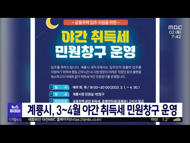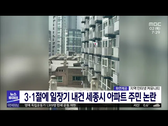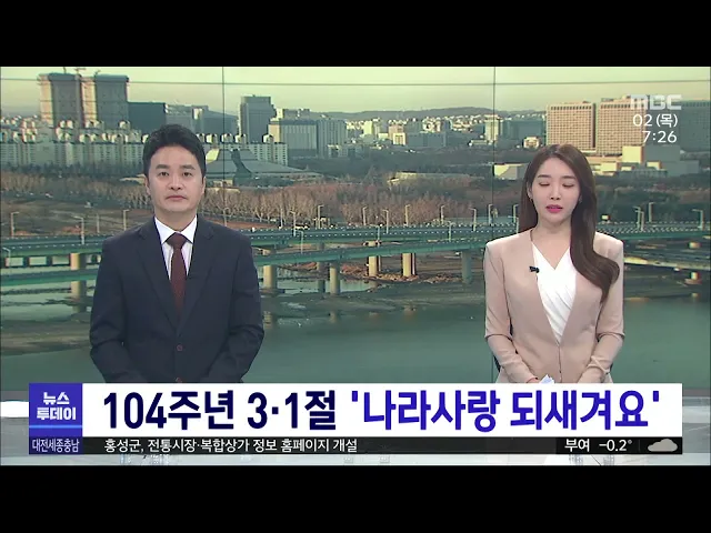 뉴스투데이 뉴스데스크뉴스투데이뉴스데스크 VOD(전체 다시보기)뉴스투데이 VOD(전체 다시보기)유튜브뉴스페이스북 뉴스카카오톡 뉴스인스타그램 뉴스 prev 2023.3.2 - 목요일 next 104주년 삼일절 '나라사랑 되새겨요'/투데이 ◀앵커▶ 어제는 104년 전, 민중들이 일제에 맞서 대한독립을 외쳤던 '삼일절'이었죠. 삼일절 기념식도 4년 만에 독립기념관에서 대면으로 성대하게 치러졌는데요. 아이부터 어른까지, 명예 독립운동가 1,9... 김태욱 일제강점기 일본인 귀속재산 540만㎡ 국유화 완료 조달청이 2012년 이후 지난해까지 시행한 일제강점기 일본인 소유 부동산 국유화 사업으로 여의도 면적의 1.9배인 540만㎡가 국유화된 것으로 나타났습니다. 조달청 조사 결과 귀속재산으로 확인돼 국유화... 최기웅 3·1절에 일장기 내건 세종시 아파트 주민 논란 삼일절인 어제세종시 한솔동의 한 아파트 가구 베란다에 태극기 대신 일장기를 게양한 사진이 지역 커뮤니티 사이트 등에 올라와 논란이 일고 있습니다. 세종시는 아파트 관리사무소 측에 일장기를 내려줄... 김태욱 '잠깐도 안돼' 운전 중 휴대전화/투데이 ◀앵커▶ 현행 도로교통법 상 운전 중 휴대전화를 사용하거나 영상을 보는 것은 금지돼 있죠. 그런데 잠깐이라는 생각에 아직도 운전 중 통화를 하거나 메시지를 보내는 운전자가 많습니다. 운전 중에는 잠... 박선진 과학도시는 대전, 한국항공우주연구원 방문 1위 대전시가 전 국민을 대상으로 설문조사를 실시한 결과, 대한민국 과학도시하면 떠오르는 곳으로 대전이 1위를 차지했습니다. 대덕특구의 인지도를 묻는 질문에 응답자 82.6%가 잘 알고 있다고 답했으며 대... 최기웅 항우연, 연구 개발 현장 견학 프로그램 재개 한국항공우주연구원이 코로나19로 중단했던 연구 개발 현장 견학 프로그램을 이달부터 재개합니다. 현장 견학에서는 한국형 발사체 '누리호'의 75톤급 실물 엔진과 달 궤도선 '다누리'의 조립과 시험 시설... 이승섭 대전 탁구 유망주 권혁, 세계 1위 우뚝/투데이 ◀앵커▶ 대한민국 남자 탁구 유망주인 대전 동산중 권혁이 월드테이블테니스 15살 이하 남자단식 세계랭킹 1위에 올랐습니다. 한국 선수가 정상에 오른 건 처음인데, 여전히 탁구가 제일 즐겁다는 권혁은 ... 윤웅성 대전 엑스포과학공원 일대, 야간관광 특화도시 대전 엑스포과학공원 일대가 문화체육관광부와 한국관광공사가 선정하는 국제명소형 야간관광 특화도시에 이름을 올렸습니다. 대전시와 대전관광공사는 갑천을 중심으로 엑스포과학공원과 대전컨벤션센터,... 이승섭 대전·태안, '충청권 잠재 관광지' 선정 대전 동구의 상소문화공원과 태안의 청산수목원이 한국관광공사가 공모한 충청권 잠재 관광지에 선정됐습니다. 지난 2019년 대동하늘공원에 이어 대전 동구에서 두 번째 잠재 관광지로 꼽힌 상소문화공원... 문은선 충남도, 스마트 공장 구축 사업 추진 충남도와 충남테크노파크가 10명 미만인 소기업과 충남 남부 지역 기업을 지원하는 스마트 공장 구축 사업을 추진합니다. 도는 충남 북부 지역에 집중된 제조 역량을 확산하기 위해 논산과 계룡 등 남부 ... 이승섭 충남건설본부, 지방도 정비에 1,260억 투입 충남건설본부가 도내 교통인프라 확충을 위해 지난해 대비 3.3배 늘어난 1,260억여 원을 지방도 정비 사업에 투입합니다. 건설본부는 이달 삭선-원북, 화성-장곡, 구용-용두 국지도 1개 지구 등 5개 지구... 최기웅 세종시-소방청 안전 시스템 연계 체계 구축 세종시가 자체 운영 중인 스마트시티 통합 플랫폼과 소방청 다매체 119신고 시스템 직접 연계 체계를 전국 최초로 구축하고 운영에 들어갔습니다. 이번 연계 체계 구축으로 세종시 도시통합정보센터 CCTV... 김태욱 김태흠 지사 충남 아산FC 명예구단주 추대 김태흠 충남지사가 충남아산FC 명예구단주로 추대됐습니다 김 지사는 아산 이순신종합운동장 주 경기장에서 열린 충남아산FC 홈 개막전에 참석해 박경귀 아산시장으로부터 명예구단주 추대장을 받았습니다... 최기웅 예산군 "전국 기초자치단체 브랜드 평판 1위" 예산군이 한국기업평판연구소가 주관한 기초자치단체 브랜드 평판 조사에서 전국 226개 지자체 가운데 1위를 차지했습니다. 군은 미디어와 소통 등의 4개 영역에서 1위에 올랐는데, 예산 전통시장의 활성... 이승섭 홍성군, 전통시장·복합상가 정보 홈페이지 개설 홍성군이 전통시장 5곳과 복합상가 3곳의 정보를 제공하는 홈페이지를 구축하고, 이를 바탕으로 한 다양한 정보 제공 서비스를 시작했습니다. 홈페이지에는 전통시장과 상가의 소개와 시설 정보, 지도 등... 이승섭 대전시, 5개구 보건소 진료업무 재개 대전시가 코로나19 대응을 위해 잠정 중단됐던 5개구 보건소 진료업무를 오늘부터 재개합니다. 대전시는 5개구 보건소장과 진료 재개 여부를 논의했으며, 취약계층 불편 지속과 다른 광역시 사례 등을 고... 최기웅 계룡시, 야간 취득세 민원창구 운영 나서 계룡시가 대실지구 공동주택 입주민 편의를 위해 야간 취득세 민원창구를 재운영합니다. 다음 달까지 두 달간 시청 민원실에서는 매주 화요일과 목요일 오후 8시까지 취득세, 등록면허