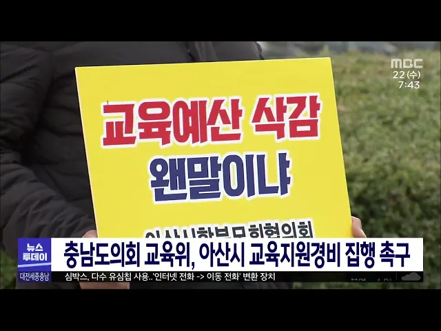 뉴스투데이 뉴스데스크뉴스투데이뉴스데스크 VOD(전체 다시보기)뉴스투데이 VOD(전체 다시보기)유튜브뉴스페이스북 뉴스카카오톡 뉴스인스타그램 뉴스 prev 2023.3.22 - 수요일 next 나노·반도체에 그린 바이오까지 추가/투데이 ◀앵커▶ 오늘도 대전 국가산업단지 관련 보도 이어갑니다. 다른 지자체와 달리 대전시가 국가산단 조성 사업비의 40%나 부담하겠다고 나선 것 말고도 이 국가산단에 들어갈 산업 분야도 조정이 불가피해 ... 고병권 방사청 240여 명, 6월 말 1차 대전 이전 대전 이전이 결정된 방위사업청의 1차 선발대 240여 명이 오는 6월 말 옛 마사회 건물에 입주합니다. 대전시는 소방, 전기, 내부인테리어 등 33억 원이 투입되는 리모델링 공사에 100% 대전지역 업체만 참... 조형찬 대전시, 지역연고 안경렌즈·타월산업 집중 육성 대전시가 대전의 대표 연고산업인 안경렌즈와 타월 산업 첨단화에 나섰습니다. 시는 중소벤처기업부의 지역 연고산업 육성 사업 선정으로 오는 2024년까지 국비 등 15억 원을 투입해 제품 첨단화와 판로개... 조형찬 삼성 대규모 투자..아산시 "관련 분야 적극 지원" 삼성이 천안과 아산을 비롯해 전국에 향후 10년 동안 60조 원을 투자할 계획을 발표한 가운데, 아산시는 관련 분야 육성과 지원에 적극 나서겠다고 밝혔습니다. 아산에는 반도체 패키지 투자 확대와 디스... 김광연 "치명률 높지만 무자격 횡행"/투데이 ◀앵커▶ 최근 동력 패러글라이딩을 하던 50대가 하천에 빠져 숨지는 사고가 있었죠. 법적으로 동력 패러글라이딩은 조종 자격증이 있어야 하지만 시험이 어렵고 현실적으로 단속이 불가능하다는 이유 등으... 윤웅성 경찰, 현대아울렛 화재 4명 사전 구속영장 신청 8명 사상자를 낸 지난해 9월 현대아울렛 대전점 화재와 관련해 경찰이 4명에 대한 사전 구속영장을 다시 신청했습니다. 경찰은 이번 화재와 관련해 지난해 13명을 입건해 현대아울렛 대전지점장 등 5명에 ... 김지혜 세종시 출자·출연기관 조례 집행부 이송…여야 갈등 국민의힘 세종시당은 시의회에서 통과된 세종시 출자·출연 기관 운영에 관한 조례 일부 개정안에 대해 시장이 조례안을 공포하지 말 것을 촉구했습니다. 이들은 소속 의원 한 명이 실수로 찬성을 눌렀고, ... 고병권 대전 담배소매 거리제한 50m→80m 확대 보류 대전에서 담배소매 영업소 사이 거리를 현행 50m에서 80m로 늘리는 방안이 보류됐습니다. 대전구청장협의회는 어제 회의에서 담배소매 거리 제한 확대 방안을 논의했지만 나들가게 등 일반 담배 소매인의 ... 고병권 ②'K-해양치유' 신산업 안착하나?/투데이 ◀앵커▶ 해양 관광 산업의 가치와 성공 가능성을 알아보는 기획보도, 두 번째 순서입니다. 태안군은 내년에 서해안에서 첫 해양치유센터를 열 계획인데요. 좋은 입지 조건과 특유의 바다 자원을 갖춰 경쟁... 이승섭 충남도의회,공공기관 주차장 개방 지원 조례 입법예고 충남도의회가 인구 밀집 지역의 주차난을 해소하기 위해 주차장을 개방한 공공기관 등에 보조금을 지원하는 조례 제정에 나섰습니다. 더불어민주당 오인철 의원이 대표 발의한 조례안은 충남도가 주차장을... 이승섭 충남도, KB국민은행과 소상공인 금융 지원 MOU 충남도가 KB국민은행 충남본부, 충남신용보증재단과 업무협약을 맺고 중소기업과 소상공인의 금융 지원을 확대하기로 했습니다. 이에 따라 충남신용보증재단은 KB국민은행 충남본부가 특별 출연한 30억 원... 이승섭 김동일 보령시장, 해수부 방문 글로벌 해양레저도시 김동일 보령시장이 해양수산부를 방문해 내년도 해양수산분야 주요 현안을 설명하고 지원을 요청했습니다. 김 시장은 송상근 해수부 차관을 만나 대천해수욕장 앞 소녀암에 호텔과 마리나, 크루즈 터미널 ... 문은선 피싱 범죄 악용 '심박스' 원천 봉쇄/투데이 ◀앵커▶ 여러 개의 휴대전화 유심 칩을 꽂아 해외 전화가 국내에서 걸려온 것처럼 전화번호를 표시하게 하는 심박스라는 장치가 있는데요, 보이스피싱범들이 악용하는 심박스를 일반 휴대전화와 구분하는 ... 조형찬 "아들 납치했다" 고령자 노리는 보이스피싱 수법 기승 지난달 28일 오전 9시 30분쯤 대전 대덕구의 한 우체국에서 현금 2천4백만 원을 인출해 보이스피싱 일당에게 전달하려던 70대 여성이 직원과 경찰의 기지로 피해를 면했습니다. 앞서 80대 여성도 보이스피... 김지혜 조합원에게 상품권 건넨 후보자, 벌꿀 세트도 제공 대전 대덕구선거관리위원회는 지난 8일 치러진 전국 동시 조합장 선거와 관련해 조합원에게 벌꿀 세트를 제공한 혐의로 조합장 후보자와 그 지인을 경찰에 고발했습니다. 이들은 지난달 중순 한 조합원의 ... 고병권 충남도의회 교육위, 아산시 교육지원경비 집행 촉구 충남도의회 교육위원회 위원들이 성명을 내고 최근 아산시가 교육지원경비의 예산 집행을 중단한 데 대해 우려와 유감을 표하고 조속한 예산 집행을 촉구했습니다. 위원들은 시의회 의결을 거쳐 아산시가 ... 이승섭 코바코, 지역 소상공인 방송광고 지원 한국방송광고진흥공사가 대전컨벤션센터에서 지역 소상공인 19개 업체와 방송광고 지원 협약식을 가졌습니다. 이번 협약을