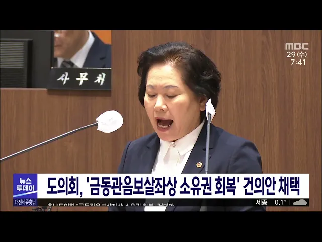 뉴스투데이 뉴스데스크뉴스투데이뉴스데스크 VOD(전체 다시보기)뉴스투데이 VOD(전체 다시보기)유튜브뉴스페이스북 뉴스카카오톡 뉴스인스타그램 뉴스 prev 2023.3.29 - 수요일 next 미래형 환승센터, 450억 짜리 김칫국?/투데이 ◀앵커▶ 대전시가 대전역을 미래형 환승센터로 만드는 정부공모 사업에 선정돼 국고 450억 원을 받게 됐다고 발표했습니다. 하지만, 정작 주관부서인 국토교통부는 결정된 국고지원액은 이보다 훨씬 적은 ... 고병권 한국타이어 대전공장 1공장 시험 운행 시작 한국타이어 대전공장이 대형 화재 발생 2주일 만에 공장 가동 재개를 위한 준비에 들어갔습니다. 한국타이어 측은 그제 오후부터 1 공장 직원 가운데 설비 가동을 위한 최소한의 필수 인력 70여 명이 교대... 박선진 현대아울렛 관계자 구속영장 재기각 지난해 8명의 사상자를 낸 현대아울렛 대전점 화재와 관련해 현대아울렛 등 관리자급 4명에 대한 구속영장이 다시 기각됐습니다. 대전지법은 소방점검 관련 문서를 위조하고 화재수신기를 고의로 꺼놓은 ... 박선진 청년 울리는 전세 사기 의혹 확산/투데이 ◀앵커▶ 대전에서 50억 원대 전세 사기 사건이 발생해 경찰이 수사에 착수했다는 소식 어제 전해드렸는데요. 이곳 말고도 지역에서 비슷한 사례가 또 있는 것으로 확인됐습니다. 이번에도 대부분 2~30대 젊... 윤웅성 서민 울리는 '깡통전세', 예방은?/투데이 ◀앵커▶ 빌라나 다세대주택 중심으로 터지는 잇단 전세 사기 사건으로 세입자들의 시름이 깊어지고 있습니다. 한 가정의 전 재산, 인생이 걸린 만큼 어떻게 하면 좀 더 안전하게 전세를 얻을 수 있는지 계... 김지혜 발전소 많은 충남, 전기요금 감면?/투데이 ◀앵커▶ 충남에는 전국 석탄화력발전소의 절반이 있습니다. 그만큼 전기를 많이 만들어서 다른 지역에 공급하고 있는데 화력발전소 주변의 피해는 온전히 주민들의 몫이었습니다. 발전소와 가까운 지역의 ... 이승섭 아산 부역혐의 희생사건 유해 40구 발굴 2기 진실·화해를 위한 과거사 정리위원회가 아산시 배방읍 일대서 진행한 '부역혐의 희생사건' 발굴을 통해 유해 40여 구를 확인했습니다. 유해는 폭 3m, 길이 14m의 방공호를 따라 무릎이 구부러진 자세... 문은선 충남도의회 "금동관음보살좌상 소유권 회복" 건의안 충남도의회가 소유권을 두고 서산 부석사가 일본과 소송을 벌이고 있는 금동관음보살좌상이 부석사로 돌아와야 한다는 내용의 건의안을 채택했습니다. 건의안을 대표 발의한 김옥수 도의원은 2심 선고는 ... 이승섭 대전 이주 방위사업청 직원들, 부동산 정보 지원받는 오는 6월 대전으로 이전해 근무할 방위사업청 직원들이 정착 비용과 함께 부동산 정보도 지원받습니다. 대전 서구는 최근 한국공인중개사협회 대전시지부와 업무협약을 체결하고 방사청 직원들에게 전·월... 문은선 시민단체 104곳, 산자부 기후위기 선제 대응해야 다음 달 14일 세종시에서 기후 정의와 관련한 대규모 파업을 준비 중인 시민사회단체 104곳이 어제 산업통상자원부 앞에서 집회를 열고 기후 위기에 대비한 선제적인 대응을 촉구했습니다. 이들은 기업 이... 고병권 7월 태안에서 국내 최대 규모의 풋살 대회 개최 오는 7월 태안에서 국내 최대 규모 풋살 대회가 열립니다. 태안군은 한국풋살연맹과 협약을 맺고, 오는 7월 1일부터 열흘 동안 태안군민체육관과 종합체육관에서 '2023 FK컵 대회'를 열기로 했습니다. FK... 이승섭 태안 유류피해극복기념관, 기록유산 등재 기념 사진전 태안군 유류피해극복기념관이 오는 5월 7일까지 유류피해 극복 기록물의 유네스코 세계기록유산 등재를 기념해 사진전을 진행합니다. 이번 사진전에는 지난 2007년 기름 유출 사고 당시의 피해 현장과 자... 이승섭 벚꽃 절정/투데이 ◀앵커▶ 대전은 요즘 마치 꽃의 도시가 된 것처럼 도심 곳곳에 벚꽃이 절정을 이루고 있죠. 예년보다 온화한 날씨가 이어지면서 벚꽃이 예상보다 일찍 꽃망울을 터트리면서 마치 눈이 내린 것처럼 곳곳에 ... 최기웅