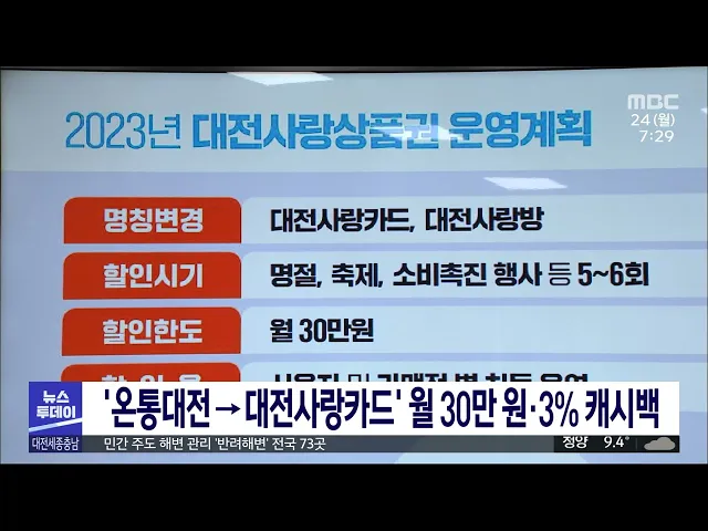 뉴스투데이 뉴스데스크뉴스투데이뉴스데스크 VOD(전체 다시보기)뉴스투데이 VOD(전체 다시보기)유튜브뉴스페이스북 뉴스카카오톡 뉴스인스타그램 뉴스 prev 2023.4.24 - 월요일 next 천 원의 아침밥, 충남도가 지원한다/투데이 ◀앵커▶ 정부가 대학생들의 부담을 덜기 위해 '천 원의 아침밥' 사업을 전국으로 확대하겠다고 했지만 재정 부담에 대학 참여가 저조하다는 소식 전해드렸는데요, 충남도가 도내 대학생들의 든든한 아침을... 김태욱 대전 트램 예산 협의 마무리..내년 상반기 착공 사업비가 두 배가량 늘어 난항을 겪던 대전 도시철도 2호선 트램 건설사업이 정부와 예산 협의를 마무리하고 내년 상반기 착공을 목표로 후속 절차에 들어갑니다. 사업비는 당초 승인받은 예산보다 6,599... 문은선 대전 새 지역화폐 `대전사랑카드` 다음 달 출시 사실상 폐지된 대전 지역화폐 온통대전 대신 소비 취약계층과 소규모 가맹점을 우대하는 대전사랑카드가 다음 달 출시됩니다. 대전사랑카드로 이름을 바꾼 지역화폐는 월 구매 한도 30만 원에 3% 캐시백을... 문은선 '내 손으로 해변 돌봐요' 반려해변 인기/투데이 ◀앵커▶ 폐어망과 어구 등 해양 쓰레기와 각종 생활 쓰레기는 바다에 쌓여 여러 가지 환경 문제를 야기하는데요. 주로 정부 주도로 이뤄져 온 해양 쓰레기 수거 정책이 최근에는 '반려해변'이라는 제도를 ... 김광연 '한 달만 또 음주운전' 20대 항소심서 집행유예 음주운전으로 적발된 지 한 달 만에 또다시 만취운전을 한 혐의로 1심에서 실형을 선고받은 20대가 항소심에서 집행유예로 감형됐습니다. 대전지법은 도로교통법 위반 혐의로 기소된 20대에게 징역 1년 6... 문은선 충청 휘발유값 상승세..유류세 인하 8월 말까지 연장 정부가 유류세 인하 조치를 8월 말까지 연장했지만 국제 유가 상승 압력에 충청권 기름값이 상승세를 이어가고 있습니다. 한국석유공사 유가 정보 사이트인 오피넷을 보면, 대전의 휘발유 평균 가격은 리... 문은선 충남소방본부, 축사 화재 '주의보' 대전과 세종에 이어 홍성과, 천안 등 충남 5개 시·군에도 건조주의보가 내려진 가운데 축사 화재에 각별한 주의가 요구됩니다. 충남도소방본부는 최근 5년간 도내에서 발생한 3백여 건의 축사 화재 가운데... 박선진 세종 조치원읍행정복지센터 사회복무요원 표창 세종북부경찰서는 민원 처리에 불만을 품고 행정복지센터에서 흉기를 휘두른 민원인을 제압해 검거하는 데 도움을 준 사회복무요원에게 표창장과 포상금을 수여했습니다. 이 40대 남성은 지난 12일 생계·... 박선진 '국내 최대 소비촉진' 5월 동행축제 대전서 개막 국내 최대 규모의 중소기업·소상공인 제품 소비촉진행사인 '동행축제' 개막 행사가 비수도권으로는 처음으로 다음 달 9일 대전에서 진행됩니다. 중소벤처기업부는 소비와 내수 경기 활성화를 위해 다음 달... 문은선 세종시 서버 137대 클라우드 시스템 전환..탄소 감축 세종시가 시와 산하기관에서 사용하던 서버 137대를 가상 인터넷 자원공유 즉 클라우드 시스템으로 전환해 탄소 배출 감축 효과를 거두고 있습니다. 이에 따른 전력 소비량을 연간으로 환산할 경우 90% 가... 문은선 대전시 청정수소 생산기반 구축 대전시가 음식물쓰레기에서 바이오가스를 생산하는 사업에 본격 착수합니다. 시는 지역에서 나오는 음식물류 폐기물과 하수슬러지를 활용해 바이오가스를 생산하는 사업이 최근 환경부 공모에 선정됨에 따... 문은선 피아니스트 겸 지휘자 김선욱 28일 대전서 첫 지휘 피아니스트 겸 지휘자 김선욱이 대전에서 첫 지휘 무대를 선보입니다. 국내에서 유일하게 피아노 연주와 지휘를 동시에 하는 김선욱은 오는 28일 대전예술의전당에서 한국인 최초로 미국 신시내티 심포니... 문은선 태안군, `반려동물 친화 관광도시` 조성 본격화 태안군이 반려동물 친화 관광도시 조성에 본격 나섭니다. 군은 이달 초 문화체육관광부와 한국관광공사의 2023 반려동물 친화 관광도시 공모에 선정됨에 따라 오는 2026년까지 연간 5억 원을 투입해 반려... 문은선 부여·서천 등 5월 축제 풍성 부여 부소산 봄나들이 축제가 어린이날 연휴인 다음 달 5일부터 사흘 동안 부소산성과 관북리 유적 일원에서 열립니다. 코로나19 이후 4년 만에 다시 열리는 이번 축제에선 부소산을 산책하며 낙화암 등 7... 김윤미 태안 희망택시 이용자 증가 태안군이 고령이나 임신 등으로 버스 이용이 어려운 주민을 위해 운영 중인 '희망 택시' 이용자가 꾸준히 느는 것으로 나타났습니다. 올해는 신청자 가운데 506명을 대상자로 확정했으며 지난 2020년 5천7... 문은선 보령사랑 상품권 122억 원 추가 발행 보령시가 금리와 물가 인상 등으로 어려움을 겪는 지역 소상공인을 돕기 위해 122억 원 규모의 보령사랑 상품권을 추가 발행합니다. 상품권은 10% 특별 할인 혜택이 있고 1명 당 최대 50만 원까지 구매할 ... 김태욱 지난해 국내 기업의 해외 특허 출원 9.1% 증가 미국과 중국 등 해외 주요 나라에 대한 우리나라 기업의 특허 출원이 지난해 9.1% 증가한 것으로 나타났습니다. 특허청은 우리 기업의 해외 출원은 지난해 7만 6천여 건으로, 전년과 비교해 9.1% 늘