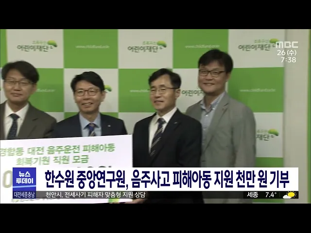 뉴스투데이 뉴스데스크뉴스투데이뉴스데스크 VOD(전체 다시보기)뉴스투데이 VOD(전체 다시보기)유튜브뉴스페이스북 뉴스카카오톡 뉴스인스타그램 뉴스 prev 2023.4.26 - 수요일 next "또 빚내라고?" 두 번 울리는 전세대책/투데이 ◀앵커▶ 사회적 재난에 비할 만큼 전국에서 전세사기 피해가 커지자 정부가 살던 집을 우선적으로 살 수 있게 하는 특별법을 내놨는데요, 하지만 이미 빚뿐인 피해자들에게 또 빚을 내게 하는 대책은 실효... 김지혜 천안시, 전세사기 피해자 자체 지원책 마련 최근 잇단 전세사기 피해에 관련 대책이 쏟아지는 가운데 천안시도 피해 임차인을 찾는 한편 자체 지원대책을 시행합니다. 시는 우선 주거복지종합지원센터와 피해자 맞춤형 지원 상담을 제공하고 각 구청... 김광연 오피스텔 사들여 수억원 전세사기 40대 2심도 실형 대전지법 형사항소3부는 오피스텔 등을 사들여 수억 원대의 전세사기를 벌인 40대에 대한 항소심에서 징역 3년을 선고한 원심을 파기하고 징역 1년 6개월을 선고했습니다. 피고인은 근저당 등 채무에도 건... 문은선 총선 D-1년, 전직 단체장의 행보는?/투데이 총선기획 타이틀 ◀앵커▶ 내년 총선을 앞두고 우리 삶을 바꾸는 정치를 짚어보는 기획보도 순서입니다. 지난해 지방선거에선 당시 대전과 세종, 충남의 현직 단체장이 모두 낙마했는데요. 중량급 정치인이... 고병권 충청권 광역철도 1단계 사업 연내 착공 가능 대전 도시철도 2호선과의 중복 문제로 지난해부터 사업이 중단됐던 충청권 광역철도 1단계 사업이 연내 착공할 전망입니다. 대전시는 기획재정부가 한국개발연구원에 의뢰한 '사업 수요 예측 재조사'에서 ... 고병권 태안군, 안면도 4지구 관광숙박업 사업계획 최종 승인 태안군이 온더웨스트 컨소시엄이 주관하는 안면도 관광지 개발 사업지 4지구 내 관광숙박업 사업계획을 최종 승인했습니다. 조선호텔앤리조트 등 8개사로 구성된 온더웨스트 컨소시엄은 오는 2027년까지 ... 김태욱 대전에서도 필라테스 프랜차이즈 '먹튀' 논란/투데이 제보는 MBC 타이틀 ◀앵커▶ 전국에 25개의 지점을 둔 프랜차이즈 필라테스 업체가 대구와 울산에 이어 대전에서도 돌연 휴업을 통보했습니다. 백화점에도 입점한 업체라 믿고 등록했던 고객들은 분통을 터... 박선진 여신도 성폭행 혐의 JMS 정명석 구속기간 6개월 연장 여신도 성폭행 혐의로 재판을 받는 기독교복음선교회 JMS 총재 정명석 씨의 구속 기간이 내일까지지만, 최대 6개월이 더 연장됐습니다. 대전지법 형사 12부 나상훈 부장판사는 검찰이 한국인 여신도 강제... 김지혜 한수원, 대전 음주사고 피해아동 지원 천만원 기부 한국수력원자력 중앙연구원 직원들이 대전 음주운전 사고 피해아동을 위한 후원금 천만 원을 초록우산어린이재단 대전지역본부에 전달했습니다. 이번 후원금은 대전 둔산동의 어린이보호구역에서 발생한 ... 박선진 한국타이어 대전공장 화재 오늘 합동감식 지난달 한국타이어 대전공장에서 발생한 대형 화재와 관련해 현장 합동 감식이 오늘 진행됩니다. 대전경찰청은 오늘 오전, 소방, 국립과학수사연구원 등 관련 기관들과 함께 불이 난 2 공장에 진입해 발화... 김지혜 세종시, 상습 정체 교차로 2곳 개선사업 완료 세종시에서 극심한 차량 정체를 빚는 교차로 2곳의 구조개선 사업이 마무리됐습니다. 시는 대평동 해들 교차로의 우회전 차로를 기존 60m에서 200m로 확장하고 좌회전 차로도 기존 2개에서 3개선으로 늘렸... 고병권 `갑질 공무원은 직위해제, 복지 포인트도 감액 세종시가 성범죄나 갑질 행위가 적발된 공무원은 즉시 직위를 해제하는 등 엄정하게 대응하기로 했습니다. 시는 올 상반기 청렴도 향상 대책 회의를 열고 금품 비위나 성범죄, 갑질 등의 시민 불신을 초래... 고병권 대전 과학기술진흥계획 의결..과학산업·인재 육성 대전시가 앞으로 5년 동안 과학산업을 육성하고 혁신인재를 양성하기로 했습니다. 대전시는 지역의 과학기술 정책을 결정하는 과학기술위원회를 열고 이같은 내용의 주요 정책과 함께 과학기술육성기금 존... 김윤미 담배 피우거나 술 마시는 충남도민 증가 담배를 피우거나 술을 마시는 충남도민이 늘어난 것으로 나타났습니다. 질병관리청이 지난해 실시한 지역사회 건강조사 결과를 보면 충남도민 가운데 평생 5갑 이상 흡연을 했고 현재 담배를 피는 사람의 ... 문은선 대전행동, 방미중인 尹대통령에 "자주 외교 해야" 정전 70년 한반도 평화 대전행동이 한미 정상회담을 위해 미국을 방문 중인 윤석열 대통령에게 주권 국가로서 국익과 평화 수호를 앞세우는 자주외교를 주문하며 한미 정상회담에 반대 입장을 나타냈습니... 고병권 대전 생명사랑 협의체 발대식..자살예방 협력 대전시와 대전광역자살예방센터, 교육청과 소방 등 지역 50개 기관은 어제 대전에서 생명사랑 협의체 발대식을 갖고 자살 고위험군 발굴 등 자살로부터 안전한 지역사회 안전망 구축에 함께 노력하기로 했... 문은선 대전세종지역 안전문화 홍보대사 위촉 한국산업안전보건공단 대전세종광역본부는 어제(25) IBS 과학문화센터 회의실에서 대전세종지역 안전문화 홍보대사