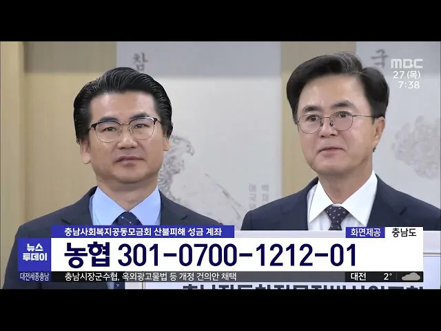 뉴스투데이 뉴스데스크뉴스투데이뉴스데스크 VOD(전체 다시보기)뉴스투데이 VOD(전체 다시보기)유튜브뉴스페이스북 뉴스카카오톡 뉴스인스타그램 뉴스 prev 2023.4.27 - 목요일 next 한국타이어 화재 첫 감식...피해는 여전/투데이 ◀앵커▶ 지난달 한국타이어 대전공장 대형 화재가 발생한 지 어느덧 40여 일이 지났습니다. 화재 원인을 조사하기 위한 수사당국의 현장 감식이 시작됐는데요, 그 사이 하루하루 버텼던 협력업체 직원들은... 김지혜 대전 광역 아동학대 전담의료기관에 충남대병원 대전시가 광역 아동학대 전담의료기관으로 충남대병원을 지정했습니다. 이에 따라 충남대병원은 진료 과정에서 발견한 아동학대 의심사례 신고는 물론 학대 피해 아동을 치료·자문하고 아동학대와 신체 정... 고병권 단국대병원, 의사과학자 양성 미래의료연구센터 선정 바이오 분야 핵심 인재인 의사과학자를 육성하기 위해 정부가 공모한 혁신형 미래의료연구센터에 충청권에서는 천안 단국대병원이 선정됐습니다. 전국 6개 권역별 거점 연구센터에 포함된 단국대병원은 앞... 김윤미 쓰레기 매립장에 골프장 추진/투데이 ◀앵커▶ 대전시가 쓰레기 매립장 등 환경시설이 밀집한 유성구 금고동에 공공형 골프장 조성 계획을 발표했습니다. 하지만, 시비 부담이 상당한 데다 사업 대상지가 그린벨트여서 실제 사업까지는 적잖은 ... 고병권 세종시, '미가동' 폐기물 소각시설 견학 논란에 사과 소각시설 가동이 멈춘 사실을 알고도 주민과 의회 등이 참여하는 견학을 진행한 세종시가 이틀 만에 공식 사과했습니다. 세종시는 지난 24일 경기도 이천의 폐기물 처리시설로 견학을 떠났지만, 정비를 이... 김윤미 대전 시민·사회단체, "핵진흥 정책 중단 촉구" 체르노빌 핵발전소 폭발사고 발생 37주기를 맞아 대전환경운동연합 등 지역 시민·사회단체 등이 한국원자력연구원 앞에서 추모식과 기자회견을 열고 정부의 핵 진흥 정책을 비판했습니다. 이들은 체르노빌... 고병권 벼 직파재배로 노동력·비용 대폭 줄인다/투데이 ◀앵커▶ 본격적인 영농철을 앞두고 있지만 요즘 농촌은 인구 감소에 고령화로 일손 부족과 경영난으로 어려움이 많죠, 드론 등 스마트 농기계를 활용해 벼농사에 드는 노동력과 경영비용을 80% 넘게 줄일 ... 김태욱 익명의 80대, 충남 산불피해 복구 성금 전달 서산에서 익명의 80대 어르신이 산불피해 복구에 써달라며 성금을 전달해 훈훈한 화제가 되고 있습니다. 서산시는 지난 24일 80대 어르신이 사회복지과를 방문해 산불피해 복구를 위해 써달라며 성금 160... 문은선 지역 기업, 충남도에 산불 성금 4억 2,800만 원 기부 산불 피해 복구를 위한 기업과 기관들의 기부도 이어지고 있습니다. 지금까지 계룡건설이 2억 원, 서부발전과 중부발전이 각각 1억 원, 홍성의료원이 천300만 원, 한국자산관리공사 대전충남지역본부가 천... 김태욱 대한민국 과학축제 오늘 첫 대전서 개막 대덕연구개발특구 50주년을 맞아 대한민국 과학축제가 오늘처음으로 서울과 수도권이 아닌 대전에서 개막해 나흘간 펼쳐집니다. 국내 최대 규모의 과학 행사인 대한민국 과학축제는 오늘 오후 2시 개막식... 김윤미 대전 그린바이오산업 육성 업무협약 체결 대전시가 미래 식량과 관련한 그린 바이오산업 육성을 위해 산·학·연과 업무협약을 맺었습니다. 대전시는 충남대와 생명연, 화학연, 한의학연 등 정부출연연구기관, 관련 기업 등 모두 11개 기관과 그린 ... 고병권 대전시민 흡연음주율 증가..세종시 건강지표 전국최고 술·담배를 하거나 스트레스·우울감을 느끼는 대전시민이 는 것으로 나타났습니다. 지난해 실시된 지역사회 건강조사 결과 대전지역 흡연율은 18.5%로 전년보다 0.7% 포인트 높아졌고 월간 음주율도 57.2%... 고병권 충남시장군수협, 옥외광고물법 등 개정 건의안 채택 충남도 시장·군수협의회가 예산군청에서 회의를 열고, 정당 현수막 난립을 막고 공정한 세부 기준 마련을 촉구하는 내용의 옥외광고물법 개정 공동건의문을 채택했습니다. 건의문은 정당 현수막에 대한 선... 김태욱 대한축구협회-천안시, `한국 축구 명예의 전당` 조성 대한축구협회와 천안시가 `한국 축구 명예의 전당` 조성을 위한 업무협약을 맺고 축구역사박물관 조성을 위해 함께 협력하기로 했습니다. 한국 축구 명예의 전당은 천안에 건립 추진 중인 축구역사박물관... 문은선 서산시, 농식품부와 '농촌협약'..농촌중심지 활성화 서산시가 정부세종컨벤션센터에서 농림축산식품부와의 479억 원 규모 '2023년 농촌협약'을 체결했습니다. 농촌협약 사업은 정부와 지자체가 함께 각종 농촌사업을 추진해 시너지 효과를 내는 사업으로, 서... 김태욱 대전시향 여자경 신임 예술감독 겸 지휘자 위촉 대전시가 시립교향악단의 새로운 예술감독이자 상임지휘자로 여자경 씨를 위촉했습니다. 여 신임 예술감독은 강남심포니오케스트라 예술감독 등을 역임했으며, 대전시는 세계적인 여성 지휘자 16명에 선정... 김윤미 대전 초등생들의 신나는 전통시장 여행…교육청 체험 대전시교육청이 초등생들을 대상으로 전통시장 체험학습을 진행합니다. 체험학습