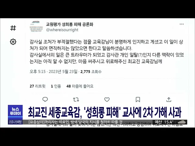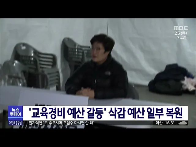뉴스투데이 뉴스데스크뉴스투데이뉴스데스크 VOD(전체 다시보기)뉴스투데이 VOD(전체 다시보기)유튜브뉴스페이스북 뉴스카카오톡 뉴스인스타그램 뉴스 prev 2023.5.25 - 목요일 next 누리호 "통신 이상"..아쉬운 발사 연기/투데이 ◀앵커▶ 실용위성을 싣고 우주를 향해 첫 실전 발사에 나설 예정이던 누리호의 3차 발사가 전격 연기됐습니다. 발사를 불과 3시간 남짓 앞두고 발사와 설비를 제어하는 컴퓨터 사이에 통신 이상이 발생한 ... 김윤미 원자력연, "후쿠시마 오염수 마시면 안 돼" 최근 후쿠시마 원전 오염수를 1리터라도 마실 수 있다는 영국 교수의 발언이 논란이 된 가운데 원자력연구원이 "원전 오염수는 마시면 안 된다는 것이 공식 입장"이라고 밝혔습니다. 주한규 원자력연 원장... 고병권 당진 사과 과수원 2곳서 과수화상병 발생 당진시 순성면 사과 과수원 2곳에서 올해 지역 첫 과수화상병이 발생했습니다. 이들 농가는 과수화상병 정기 예찰 기간 의심 나무가 관찰돼 정밀진단 결과 확진 판정을 받았으며, 감염 나무 제거 등 매몰... 문은선 세종시 금남면 38.39㎢ 토지거래허가구역 재지정 세종시가 이달 말 토지거래허가구역 지정이 만료되는 금남면 19개리 38.39㎢를 앞으로 2년간 허가구역으로 재지정했습니다. 세종시는 해당 부지가 국회 세종의사당, KTX 세종역, 광역철도 추진 등 각종 개... 고병권 산불 후 한 달.."당장 장마철인데"/투데이 ◀앵커▶ 홍성과 대전·금산 등에서 대형 산불이 발생한 지 어느덧 한 달이 훌쩍 넘었습니다. 당장 한 달 뒤면 장마가 시작된다는데 산불로 피해를 입은 시설 중에 아직 복구가 안 된 곳이 많아 또 산사태가... 박선진 조수미 씨 "'휠체어 그네' 제도 개선에 힘쓸 것" 성악가 조수미 씨가 세종시의 장애인 학교에 기부한 휠체어 그네가 관련 규정이 없어 철거된 것과 관련해 조 씨와 세종시 교육청이 제도 개선에 힘을 모으기로 했습니다. 세종교육청은 최근 조수미 씨와 ... 고병권 세종시 성희롱 피해교사에 교육감 공식 사과 지난해 교원평가에서 학생에게 성희롱 피해를 당한 세종시 교사가 교육청의 감사 문제를 지적한 것과 관련해 최교진 세종시 교육감이 공식 사과했습니다. 피해 교사는 그제(23) 최 교육감과 비공개 면담을... 문은선 '교육경비 예산 갈등' 삭감 예산 일부 복원 교육경비 예산 삭감을 놓고 갈등을 빚어 온 박경귀 아산시장과 시의회가 교육경비 예산 일부 복원에 합의했습니다. 이에 따라 의회에서 정한 예산을 일방적으로 삭감한 데 반발하며 단식 농성 중이던 김희... 문은선 충남도, 이달 안에 산불 재난지원금 지급/투데이 ◀앵커▶ 지난달 발생한 산불로 충남에선 백 명이 넘는 주민들이 삶의 터전을 잃었습니다. 지금도 대부분 조립식 건물 등 임시 시설에서 생활하고 있는데요, 충남도가 복구비 중 일부를 우선 편성해 이달 ... 김태욱 천안시, 심야시간대 주택가 오토바이·확성기 소음 규 천안시가 심야시간대 주택가 오토바이나 확성기 등의 소음 규제를 강화합니다. 규제 지역은 읍면동 중 동 지역으로 도심 아파트나 주택 밀집지역 대부분과 종합병원, 요양병원 등은 부지 경계선에서 직선... 문은선