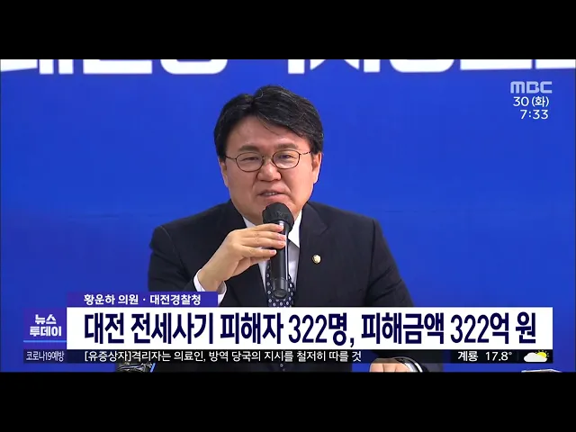 뉴스투데이 뉴스데스크뉴스투데이뉴스데스크 VOD(전체 다시보기)뉴스투데이 VOD(전체 다시보기)유튜브뉴스페이스북 뉴스카카오톡 뉴스인스타그램 뉴스 prev 2023.5.30 - 화요일 next 충청권 분양시장 성적표 '초라'/투데이 ◀앵커▶ 지난해만 해도 청약 불패를 이어가던 대전의 분양 시장이 차갑게 얼어붙고 있습니다. 수요자들이 매수 시점을 늦추면서 미분양 물량이 쌓여가고 있는 건 데요, 분양을 앞둔 조합과 건설사는 원자... 문은선 불법 낚시·장기 야영 '여전'/투데이 ◀앵커▶ 코로나19 방역수칙이 완화되고 날씨가 좋아지면서 하천 이용객도 늘고 있는데요, 대전 3대 하천을 중심으로 떡밥 낚시 같은 불법 행위와 장기 야영도 함께 많아지고 있습니다. 단속을 해도 그 때 ... 문은선 황운하 "대전 전세사기 피해자 322명…피해액 322억원 대전의 전세 사기 피해자가 300명이 넘고, 피해액도 320억 원에 이르는 것으로 추정됐습니다. 황운하 더불어민주당 대전시당위원장이 최근 대전경찰청 자료를 분석한 결과에 따르면, 지난 2020년 7월부터 ... 고병권 원자력 소통으로 승부해야/투데이 ◀앵커▶ 올해로 50주년을 맞은 대덕특구의 주요 연구 개발 역사를 MBC 뉴스로 돌아보는 기획보도 순서입니다. 안정적인 전력 생산으로 이른바 '한강의 기적'을 이끌어낼 수 있었던 원자력 에너지 기술은 ... 문은선 중이온 가속기 저에너지 전체구간 시운전 성공 대전 신동에 구축된 중이온 가속기가 저에너지 전체 가속구간에서 처음으로 빔 인출과 시운전에 성공했습니다. 기초과학연구원 중이온가속기 연구소는 지난 23일 약 110m에 달하는 저에너지 가속관 124기... 고병권 `KAIST·뉴욕대 조인트캠퍼스 공동연구 기금 10억` 기 카이스트가 미국 뉴욕대와 추진 중인 조인트 캠퍼스 공동 연구에 국내 가정용 의료기기 개발업체가 10억 원을 기부했습니다. 카이스트와기부 업체는 기부 약정식을 열고 이 같은 내용을 확정했으며, 카이... 고병권 대전시민 자전거 보험 사망·후유장해 보장금 2천만원 대전시가 시민 자전거 보험의 사망·후유 장해 보장금을 1천 700만 원에서 2천 만 원으로 확대했다고 밝혔습니다. 또, 4주 이상 상해 진단 때는 진단위로금 최대 50만 원, 6일 이상 입원 때는 입원 위로금... 고병권 휴양시설 이용 금지 등 '음주운전 공무원'에 불이익 대전 유성구가 잇따르는 공무원 음주운전을 근절하기 위해 음주운전에 적발된 직원들에게 불이익을 주는 등의 정책을 확대했습니다. 유성구는 음주운전에 적발되거나 관련 사고를 낸 직원들에게는 1년 동... 김광연 공주·보령·청양·천안, 아프리카 돼지열병 위험 충남에서 아프리카돼지열병 즉, ASF의 발병 위험지수가 높은 곳은 공주와 보령 청양 천안 등 4개 시·군 49곳으로 나타났습니다. 충남도가 분석한 ASF 위험지수에 따르면, 공주가 26곳으로 위험 지역이 가... 김광연 불법 해루질 방지법 국회 본회의 통과 안전사고 우려뿐 아니라 어민 피해가 제기돼 온 관광객 등 비어업인의 무분별한 해루질이 제한됩니다. 국민의힘 성일종 의원이 불법 해루질을 막기 위해 대표 발의한 수산자원관리법 개정안이 최근 국회 ... 문은선 태안 안흥외항 기능 대폭 개선…부두 시설 확충 태안군 근흥면 안흥외항의 부두 시설이 대폭 개선됩니다. 안흥외항은 서해안 중부권의 대표적 국가 어항으로, 그동안 수산물 유통 등 어업 전진기지로서 기능을 해왔지만 어선 3백여 척, 정기 여객선과 행... 문은선 한국 최초 천주교 순교자 3인 금산 진산성지 안치 한국 최초의 천주교 순교자인 윤지충 바오로, 윤지헌 프란치스코, 권상연 야고보의 유해가 232년 만에 고향인 금산 진산성지에 안치됐습니다. 윤지충과 권상연은 유교식이 아닌 기도로 장례를 치렀다 참수... 문은선 주택 임대차 계약 신고제 계도기간 1년 연장 임차인의 권리를 보호하기 위해 시행된 주택 임대차 신고제 계도기간이 당초 이달 말에서 내년 5월 말까지로 1년 연장됩니다. 주택 임대차 신고 대상은 임대료 변경 없는 갱신 계약 등을 제외한 보증금 6... 문은선