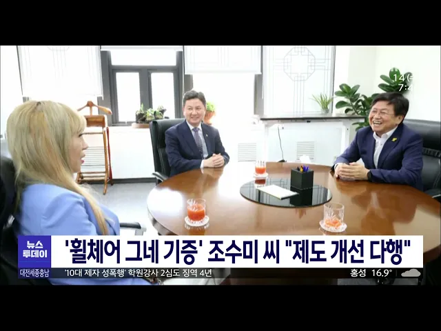 뉴스투데이 뉴스데스크뉴스투데이뉴스데스크 VOD(전체 다시보기)뉴스투데이 VOD(전체 다시보기)유튜브뉴스페이스북 뉴스카카오톡 뉴스인스타그램 뉴스 prev 2023.6.14 - 수요일 next '택시비마저'..기본요금 인상/투데이 ◀앵커▶ 3천 원대인 대전 택시 기본요금이 다음 달부터 4천 원대로 인상됩니다. 인건비는 물론 유류비, 보험비까지 줄줄이 오르는 상황에서 더 이상 버티기 힘들다는 택시업계 요구가 받아들여진 건데요. ... 박선진 행정도시 건설과정, 세계기록유산 아태지역 등재 추진 세종시의 행정중심복합도시 건설 과정을 담은 기록물을 유네스코 세계기록유산 아태지역 목록에 등재하는 방안이 추진됩니다. 행정중심복합도시건설청은 앞서 문화재청과의 협의를 통해 국제목록과 별도로... 김윤미 최민호 시장, 한화진 장관에 "세종보 탄력 운영해야" 최민호 세종시장이 상시 개방한 금강 세종보의 수문을 필요에 따라 닫는 등 탄력적인 운영을 정부에 건의했습니다. 최 시장은 최근 한화진 환경부 장관을 만나 "세종보 상시 개방 이후 물의 양이 줄고 퇴... 김윤미 "인재도 키우겠다" 반도체 특화단지 청신호?/투데이 ◀앵커▶ 대전시가 카이스트 등 대학들과 손잡고 미래 먹거리인 반도체 전문 인력을 본격적으로 키우기로 했습니다. 이들 전문 인력들이 일할 수 있는 관련 기업 유치에도 힘을 쏟고 있는데요. 다음 달 정... 김윤미 대전시 '리그오브레전드 코리아 결승전' 개최 오는 8월 대전에서 비수도권에서는 처음으로 리그오브레전드 챔피언스 코리아 결승전이 열립니다. 대전시와 리그오브레전드 챔피언스 코리아는 어제 대전 도룡동 이스포츠 경기장에서 업무협약을 맺고 오... 고병권 천안시, 7월부터 임산부 교통비 30만 원 지원 천안시가 출산을 장려하기 위해 다음 달부터 다문화가족을 포함해 모든 임산부에게 1인당 30만 원의 교통비를 지원합니다. 대상은 천안시에 6개월 이상 주민등록을 두고 거주하는 임신 12주 이상에서 출산... 김광연 충남 의료공백 '심각' 대책은/투데이 ◀앵커▶ 내포신도시를 비롯해 충남은 의사가 부족해 의료 공백에 대한 고민이 큰 데요, 충남도의회에서도 특히 전국적으로 문제가 되고 있는 소아과 진료 위축에 대한 대책 마련을 촉구하고 나섰습니다. ... 김태욱 '휠체어 그네 철거 논란' 조수미 씨 "제도 개선 다행" 성악가 조수미 씨가 기증한 장애인용 놀이기구 '휠체어 그네' 철거 논란 이후 행정안전부가 안전 기준을 담은 개정안을 재행정 예고한 가운데 조수미 씨가 최교진 세종시교육감과 함께 한창섭 행안부 장관... 박선진 2023 대한민국 군수산업발전대전 대전서 개막 저출산에 따른 입대자원 감소 등으로 관심이 높아진 드론과 로봇 등 첨단 과학기술의 국방 분야 활용을 위한 대한민국 군수산업발전대전이 개막해 오는 15일까지 대전컨벤션센터에서 열립니다. 개막식에서... 김윤미 당진시, 오는 19일부터 난지도에 공공형 버스 운행 당진시는 오는 19일부터 난지도에 공공형 버스를 운행합니다. 시는 지난(5)달 15일부터 도비도와 대난지도를 잇는 여객선 운항이 중단되고 다음 달 해수욕장 개장이 예정된 만큼 당초 준비하고 있던 공공... 김광연 보령에 24시 시간제 어린이집 시범 운영 보령시가 다음 달(7)부터 365일 24시 시간제 어린이집을 시범 운영합니다. 365일 24시 시간제 어린이집은 6개월 이상 만 5살 이하 영·유아를 대상으로 부모의 야간경제 활동, 병원 진료 등으로 긴급 돌봄... 김태욱 '어린이 공공재활병원' 밀린 공사비 지급 촉구 대전어린이공공재활병원 시공업체와 하도급 업체 10여 곳이 병원 앞에서 기자회견을 열고 발주처인 충남대병원에 공사 대금 지급을 촉구했습니다. 이들은 충남대병원 측이 건물 준공이 났는데도 공사대금 ... 고병권 민주당 "성추행 전력 대전미디어센터장 해임해야" 더불어민주당 대전시당이 언론인 재직 시절 성추행 전력이 최근 보도된 이종국 대전시청자미디어 센터장 해임을 촉구했습니다. 민주당은 논평을 통해 지난 1일 임명된 대전미디어센터장이 언론사 기자였던... 김윤미 월성원전 자료삭제 산업부 공무원 3명 해임징계 퇴사 월성 1호기 원전자료를 삭제한 혐의로 1심에서 징역형을 선고받은 산업통상자원부 공무원들이 해임 징계를 받아 퇴사했습니다. 월성 1호기 조기 폐쇄 업무를 담당했던 50대 국장 등 3명은 인사혁신처 징계... 박선진 역주행하다 차량 버리고 도주한 불법체류 몽골인 검거 여자친구를 흉기로 위협한 혐의로 경찰 수사를 받아 도주하던 불법 체류 외국인이 무면허 상태에서 역주행까지 하다 경찰에 붙잡혔습니다. 이 남성은 지난달 24일 낮 12시 반쯤 대전 동구에서 충북 옥천 ... 김지혜