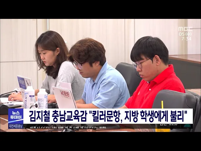 뉴스투데이 뉴스데스크뉴스투데이뉴스데스크 VOD(전체 다시보기)뉴스투데이 VOD(전체 다시보기)유튜브뉴스페이스북 뉴스카카오톡 뉴스인스타그램 뉴스 prev 2023.7.5 - 수요일 next 출생 미신고 두 살배기 발견, 35건 수사의뢰/투데이 ◀앵커▶ 천안에서 부모가 출산 뒤 출생신고를 하지 않고, 방치했던 두 살배기 아이가 경찰에 발견됐습니다. 실제 태어났지만 출생신고를 하지 않은, 이른바 '유령 영아'가 우리 지역에서 확인된 사례만 30... 고병권 이장우 대전시장 "대중성 없다면 와인엑스포 중단" 이장우 대전시장이 지역 축제의 혁신을 강조했습니다. 이장우 시장은 확대간부회의에서 오는 9월로 예정된 대전국제와인엑스포의 경우 대중성을 확보하지 못하면 내년부터 중단할 계획이며, 30년 역사를 ... 이승섭 김지철 충남교육감 "킬러문항, 지방 학생에게 불리" 최근 윤석열 대통령의 '공정 수능' 발언 이후 대학수학능력시험의 초고난도 문항, 이른바 킬러문항이 이슈가 된 가운데 김지철 충남교육감은 킬러문항은 충남 등 지방 학생들에게 불리하다며 출제에서 배... 박선진 파크골프협회들, '시 직영 전환' 거부/투데이 ◀앵커▶ 시청자들이 보내주민 제보를 바탕으로 한 [제보는 MBC] 순서입니다. 최근 전국적으로 중장년층을 중심으로 파크골프 열풍이 불고 있는데요. 그런데 대전에서는 최근 공공파크골프장의 특정 시설들... 뉴스팀 부여군, 역대 최대 5백억 원 투자유치 부여군이 이차전지 제조설비 업체인 중국 항커사와 역대 최대인 3,800만 달러, 우리돈으로 5백억 원에 달하는 투자협약을 맺었습니다. 부여군은 이 협약으로 항커 기업이 5년 간 은산2산업단지 5만 ㎡ 부... 조형찬 심정수 금산군의회 의장 취임 1년 만에 자진 사퇴 심정수 금산군의회 의장이 취임 1년 만에 의장직에서 스스로 물러났습니다. 심정수 의장은 최근 농지법을 위반한 혐의로 경찰 조사를 받는 등 신변 문제로 부담을 느낀 것으로 알려졌으며, 지난달 말, 의... 이승섭 대전시, 드론 산업 활성화 시동/투데이 ◀앵커▶ 대전은 한국항공우주연구원을 중심으로 한 항공 연구가 활발하고, 드론 기업이 모여 있지만, 정작 드론 비행이 법으로 대부분 금지돼 있는 것이 현실인데요. 규제가 관련 산업 발전에 걸림돌이 되... 이승섭 대전시, 한부모 가정에 가사 서비스 이용료 지원 대전시가 한부모 가정의 부담을 덜기 위해 청소나 세탁 등의 가사 서비스 이용료를 일주일에 최대 4만 원까지 지원합니다. 지원 대상은 12살 이하 아동을 키우면서 경제활동을 하는 기준중위소득 120% 이... 이승섭 세종시, 승강기 고립사고 대응 합동 훈련 세종시가 소방본부, 승강기안전공단 등과 승강기 고립 사고에 대응한 합동 훈련을 진행했습니다. 이번 훈련은 정전에 따른 승강기 급정지 상황을 가정해 신고와 상황전파, 출동, 구조 등의 과정으로 진행... 김지혜 사람 쓰러지자 신고...똑똑한 인공지능 CCTV/투데이 ◀앵커▶ 거리에서 갑자기 쓰러지거나 지역 축제에 많은 인파가 몰려 위험해지는 상황, 이때 가장 중요한 건 빠르게 상황에 대응해 골든타임을 지키는 건데요. 현장을 즉시 포착하고 범죄를 예방해 주는 인... 김지혜 기초연, 유휴·저활용 연구장비 기업에 무상 이전 한국기초과학지원연구원이 정부출연연구기관 가운데 처음으로 쓰지 않고 보관 중이거나 활용도가 낮은 연구장비를 민간에 이전합니다. 기초과학지원연과 과학기술정보통신부, 연구산업협회는 대전에서 업... 김윤미