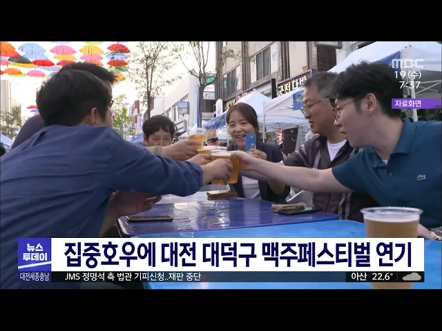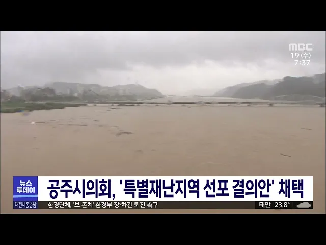 뉴스투데이 뉴스데스크뉴스투데이뉴스데스크 VOD(전체 다시보기)뉴스투데이 VOD(전체 다시보기)유튜브뉴스페이스북 뉴스카카오톡 뉴스인스타그램 뉴스 prev 2023.7.19 - 수요일 next "한 해 농사 다 망쳤다" 농민 망연자실/투데이 ◀앵커▶ 며칠째 퍼붓던 장맛비는 오늘 밤이면 일단 그칩니다. 하지만 이미 600mm가 넘는 폭우가 쏟아진 충남에선 축구장 만 4천 개 크기인 농경지 만 ha가 침수되거나 유실됐습니다. 수확을 코 앞에 두고 ... 뉴스팀 "다 때려 부쉈어" 되풀이된 수해/투데이 ◀앵커▶ 이번 집중호우로 600mm 넘는 폭우가 쏟아진 청양은 지난해에도 400mm가 넘는 폭우로 특별재난지역에 포함됐는데요. 2년 연속 되풀이 된 대형 재난에 이재민이 2백 명이 넘고 가축 피해도 어마어마... 김태욱 공주시의회, 특별재난지역 선포 결의안 채택 이번 집중호우로 침수 등 큰 피해를 입은 공주시를 특별재난지역으로 선포해 달라는 결의안을 공주시의회가 채택했습니다. 채택된 결의안에는 이번에 쏟아진 폭우로 공주에서 1명이 숨지고, 농경지 침수와... 김지혜 집중호우에 대전 대덕구 맥주페스티벌 연기 대전 대덕구가 골목상권 활성화를 위해 이번 주 예정했던 대덕거리 맥주페스티벌을 집중호우로 연기했습니다. 대덕구는 전국적인 폭우 피해 상황에서 축제를 여는 건 맞지 않다는 상인회장단의 결정에 따... 문은선 "환경부는 금강·영산강 보 처리방안 이행하라" 4대강 보 개방과 관련한 감사원 감사 결과 발표를 앞두고 금강, 영산강 지역의 환경단체가 보 존치 움직임을 보이는 환경부 장·차관의 퇴진을 촉구했습니다. 이들은 최근 폭우로 청양과 논산, 공주 등 금... 고병권 '협치 실종' 대전시의회 파행/투데이 ◀앵커▶ 요즘 대전시의회가 시끄럽습니다. 입법 활동 과정에서 불거진 여야 의원들의 갈등 때문인데요. 협치가 사라지고, 파행을 빚게 된 대전시의회를 이승섭 기자가 취재했습니다. ◀리포트▶ 제272회 대... 이승섭 대전 전교조, 시의회 학생 키 성장 지원 조례안 철회 전교조 대전지부가 최근 대전시의회가 입법 예고한 '학생 키 성장 지원 조례안'의 철회를 촉구했습니다. 전교조 대전지부는 보도자료를 통해 '성장판 검사' 지원이 핵심인 조례안이 통과될 경우, '키가 커... 고병권 사업체 대표·임대업 무신고 겸직 효문화진흥원 직원 대전시 출연기관인 한국효문화진흥원 직원 4명이 신고 없이 사업체 대표로 재직하는 등 겸직을 유지하다 감사에 적발됐습니다. 이들은 지난 2013년부터 건설장비 임대업 대표직에 이름을 올려두고 5년간 9... 김지혜 JMS 정명석 재판, 피고 측 `법관 기피신청`으로 중단 여신도 성폭행 혐의를 받는 기독교 복음선교회 JMS 총재 정명석의 재판이 피고 측의 법관 기피신청으로 중단됐습니다. 애초 어제 대전지법 제12형사부 나상훈 판사 주재로 열릴 예정이던 재판은 전날 정명... 고병권 중앙과학관, 국가전략기술 '양자' 전시회 선보여 반도체 등 미래 산업 분야의 판도를 바꿀 핵심 기술이자 12대 국가전략기술인 양자 기술을 쉽게 이해할 수 있는 전시회가 오는 30일까지 국립중앙과학관에서 개최됩니다. '아는데 모르는 양자의 세계'를 ... 김윤미 국회 세종의사당 규칙 심의할 운영위 소위 21일 개최 국회 세종의사당 건립을 위한 국회의 규칙 제정을 심의할 국회 운영개선소위원회가 이번 주에 열릴 전망입니다. 윤재옥 국민의힘 원내대표와 박광온 민주당 원내대표는 어제 만나 국회 규칙 제정을 논의할... 이승섭 조달청, 집중호우 피해 기업·기관 지원 조달청이 최근 집중호우로 피해를 본 지역의 기업과 기관을 지원합니다. 조달청은 공공기관이 요청한 수해 복구와 방역, 구호를 위한 물자와 공사의 경우 공고 기간이 5일인 긴급 입찰을 시행하고 수의 계... 이승섭 수자원공사, 호우 피해지역 수도 사용요금 감면 추진 한국수자원공사는 이번 집중호우로 특별재난지역 선포가 이뤄지면 광역상수도 사용요금을 감면할 예정입니다. 공사 측은 금강 등 4개 유역에 있는 병입 수돗물 생산설비를 상시 가동하고 수도시설이 파손... 문은선