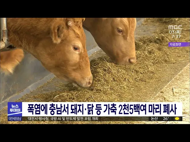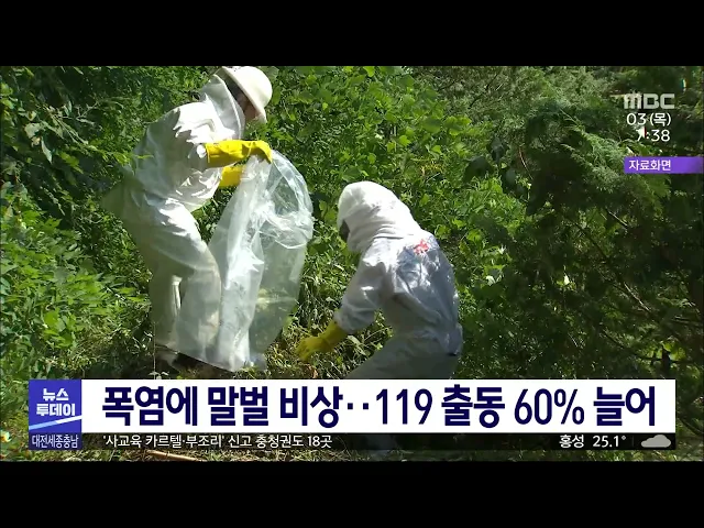 뉴스투데이 뉴스데스크뉴스투데이뉴스데스크 VOD(전체 다시보기)뉴스투데이 VOD(전체 다시보기)유튜브뉴스페이스북 뉴스카카오톡 뉴스인스타그램 뉴스 prev 2023.8.3 - 목요일 next 수해 주민에게 더 혹독한 '폭염/투데이 ◀앵커▶ 장마가 끝나고 타는 듯한 불볕더위가 이어지면서 일주일째 폭염특보가 계속되고 있는데요, 지난 집중호우로 피해를 입은 이재민들은 복구 작업도 안 끝났는데 폭염까지, 말 그대로 이중, 삼중고를 ... 문은선 충남 수해 폐기물 2만 5천t, 처리비만 백억 원 충남에서 지난달 집중호우로 발생한 폐기물 규모는 2만 5천여 톤으로 처리비용만 백억 원이 넘는 것으로 추산됐습니다. 폐기물 양은 청양이 만 1,000t으로 가장 많고, 공주와 예산이 각각 5천 t과 4천 t, ... 김태욱 폭염에 충남서 가축 2천500마리 폐사 연일 30도를 웃도는 폭염으로 충남 도내에서 지난달까지 가축 2천530마리가 폐사한 것으로 나타났습니다. 지역별로는 홍성이 천 6백여 마리로 가장 많았고 아산과 논산, 예산 등의 순이었으며, 피해 가축... 문은선 폭염에 말벌 비상, 119 출동 60% 늘어 계속되는 폭염에 말벌집을 제거하기 위한 119 출동이 크게 늘고 있습니다. 대전소방본부에 따르면, 최근 일주일 사이 말벌집 제거와 동물 구조 등을 위한 출동은 하루 평균 104건으로, 전주 대비 67.8% 증... 고병권 LH 철근 누락.. 건설산업 구조 바꿔야/투데이 ◀앵커▶ 충남에서도 아산과 공주, 내포신도시에 있는 아파트 단지 3곳이 LH가 발주한 철근 누락 아파트로 확인되면서 입주민들이 불안해하고 있는데요, 전문가들은 보강공사를 하면 붕괴 사고 등으로 이어... 김태욱 2025 세종 국제정원박람회 기본계획 발표..180만 목표 세종 국제정원박람회가 오는 2025년 4월 11일부터 45일 동안 세종중앙공원과 국립세종수목원, 세종 합강습지 등 세종시 전역에서 열립니다. 이번 박람회는 '가족과 함께하는 정원 속의 하루'를 주제로 세... 이승섭 충남 보령에 박지성 축구트레이닝센터 개장 보령 대천해수욕장 인근에 박지성 보령 축구트레이닝센터가 문을 열었습니다. 보령시는 박지성 JS 파운데이션 이사장 등이 참석한 가운데 개장식을 열고 박지성 기념관 물품 기증식, 박지성 동상 제막식 ... 문은선 대전시·방사청, 국방 AI 및 반도체 발전 포럼 대전시와 방위사업청은 시청에서 국방 AI와 반도체 발전 포럼을 열고 국정과제인 인공지능을 기반으로 한 과학기술 강군 육성을 위해 머리를 맞댔습니다. 참석자들은 국방 AI와 반도체 발전을 위해 산학연... 이승섭 "지옥 같았다" 충남 교권침해 2백여 건/투데이 ◀앵커▶ 서울 서이초 교사 사망 사건으로 교권 침해에 대한 사회적 공분과 개선 요구가 잇따르고 있는데요. 지역에서도 교권 침해 사례가 수백 건씩 접수되고 있는데 내용을 들여다보면 상상을 초월하는 ... 김광연 "학부모 관련 유언 없는데.." 카이스트 교수 글 논란 서울 서이초 교사가 극단적 선택을 한 사건을 계기로 교권 침해에 대한 우려가 커진 가운데 카이스트 교수가 "잘못된 직업 선택의 결과일 수 있다"는 글을 올려 논란이 일고 있습니다. 카이스트 경영대학 ... 김윤미