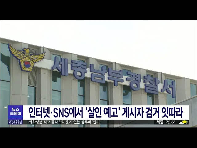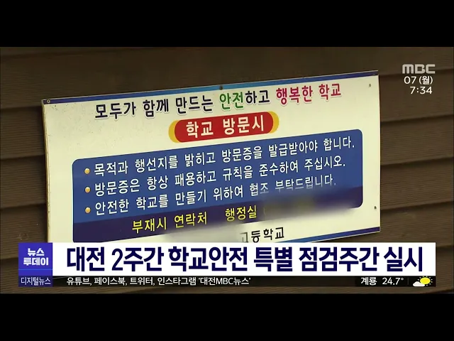 뉴스투데이 뉴스데스크뉴스투데이뉴스데스크 VOD(전체 다시보기)뉴스투데이 VOD(전체 다시보기)유튜브뉴스페이스북 뉴스카카오톡 뉴스인스타그램 뉴스 prev 2023.8.7 - 월요일 next 교사 찌른 20대 구속...불안한 시민들/투데이 ◀앵커▶ 학교에 침입해 교사를 흉기로 찌른 혐의를 받는 20대 남성이 구속됐습니다. 교사 피습 사건에 이어 SNS 등에 묻지마 살인을 모방한 살인 예고 글이 잇따르면서 시민 불안이 커지자 기차역과 대형... 김지혜 인터넷 '살해 예고 글' 게시자 검거 잇따라 경기도 분당 '서현역 흉기 난동' 이후 지역에서도 살인 예고 글을 올리는 사례가 잇따르고 있습니다. 대전경찰청 사이버수사대는 SNS에 대전 은행동에서 칼부림을 하겠다는 글을 올린 혐의로 13살 남성 학... 고병권 대전교육청, 학교안전 특별점검 주간 실시 대전 교사 피습 사건 등으로 학부모와 학생들의 불안이 커지면서 오늘부터 2주간 학교안전 특별 점검주간이 실시됩니다. 대전교육청은 실태점검반을 편성해 학교 출입문 통제시스템 현황, 외부인 출입관리... 김지혜 복구한 지 2년만에 또..'임시 다리'라서?/투데이 ◀앵커▶ 지난달 폭우로 특별재난지역에 포함된 세종에서 당시 다리가 하나 파손됐는데 벌써 한 달 가까이 이용하지 못하고 있습니다. 그런데, 이 다리 2년 전에도 집중호우로 부서져 복구를 했는데 똑같은... 박선진 세종·충남 등 상수도 요금 감면·세무조사 유예 지난달 집중호우로 특별재난지역으로 선포된 세종과 충남 4개 시·군에 상수도 요금 감면과 세무조사 유예 등의 조치가 이뤄집니다. 세종시는 집중호우 피해 가구에 상수도 요금을 8월 고지분부터 3개월간 ... 김지혜 서산서 밭일하던 60대 사망...온열질환 추정 충남에서 또 온열질환이 원인으로 추정되는 사고로 60대가 숨졌습니다. 그제 오전 10시 30분쯤 서산시 지곡면 한 고추밭에서 60대 여성이 숨진 채 발견됐습니다. 경찰과 소방당국은 발견 당시 여성의 체온... 김지혜 대전시, 장애인 이용 교통수단 확충 대전시가 휠체어를 타는 장애인이 이용하는 특별교통수단을 앞으로 4년 안에 50대 늘리기로 했습니다. 시는 현재 96대가 운영 중인 특별교통수단을 올해부터 4년 동안 해마다 확충해 오는 2026년에는 법정... 이승섭 보령 호도·태안 가의도를 '지속 가능한 섬마을'로 보령시 호도와 태안군 가의도가 행정안전부 주관 섬 지역 특성화 사업 공모에 선정되면서 총 100억 원이 투입돼 '지속 가능한 섬마을'로 재탄생합니다. 충남도는 '맛과 멋의 은빛 휴양 섬 호도', '육쪽씨... 김지혜 '유전자가위·약물 결합' 항암 신약 개발 '유전자가위'로도 불리는 유전자 교정과 화학 약물 효과를 동시에 얻을 수 있는 새로운 항암제를 국내 연구진이 개발했습니다. 카이스트 정현정·박희성 교수 공동연구팀은 실제 사람 몸속에서 전달 효율이... 김윤미