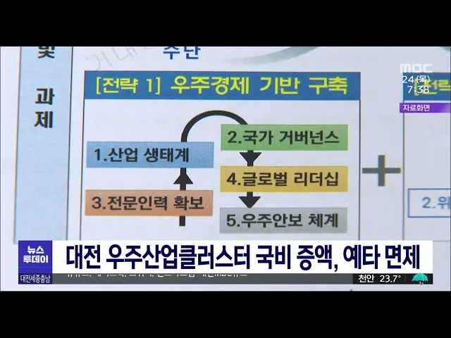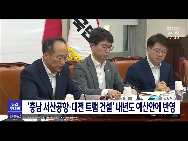 뉴스투데이 뉴스데스크뉴스투데이뉴스데스크 VOD(전체 다시보기)뉴스투데이 VOD(전체 다시보기)유튜브뉴스페이스북 뉴스카카오톡 뉴스인스타그램 뉴스 prev 2023.8.24 - 목요일 next 축제가 코 앞인데.. 오염수 방류 '날벼락'/투데이 ◀앵커▶ 일본 정부가 오늘후쿠시마 원전 오염수 방류를 시작하기로 했죠, 야당과 시민단체는 일제히 일본의 방류 결정과 우리 정부의 방관하는 태도를 규탄했습니다. 서해안 어민들은 더 걱정이 큽니다. ... 김태욱 "충남 서산공항·대전 트램 건설" 내년도 예산 반영 내년도 예산안에 충남 서산공항과 대전 도시철도 2호선 트램 건설 등이 반영돼 지역 숙원 사업 추진에 청사진이 켜졌습니다. 어제 국회에서는 2024년 예산안 관련 당정협의회가 열려 서산공항과 트램 사업... 김지혜 "우주항공청 설립안 폐기" 과기노조 대정부 투쟁 돌입 정부가 지난달 발표한 우주항공청 설립과 운영 기본방향 폐기를 요구하는 목소리가 과기노조 등을 중심으로 거세지고 있습니다. 전국과학기술노조는 과학기술정보통신부 앞에서 투쟁 선포식과 결의대회를 ... 김윤미 철도노조 오늘부터 준법 투쟁…일부 열차 운행 중지 전국철도노동조합이 오늘부터 철도 공사 철도 쪼개기 확대 문제점을 알리기 위한 준법 투쟁에 돌입해 경부선과 장항선 각 2편씩 모두 4편이 운행 중지됩니다. 코레일은 해당 무궁화호 4편은 장시간 지연이... 고병권 국회 세종의사당 '7부 능선 넘었다'/투데이 ◀앵커▶ 지지부진하던 국회 세종의사당 건립이 의미 있는 한 걸음을 내디뎠습니다. 세종의사당 건립 규칙안이 국회 운영위원회의 소위원회를 넘어선 건데요. 규칙안이 올해 안에 국회 본회의까지 통과할 ... 이승섭 대전 우주산업클러스터 국비 증액, 예타 면제 대전의 우주산업클러스터 조성 사업 국비가 증액되고, 예비타당성 조사 면제 대상으로 지정됐습니다. 대전시에 따르면, 국가연구개발사업평가 총괄위원회에서 인재양성 관련 사업비가 크게 증액돼 당초 부... 조형찬 대전 사정교~한밭대교 도로개설 예타 대상 선정 대전 사정교에서 한밭대교를 잇는 도로개설사업이 정부 예비타당성 조사 대상에 선정됐습니다. 이 사업은 오는 2031년까지 유등천 우안에 왕복 4차로 규모의 도로 7.54㎞를 확충하는 것으로, 예타를 통과... 김지혜 서해선 KTX 예타 대상…통과하면 홍성∼용산 48분 서해선 복선전철과 경부고속철도 연결사업이 기획재정부의 예비타당성 대상 사업에 선정됐습니다. 연결 노선은 경기 평택 청북 서해선에서 화성 향남 경부고속선까지 상·하행 7.35km 구간으로, 서해선 KTX... 문은선 '체육회장 선거개입' 서철모 500만원 구형/투데이 ◀앵커▶ 지난해 대전시 서구 체육회장 선거에 개입한 혐의로 기소된 서철모 대전 서구청장에게 검찰이 벌금 500만 원을 구형했습니다. 그동안 혐의를 부인했던 것과 달리 서 구청장은 법정에서 혐의를 모... 박선진 세종시에서 국내 최대 규모 3대 가족 기부자 탄생 세종에서 할아버지와 할머니, 아들, 손자 등 3대에 걸쳐 1인당 1억 원 이상의 고액 기부를 한 일가족이 탄생했습니다. 세종사회복지공동모금회는 시청에서 글로벌 유통기업 박한길 회장 등 9명을 대상으로... 고병권 서천군 다음 달 지역화폐 캐시백 최대 2만5천 원 지급 서천군이 추석 명절을 맞아 전통시장에서 모바일 서천사랑상품권을 이용할 경우 최대 2만 5천 원까지 캐시백을 지급하는 행사를 다음 달 3일부터 한 달 동안 진행합니다. 서천군은 후쿠시마 오염수 방류로... 김태욱 천안 '버스정보 스탑 시스템' 도입..무정차 운행 방지 천안시가 무정차로 인한 시민 불편 해소를 위해 10개 정류장에 버스정보 스탑 시스템을 시범 도입했습니다. 이 시스템은 버스 정류장에서 타려는 노선번호 버튼을 누르면 전광판에 해당 노선번호가 표시되... 김광연 급증하는 테러 위험 '꼼짝마'/투데이 ◀앵커▶ 최근 대전과 세종 시청사에 폭발물을 설치했다는 협박이 들어오는 등 각종 테러 위협이 높아지고 있습니다. 이런 테러 등에 대비해 실전을 방불케 하는 대대적인 을지훈련과 민방위 훈련이 진행됐... 조형찬 세계 육가공 기술 전문가 700명 2026년 대전에 오는 2026년 세계식육과학기술학술대회가 대전에서 열립니다. 대전관광공사는 지난 20일부터 이탈리아 파도바 현지에서 진행된 학술대회에서 세계식육과학기술학술대회 대전 유치를 따냈습니다. 김지혜