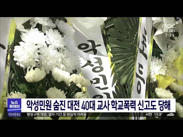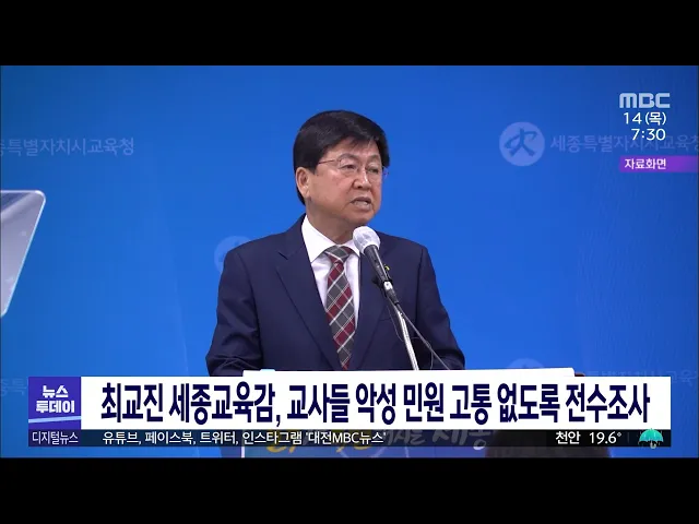 뉴스투데이 뉴스데스크뉴스투데이뉴스데스크 VOD(전체 다시보기)뉴스투데이 VOD(전체 다시보기)유튜브뉴스페이스북 뉴스카카오톡 뉴스인스타그램 뉴스 prev 2023.9.14 - 목요일 next 학부모가 '똥 기저귀'로 얼굴 때려‥/투데이 ◀앵커▶ 대전에서 초등학교 교사가 악성 민원을 호소하며 스스로 목숨을 끊어 논란이 일고 있는 가운데,세종의 한 어린이집 교사가학부모로부터 인분이 묻은 기저귀로얼굴을 맞는 상식 밖의 사건이 벌어졌... 문은선 악성민원 숨진 대전 40대 교사 학교폭력 신고도 당해 학부모들의 악성 민원에 시달리다 숨진 대전의 40대 여교사가 아동 학대로 고소되기 전 같은 학부모로부터 학교폭력 가해자로도 신고됐던 것으로 확인됐습니다.대전시교육청에 따르면, 지난 2019년 12월 ... 뉴스팀 최교진 세종교육감, 악성 민원 고통 '일선 교사 전수 최교진 세종시교육감이 악성 민원으로 고통받는 일선 교사들의 사례를 전수 조사하겠다고 밝혔습니다.최 교육감은 어제(투데이 그제) 세종시에서 열린 교육공동체 회복 협의회에 참석해 민원이나 아동학대... 뉴스팀 철도노조, 내일부터 총파업..물류·수송 차질 우려 전국철도노동조합이 오늘부터 나흘간 총파업에 들어가면서 물류와 수송 차질이 예상됩니다.이번 철도 파업으로 KTX는 평소의 68%,새마을호와 무궁화호는 각각 60% 안팎 수준으로운행하고, 화물열차는 평소... 뉴스팀 추석 앞두고 사과·배 가격 급등/투데이 ◀앵커▶ 추석을 앞두고 과일 가격이심상치 않습니다.올봄 냉해부터 여름철 폭우와폭염, 태풍까지 농작물 피해가 커생산량이 크게 줄었기 때문인데명절 수요까지 겹치면서 가격이 더 뛸 것으로 보여 걱정입... 뉴스팀 흉상 철거 백지화 100만 서명운동 전개 지난 5일부터 무기한 단식 중인 공정사회시민연대 등은 '홍범도장군기념사업회'에서 시작한 독립전쟁 영웅 흉상 철거 백지화를 위한 한민족 100만 서명운동을 대전에서도 추진하기로 했습니다. 이들은 "이... 뉴스팀 서철모 대전 서구청장 벌금 500만원 선고 대전 서구 체육회장 선거에 출마한 후보자에게 사퇴를 종용한 혐의로 기소된 서철모 대전 서구청장에게 벌금 500만 원이 선고됐습니다. 대전지법 형사 6단독 재판부는 어제 열린 결심 공판에서 "유죄는 인... 뉴스팀 황운하, "검찰 표적수사·이장우 시장 역사 무지" 비판 더불어민주당 황운하 대전시당위원장이 어제 대전시의회에서 기자회견을 열고 울산시장 선거개입 혐의로 기소해 검찰이 징역 5년을 구형한 것에 대해, 경찰의 정당한 업무를 표적수사로 둔갑시켰다며 무죄... 뉴스팀 남북교류협력기금 놓고 갈등/투데이 ◀앵커▶정부가 내년 남북교류협력기금을 대폭 삭감하기로 하면서 지방자치단체들도 협력기금 처리 방안을 두고 고심에 빠졌습니다.세종시에선 여당이 관련 조례를 폐지하고 기금을 일반 예산으로 돌리자고... 뉴스팀 충청권 행정협의회 개최..공동건의문 채택 충청권 4개 시도지사가 어제,세종시청에서 충청권 행정협의회를 열고지역 현안을 논의했습니다.이 자리에서 시도지사들은 국회 세종의사당의 조속한 건립과행정수도 명문화, 세종-청주 고속도로의조기 개... 뉴스팀 아산시, 대한민국 1호 온천도시로 선정 아산시가 행정안전부가 지정하는대한민국 1호 온천도시로 선정됐습니다.온천도시는 온천 온도와 성분, 관련 지역축제, 발전 가능성 등을 고려해 행정안전부 장관이 지자체 신청을 받아 지정하는 것으로 아... 뉴스팀 충남도, 청정수소 시험평가센터 첫 관문도 못 넘어 충남도가 삽교역 국비 반영 무산에 따른대안으로 청정수소 시험평가센터를 약속받았다고 밝혔지만, 정작 산업통상자원부 공모로 진행된 해당 사업 1차 평가에서 탈락했습니다.충남도는 내포신도시 첨단산... 뉴스팀 도안구 신설, 금산과 통합?/투데이 ◀앵커▶ 대전의 선거구 증설 요구가 커지고 있습니다. 도안구 신설이나 금산과의 통합, 중대선거구 등 다양한 방안이 제시되고 있는데요. 내년 총선이 7개월 밖에 남지 않아시기상으로, 절차상으로 산 넘... 뉴스팀 2027 하계세계대학경기대회 조직위 공식 출범 2027 충청권 하계세계대학경기대회 조직위원회가 어제세종시 어진동에 마련된 조직위원회 사무처에서 현판식을 열고 공식 활동을 시작했습니다.조직위는 앞으로 충청권 4개 시도, 중앙정부와 협력해 대회... 뉴스팀