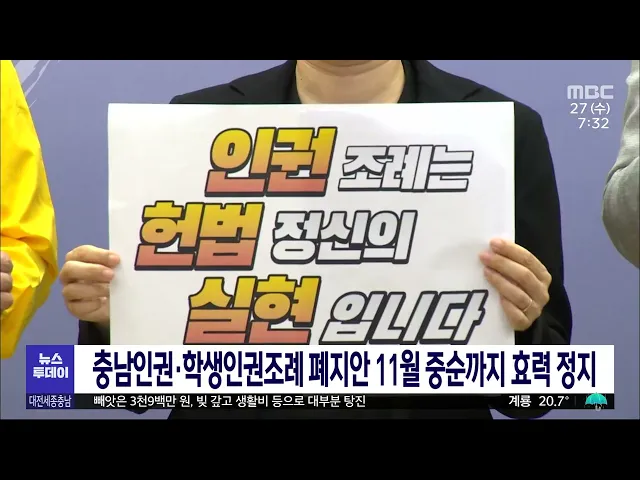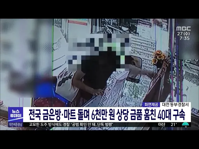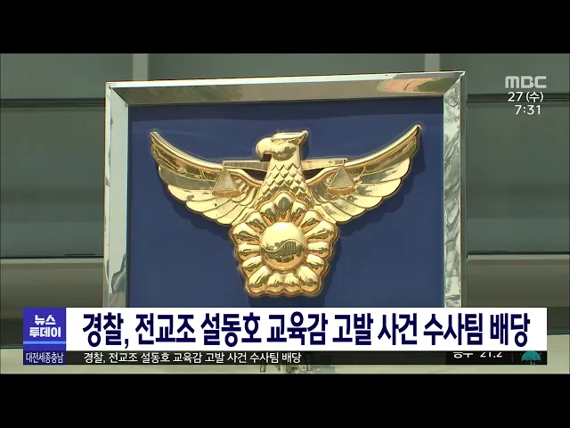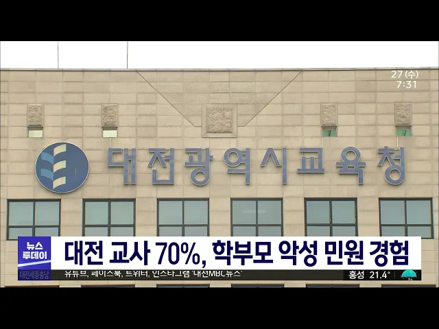 뉴스투데이 뉴스데스크뉴스투데이뉴스데스크 VOD(전체 다시보기)뉴스투데이 VOD(전체 다시보기)유튜브뉴스페이스북 뉴스카카오톡 뉴스인스타그램 뉴스 prev 2023.9.27 - 수요일 next 67년 만의 이사/투데이 ◀ 앵 커 ▶대전역 동광장에는 67년 된 목조 건물이 있습니다.국가등록문화재로 지정된 철도보급창고인데요.대전 역세권 개발 사업으로 철거될 위기에 놓였는데, 원형 그대로 대형 트레일러에 실려바로 옆에... 이승섭 대전 교사 70% 학부모 악성 민원 경험 대전교육청이 지난 15일부터 일주일간 온라인으로 전체 교직원을 대상으로교권 침해 사례를 전수 조사한 결과응답자의 70%가 학부모 등으로부터악성 민원을 경험한 것으로 조사됐습니다.악성 민원을 경험... 고병권 설동호 교육감 피고발 사건 대전경찰청 수사과 조사 대전 전교조가 설동호 교육감을 직권 남용혐의로 고발한 사건에 대해 대전경찰청이 사건을 수사팀에 배당해 본격 조사에 착수했습니다.대전경찰청은 해당 사건을수사과 반부패경제범죄수사대 2팀에 배당하... 고병권 충남인권·학생인권조례 폐지안 효력정지 11월 중순까지 늘어나 충남인권기본조례와 학생인권조례 폐지안의 효력 정지 기간이 오는 11월 중순까지 늘어납니다.조례 폐지 청구 절차와 법적 하자를 주장하며집행정지 신청을 제기한 위기충남공동행동은 대전지법 제2행정부... 김태욱 "빚 2억 갚으려고" 신협 강도 '단독 범행'/투데이 ◀ 앵 커 ▶베트남 도주 한 달여 만에 국내로 송환돼 구속 수사를 받고 있는 대전 신협 강도 사건의 피의자가 사업과 도박 등으로 진 빚 2억 원 때문에범행을 저지른 것으로 확인됐습니다. 또 도주 방식이 ... 박선진 김종민 의원 살해협박 글 올라와, 경찰 수사 착수 더불어민주당 이재명 대표 국회 체포 동의안 가결 이후 비이재명계로 분류돼왔던 민주당 김종민 의원에 대한 살해 협박 글이 온라인 커뮤니티에 올라와 경찰이 수사에 나섰습니다.충남경찰청 사이버수사대... 고병권 전국 금은방·마트 돌며 6천 만원 어치 금품 훔친 40대 구속 대전 동부경찰서는 전국 금은방과마트를 돌며 6천만 원 상당의 금품을 훔친 혐의로 44살 여성을 구속했습니다.이 여성은 지난 4월부터 지난달까지금은방 18곳과 마트 27곳에서 귀걸이와 목걸이, 옷과 가방... 고병권 충남 자살률 전국 1위..10만 명당 27.4명 지난해 충남지역 자살률이 전국에서 가장 높았던 것으로 나타났습니다.통계청 집계 결과 지난해 충남에서 극단적 선택으로숨진 사람은 인구 10만 명 당 27.4명으로 전국 17개 시도 가운데 가장 높았습니다... 이승섭 심뇌혈관 질환, 서산에서 치료받는다/투데이 ◀ 앵 커 ▶충남에서도 의료 취약지역으로 꼽히는서산, 태안 등 서부지역은 급성심근경색 등 위급 환자의 골든타임 확보가 절실했는데요,이들 심뇌혈관 응급환자를 전담할심뇌혈관센터가 서산의료원에 문을 ... 김태욱 서산 문화예술타운 입지 석남동 일대로 결정 서산시 문화예술타운 최종 입지가 옛 석남동 일대로 결정됐습니다.서산문화예술타운은 시 예술의 전당과 시립미술관, 문화원 등 여러 문화시설을 한데 모아 지역 문화예술 거점을 조성하는 사업입니다.시... 김태욱 충남도 연말까지 관광개발사업 9건 마무리 충남도가 연말까지 9건의 관광개발사업 공사를 마무리합니다. 도는 문화체육관광부와 협력해 추진해 온 서부내륙권 광역관광개발사업인논산근대역사문화촌과 부여군 반산저수지 수변공원 등 2건은 연말 개... 김태욱 다누리, 추석 맞아 아폴로호 착륙지·지구 전면사진 공개 한가위 보름달이 뜨는 추석을 맞아 국내 최초의 달 궤도선 '다누리'가 달에서 촬영한 사진들이 공개됐습니다.이번에 공개된 사진은 다누리에 탑재된 고해상도 카메라에 찍힌 것들로, 인류가 처음 달에 착... 김윤미 '대전MBC 창사 59주년' 지역 공공성의 보루/투데이 ◀ 앵 커 ▶시청자 여러분들의 사랑과 응원 덕분에대전MBC가 창사 59주년을 맞았습니다.지난 세월 지역민들의 삶에 다가서고, 지역의 이슈를 공론화하는 보도와 충청의 역사와 문화를 지키고 발전시키는 프... 조형찬 2023 대전MBC 아트&미디어대전 수상자 발표 공주시와 대전MBC가 공동 주최한2023 대전MBC 아트미디어대전에서서양화 부문 조영욱 씨가 출품한'삶의 회상-1950스튜디오에서'가 영예의 대상을 차지했습니다.이번 대전에는 모두 117점이 출품됐으며 최... 문은선 9월 대전MBC 시청자위원회 열려 9월 대전MBC 시청자위원회가 열려 가을을 맞아 개편된 프로그램과 지난 한달간 보도된 뉴스에 대한 비평과 발전 방향에 대한 논의가 이뤄졌습니다. 시청자 위원들은 시사프로그램 신설 등을 통해 지역의 ... 최기웅