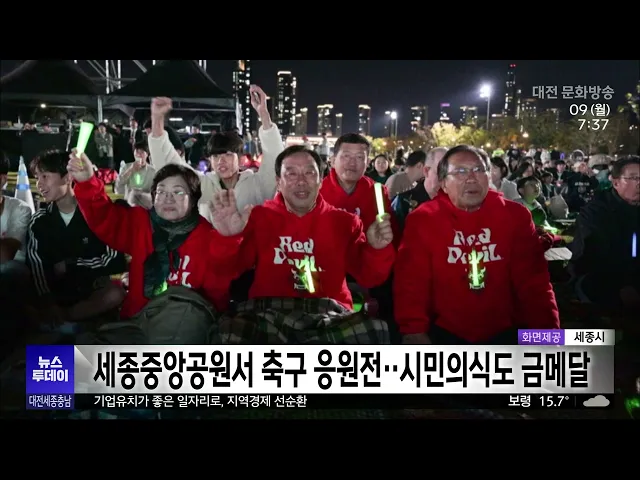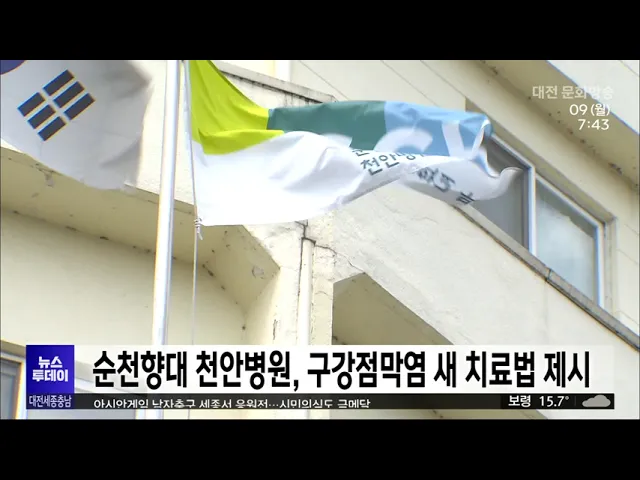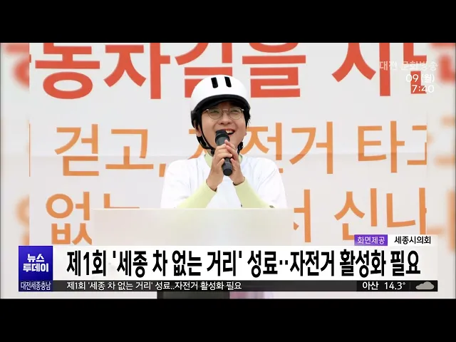 뉴스투데이 뉴스데스크뉴스투데이뉴스데스크 VOD(전체 다시보기)뉴스투데이 VOD(전체 다시보기)유튜브뉴스페이스북 뉴스카카오톡 뉴스인스타그램 뉴스 prev 2023.10.9 - 월요일 next 내포에 국립서해안기후대기센터 개관/투데이 ◀ 앵 커 ▶국립서해안기후대기센터가 내포신도시에 문을 열었습니다.각종 기상 현상을 체험할 수 있어어린이 '기후놀이터'로 손색이 없는데요,충남도가 주력하는 탄소중립 실천에 대한 공감대를 넓히는 데 ... 최기웅 세종서 한글날 정부 경축식.. 지역서 첫 개최 행정안전부가 국경일 지정 이후 서울에서만 개최됐던 한글날 정부 경축식이 지역에서처음으로 내일(9) 세종시 예술의전당에서 열립니다.한글날 정부 경축식은 ‘국어기본법’ 제20조에 따른 정부 기념행사로... 박선진 세종시립도서관, ‘한글과 세종대왕을 품다’ 기획 전시 세종시립도서관이 한글날인 내일(투:오늘)부터 다음 달 5일까지 '세종시, 한글과 세종대왕을 품다'를 주제로 기획 전시를 진행합니다. 이번 전시회에서는 지역 작가인 김순자 한글 캘리그래퍼의 세종과 한... 박선진 아시안게임 남자축구 응원전…시민의식도 금메달 어제(7) 열린 항저우 아시안 게임 남자축구 결승전에 맞춰 세종중앙공원 특설무대에서 진행된 거리 응원전에 시민 천5백여 명이 참여해 열띤 응원을 펼쳤습니다. 이번 응원전은 충청권 일대에서 유일하게 ... 박선진 출장길 고속도로서 사고 목격해 부상자 구조한 경찰관 출장을 가던 경찰관들이 논산시 연무읍 호남고속도로 하행선논산분기점 인근에서 난 교통사고 현장에서신속하게 부상자를 구조한 사실이 뒤늦게 알려졌습니다.대전 둔산경찰서 소속 이준구 경위와 최윤성 ... 박선진 제1회 '세종 차 없는 거리' 성료..자전거 활성화 필요 세종시와 세종시교육청이 주관해 이응교 일대에서 개최된 제1회 세종시 차 없는 거리 행사가 2천여 명의 시민이 참석해 개최된 가운데 자전거 이용 활성화와 연계 필요성이 제기됐습니다. 세종시의회 이순... 조형찬 대전시, '무형문화재 기능 보유자 공개행사' 개최 대전시가 오는 13일부터 사흘간 동구 소제동 대전전통나래관에서 지역 무형문화재 기능 보유자 공개 행사를 진행합니다.이번 행사에서는 단청장과 불상조각장, 대목장 등의 공개 실연이 이어지며 개막식에... 박선진 순천향대 천안병원, 구강점막염 새 치료법 제시 순천향대 천안병원은 방사선치료 합병증인 구강점막염을 효과적으로 개선할 수 있는 치료법을 확인했다고 밝혔습니다.연구진은 손상된 구강점막에 적정 강도의 레이저 광선을 쪼여 신속한 세포 재생을 유... 문은선 보령시, 고향사랑기금사업 아이디어 공모 보령시가 오는 31일까지 고향사랑 기부제 기부금 활용 방안 아이디어를 공모합니다. 공모 분야는 사회적 취약계층의 지원과 청소년의 육성·보호 등 주민의 복리 증진에 필요한 사업으로, 시는 접수된 아이... 박선진 홍성군, 기차 택시 연계한 홍성여행 특가 상품 운영 홍성군이 가을철을 맞아, 대하축제와 광천 새우젓 축제 등을 찾는 관광객들의방문 편의를 위해 기차와 택시를 연계한'홍성 여행' 특가 상품을 운영합니다.이번 특가 상품은, 서울 용산역에서 홍성역까지 ... 문은선