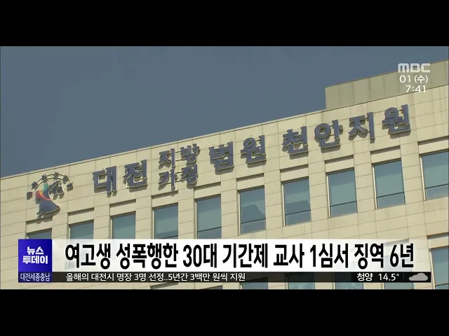 뉴스투데이 뉴스데스크뉴스투데이뉴스데스크 VOD(전체 다시보기)뉴스투데이 VOD(전체 다시보기)유튜브뉴스페이스북 뉴스카카오톡 뉴스인스타그램 뉴스 prev 2023.11.1 - 수요일 next 작황은 좋지만...쌀 값·정부정책이 관건/투데이 ◀ 앵 커 ▶본격적인 수확철을 맞아 가을걷이가 한창인데요.올해는 쌀 작황이 평년 수준인 데다가격도 조금 올랐지만 농민들은형편은 별반 나아지지 않았다고 호소합니다.또 오르던 쌀 값이 다시 하락하고 ... 조형찬 '대전-세종-충북 광역철도' 예타 대상사업 선정 대전에서 세종, 청주공항을 잇는 광역철도가 기획재정부의 예비타당성조사 대상 사업으로 선정돼 예타가 끝나는 내후년 상반기쯤 사업 시행 여부가 최종 결정될 전망입니다. 이 사업은 4조 2,211억 원을 ... 조형찬 천안, 아산 고교 신설 확정..아산 탕정7초교는 재검토 결정 과밀 해소를 위해 천안과 아산에 추진해 온 3개 고등학교 신설이 확정됐습니다.아산충무고와 가칭 천안호수고, 가칭 아산탕정2고 신설은 앞서 과밀 해소 계획과 학급 규모 조정 등으로조건부 승인을 받았... 문은선 '폭행 촬영하며 환호' 천안서 학생 집단폭/투데이 ◀ 앵 커 ▶천안에서 초·중학생 십여 명이또래 여학생 두 명을 집단으로 폭행해경찰이 수사에 나섰습니다.피해 학생은 병원 치료를 받고 있는데현장에 있던 일부 학생들은 폭행 장면을 촬영하며 환호하기도 ... 김광연 '집중호우 침수피해' 공주시 옥룡동, 하수도 정비지역 지정 올여름 집중호우로 도심 전체가 침수된 공주시 옥룡동 일대가 하수도 정비중점관리지역으로 지정돼 하수도 시설이 확충됩니다.환경부는 공주시 옥룡동을 비롯해 21곳을 하수도 정비 중점관리지역을 지정하... 문은선 디스플레이도 첨단기술 우선심사..심사 1년 이상 단축 특허청이, 첨단기술 우선심사 대상을반도체에 이어 디스플레이까지 확대해앞으로 1년간 특허심사 기간이 단축됩니다.대상은 디스플레이 소재·부품·장비, 제조·설계 기술과 직접 관련된 국내생산 출원으로,... 조형찬 '얼굴에 티켓을'..국립중앙과학관 악성민/투데이 ◀ 앵 커 ▶최근 학교 현장의 악성 민원이 사회 문제가 됐는데 각종 서비스를제공하는 감정 노동자의 고충도이에 못지않습니다.관람객들에게 과학을 쉽게 전달하고전시관 체험을 돕는 해설사들이악성 민원을... 박선진 여고생 성폭행한 30대 기간제 교사 1심서 징역 6년형 대전지법 천안지원 형사 1부는 자신이 근무하던 학교 학생을 성폭행한 혐의로 기소된 30대 기간제 교사에게 징역 6년을 선고하고 법정 구속했습니다.피고인은 고등학교 기간제교사로 일하던 지난해 1월 같... 김광연 깡통전세 다가구주택 보증금 빼돌린 30대, 1심서 실형 선고 이른바 깡통전세 건물로 세입자 26명으로부터전세 보증금 26억 5천여만 원을 가로챈 30대 중개 보조인이 1심에서 징역 4년을 선고받았습니다.대전지법 형사5단독 김정헌 판사는 피고인이 주로 경제적 기반... 박선진 우주항공청 막판 진통/투데이 ◀ 앵 커 ▶윤석열 대통령이 국회 시정연설에서예산안과 함께 우주항공청법 통과를국회에 요청했습니다.정부, 여당이 논란이 됐던 항우연 등을우주항공청 직속으로 두는 법제화에 나선 가운데 속도전을 하는... 이승섭 보령시, 농특산물 직거래 택배비 건당 1,500원 지원 보령시가 농특산물 직거래를 위해농·어가와 법인, 단체가 지난 1년간 지출한 택배비를 건당 1,500원씩 지원합니다.지원 대상은 송장일이 지난 1년간인 택배로시는 개별 농·어가는 2백 건,법인과 작목반, ... 김태욱 공주서 오는 2~8일 박찬호기 초등학교 야구대회 박찬호기 전국 초등학교 야구대회가오는 2~8일 공주에서 열립니다.이 대회에는 지난해 우승 팀인온양 온천초등학교를 비롯해 전국에서 34개 팀 선수 800여 명이 참가하며토너먼트 방식으로 우승 팀을 가립... 문은선