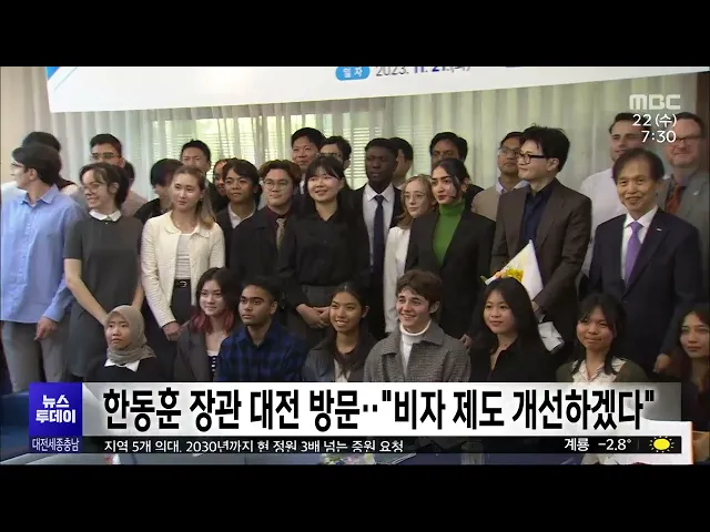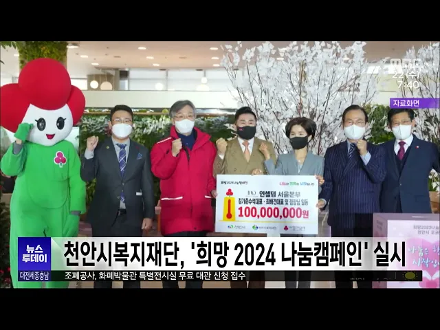 뉴스투데이 뉴스데스크뉴스투데이뉴스데스크 VOD(전체 다시보기)뉴스투데이 VOD(전체 다시보기)유튜브뉴스페이스북 뉴스카카오톡 뉴스인스타그램 뉴스 prev 2023.11.22 - 수요일 next 인요한-이상민 만남.."입당은 아직"/투데이 ◀ 앵 커 ▶더불어민주당에서 비이재명계 인사로 꼽혀 탈당을 저울질하고 있는 이상민 의원이인요한 국민의힘 혁신위원장을 만났습니다.이번 만남과 관련해 일찌감치 다양한 관측이 나오면서 이목이 집중됐... 이승섭 한동훈 법무부 장관 대전 방문 한동훈 법무부 장관이 어제, 대전을 찾아 외국인 사회통합프로그램 평가 대전센터 개소식에 참석하고, 카이스트에 있는글로벌인재비자센터를 둘러봤습니다.한동훈 장관은 카이스트에서 외국인 연구자들을... 이승섭 지역 의대 5곳, 정원 3배 늘려야 보건복지부가 전국 40개 의대 정원확대 수요를 발표한 가운데, 지역 5개 대학도 2030년까지 현재 정원의 최대 3배가량의증원을 요청한 것으로 나타났습니다.정원이 110명인 충남대는 추가로 300명 증원을 ... 고병권 행복청, 세종동 일대 교통 개선 방안 발표 행정중심복합도시건설청이국회 세종의사당과 대통령 제2집무실 등이들어설 세종동 일대 교통 체계를 개선합니다.중앙공원을 지나는 96호선 도로는생태통로를 포함해 공원 접근성을 강화하는친환경 도로로 ... 이승섭 정부 세수 감소에 지방 살림 '적신호'/투데이 ◀ 앵 커 ▶정부의 재정 긴축 기조 속에 지방자치단체들이 내년도 예산 규모를대폭 줄이며 살림에 빨간불이 켜졌습니다.대전과 충남은 지방채 발행 규모를늘리며 허리띠 졸라매기에 나섰고, 일부 지역에선 ... 최기웅 현대제철, 올해 대기오염물질 배출량 목표보다 4백 톤 감축 전망 현대제철 당진제철소의 올해 대기오염물질 배출량이 당초 목표보다 4백 톤가량 적을 것이란 전망이 나왔습니다.당진시에 따르면 그제 열린 환경개선 협의회에서 현대제철은 지난달까지 배출한 대기오염물... 김광연 백제병원 지역응급의료센터 시설개선공사 논산 백제병원 지역응급의료센터가 시설개설공사를 마치고, 출산·육아 맞춤형진료가 가능한 응급의료센터로 재단장했습니다.논산시와 백제병원은 40년 이상 된 응급의료센터에 소아 전용 응급구역과 소아 ... 조형찬 충남대 총장 선거 구성원 투표 반영 비율 확정 충남대학교 총장 선거를 위한 구성원의투표 반영 비율이 확정됐습니다.충남대는 대학평의원회와 학무회의를잇따라 열고, 교원 69%, 직원 18%, 조교 4.5%,학생 8.5%의 투표 반영 비율을 확정했습니다.이는 ... 고병권 인공위성이 분석한 북한 경제 실상은?/투데이 ◀ 앵 커 ▶국제사회에서 폐쇄적인 북한의 경제 실상은통계자료도 턱없이 부족해 좀처럼 알기 어려운데요.전 세계를 촬영한 위성영상을인공지능으로 분석하는 기술이 국내를 포함한 국제 공동 연구진에 의... 김윤미 천안시, '보호자의 보호자' 역할 아동·청소년 발굴 지원 천안시가 중증질환 등으로 '보호자의 보호자' 역할을 하는 만 18살 미만 취약계층 아동·청소년을 발굴해 지원합니다. 시는 아픈 보호자를 대신해 가사 활동에 시달리는 등 어려움을 겪는 아동이 증가하고 ... 김광연 천안시복지재단, 내년 1월까지 희망 2024 나눔캠페인 실시 천안시복지재단이 내년 1월까지 연말집중모금 캠페인 '희망 2024 나눔캠페인'을 실시합니다. 취약계층 지원과 복지사각지대를 없애기 위해 마련된 이번 캠페인은 천안시복지재단 누리집에서 참여할 수 있... 김광연 대전보환연, 겨울 다소비 수산물 유해물질 검사 강화 대전시보건환경연구원은 겨울철 소비가 증가하는 수산물과 수산가공식품을 대상으로 동물용 의약품과 중금속, 식품첨가물 등의 유해 물질 검사를 강화합니다. 검사 대상은 생식용 굴과 과메기, 마른 김, ... 조형찬 충남에 한국광기술원 분원 온다/투데이 ◀ 앵 커 ▶LED와 레이저 센서 등 국내 유일의 광융합기술 전문연구기관인 한국광기술원이 오는 2028년 개원을 목표로 아산에 분원을 설치하기로 약속했습니다.내년 하반기 디스플레이 메카 충남에서 최대 ... 김태욱 민주당 충남도당 총선기획단 구성..복기왕 단장 더불어민주당 충남도당이 총선기획단을 꾸려 내년 22대 총선 충남지역 전석 승리를 통한 민생 회복을 목표로, 지역별 정책 현안 발굴과 공약 수립 지원 활동에 돌입했습니다.기획단은 복기왕 도당위원장이... 조형찬 조폐공사 화폐박물관 특별전시실 무료 대관 신청 접수 조폐공사 화폐박물관이 특별전시실을 내년에 무료로 대관해 주기로 하고, 지역 문화 예술인들의 신청을 받습니다. 희망자는 다음 달 8일까지 화폐박물관 홈페이지에서 신청서를 내려받아메일로 신청하면 ... 조형찬 코레일, 충청권 광역철도 디자인 VR 공개 코레일이 대전시와 충남도 등유관기관을 초청해 충청권 광역철도에 도입할차량의 디자인을 가상현실로 공개했습니다.코레일은 차량 안팎의 디자인을 가상현실로공개하고, 유관기관으로부터 새로운 전동열... 이승섭