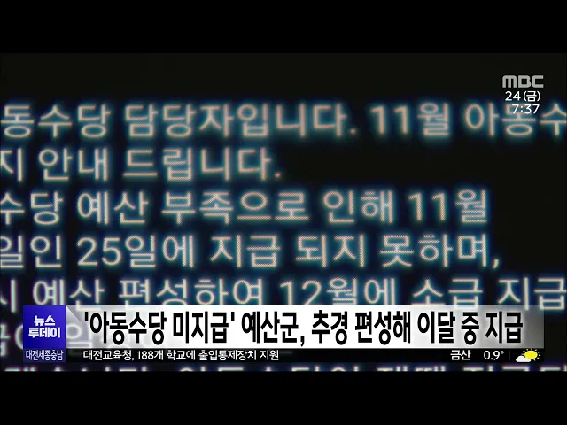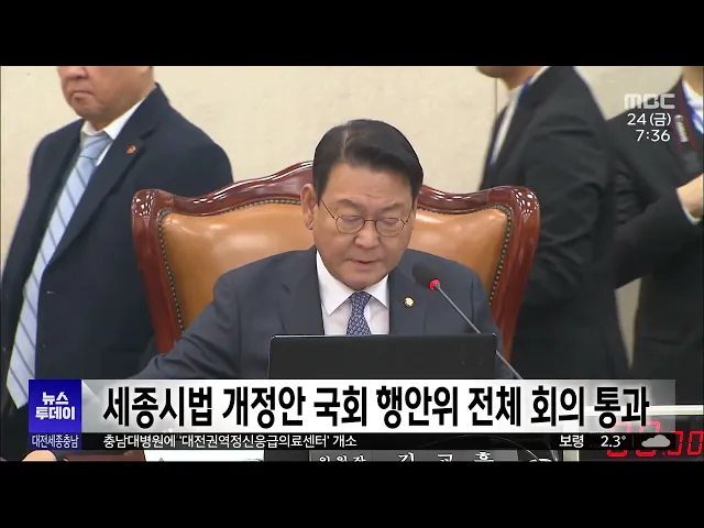 뉴스투데이 뉴스데스크뉴스투데이뉴스데스크 VOD(전체 다시보기)뉴스투데이 VOD(전체 다시보기)유튜브뉴스페이스북 뉴스카카오톡 뉴스인스타그램 뉴스 prev 2023.11.24 - 금요일 next 대전 교사 피습 사건 100일…현장은 그대로/투데이 ◀ 앵 커 ▶지난 8월 대전의 한 고등학교에서20대 남성이 휘두른 흉기에교사가 크게 다치는 사건이 발생한 지 벌써 100일이 훌쩍 지났습니다.사건 직후 교육당국은 재발 방지를 위해 이런저런 대책을 내놨는... 뉴스팀 "명백한 살해 의사"..징역 18년 선고/투데이 ◀ 앵 커 ▶고등학교에 들어가 당시 교사에게흉기를 휘두른 20대에게 법원이징역 18년을 선고했습니다.재판부는 정신질환이 범행에 영향을 미친 것으로 보이지만 명백한 살해 의도 등을 고려할 때중형 선고... 박선진 세종시법 개정안 국회 행안위 전체 회의 통과 세종시의 재정 특례를 오는 2026년까지 연장하는 내용을 담은 세종시법 개정안이 어제(23), 국회 행정안전위원회 전체 회의를통과했습니다.더불어민주당 강준현 의원이 대표 발의한개정안이 제정되면 세입... 이승섭 '아동수당 미지급' 예산군, 추경 편성해 이달 중 수당 지급 예산군의 늑장 행정으로 아동 2백여 명에 대한 이달 아동수당 지급이미뤄지게 됐다는 대전MBC 보도와 관련해 예산군이 긴급 추경을 편성해 예정대로 아동수당을 지급하기로 했습니다.군은 어제 관련 회의... 김태욱 인요한 충남 방문.. 지역 총선 구도에도/투데이 ◀ 앵 커 ▶국민의힘 혁신위원회가 출범 한 달을 맞은 가운데인요한 혁신위원장이 최근 대전을 방문한 데 이어 충남을 찾았습니다.김태흠 충남지사는 당 지도부에쓴소리를 하며 혁신위에 힘을 실어총선을 앞... 김태욱 세종시선관위, 총선 예비 후보자 등록 설명회 세종시선거관리위원회가 어제,선관위 대회의실에서 내년 국회의원 총선거예비 후보자 등록 설명회를 열었습니다.이번 설명회에는 입후보 예정자와 정당 관계자 등 30여 명이 참석한 가운데신고 사항과 선... 이승섭 충남대 총장 임용후보자 1순위 김정겸 교육학과 교수 선출 충남대 신임 총장 임용후보자 1순위로 김정겸 사범대 교육학과 교수가 선출됐습니다.어제(23) 충남대에서 열린총장 후보자 선거 투표에서 4명의 후보 가운데1위로 결선에 오른 김정겸 교수는2차 투표에서 ... 고병권 예산 삭감에 존폐위기 '지역화폐'/투데이 ◀ 앵 커 ▶대전시가 내년도 예산에 지역화폐 예산을 전혀 편성하지 않기로 했습니다. 세종시도 관련 예산을 올해보다 절반 수준으로 줄였는데요,정부 예산도 전액 삭감될 상황이라지역화폐가 존폐 위기에 ... 문은선 대전 주택매매 아파트 비중 80% 넘어..역대 최고치 올해 대전의 주택매매에서 아파트가 차지하는 비중이 80%를 넘기며 역대 가장 높은 수준을 기록했습니다.한국부동산원의 주택유형별 거래 현황을 보면,올해 9월까지 대전 지역 주택 매매량은 만 2천여 건... 문은선 천안시, 3년간 상수도 요금 단계적 인상 천안시 상수도 요금이 내년부터 3년간단계적으로 인상됩니다.상수도 요금은 내년 2월 고지분부터3년간 톤당 평균 66.5원씩 인상하고가정용은 누진제를 폐지해 4인 가족이 월 20톤을 사용한다고 가정할 때 ... 문은선