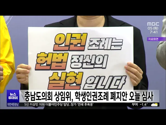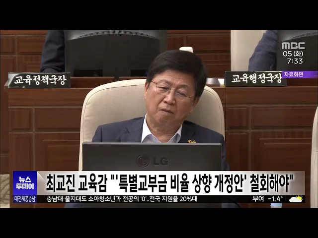 뉴스투데이 뉴스데스크뉴스투데이뉴스데스크 VOD(전체 다시보기)뉴스투데이 VOD(전체 다시보기)유튜브뉴스페이스북 뉴스카카오톡 뉴스인스타그램 뉴스 prev 2023.12.5 - 화요일 next 소아과 전문의가 없어서‥전국 1호 소아응급센터도 축소 운영/투데이 ◀ 앵 커 ▶국가 지정 1호, 충남의 유일한소아전문응급센터인 순천향대병원소아응급센터가 축소 운영에 들어갔습니다.진료할 의사가 부족해7살 미만 어린 환자를 당분간 받지않기로 한 겁니다.김광연 기자가... 김광연 최교진 교육감 "'특별교부금 비율 상향 개정안' 철회해야" 최교진 세종시 교육감이지방교육재정교부금 가운데 교육부가 특별 목적에 사용할 수 있는 비율을올리는 개정안이 추진되는 것과 관련해 "지방 교육의 어려움을 가중하는 법이라며 당장 철회해야 한다"고 ... 고병권 "공연 수준 떨어져" 세종 빛 축제 미디어파사드 중단 세종시가 지난 2일 개막한 '2023 세종 빛 축제'의 핵심 볼거리인미디어파사드 공연을 중단했습니다.최민호 세종시장은 오늘 기자 간담회를 열어미디어파사드 공연의 수준이 기대에 못 미쳐중단하기로 했고... 이승섭 중구 부구청장 인사 "시대착오적 발상"/투데이 ◀ 앵 커 ▶김광신 전 대전 중구청장이공직선거법을 위반해 낙마한 뒤후폭풍이 거셉니다.대전시가 구청장의 권한을 대행할 부구청장을 새로 임명했는데, 이를 두고 관선 시대로 역행하는 인사라는 비판이 나... 이승섭 서산시의회, 석유화학단지 주변지역 지원법 신속 제정 촉구 서산시의회가 어제 본회의를 열고석유화학단지 주변지역 지원법 신속 제정을촉구하는 건의안을 채택했습니다.건의안을 대표 발의한 김용경 의원은최근 5년간 대산석유화학단지에서는33건의 사고가 발생했... 김태욱 천안시, 내년부터 노인돌봄 대상자 20% 확대 고령화와 가족관계망 악화 등으로 인한 고독사 등 노인 문제가 늘어남에 따라 천안시가 내년부터 노인돌봄 대상자를 20% 확대합니다.시는 어제 읍면동 노인복지 담당자, 노인돌봄 수행기관 전담 인력 등과... 김광연 당진시 장애인 콜택시 야간 운행 시작..24시간 운영 당진시는 교통약자의 이동 편의를 높이기 위해 이달부터 특별교통수단인 장애인 콜택시를 24시간 확대 운영합니다.야간 운행은 차량 1대가 전담해 관내 2km까지 기본요금 1,400원, 최대 이용 요금 3,200원... 김광연 '이상민 탈당' 유성을 시계제로/투데이 ◀ 앵 커 ▶내년 국회의원 선거를 4개월 앞두고5선의 이상민 의원이 더불어민주당을 탈당하면서 해당 지역구인 대전 유성을이 최대 격전지로 꼽히고 있습니다.이 의원은 국민의힘 입당 후 재출마가 유력한 ... 김지혜 박영순 의원 "정정당당하게 공천 경쟁하겠다" 대전 대덕구를 지역구로 둔더불어민주당 박영순 의원이 내년 총선에서 박정현 최고위원과 공정하고 정정당당하게 공천 경쟁을 하겠다고 말했습니다.박영순 의원은 대전시의회에서 기자들과 만나 박 최고위... 이승섭 충남도의회 교육위, 오늘 학생인권조례 폐지안 심사 충남도의회 교육위원회가 오늘충남학생인권조례 폐지안을 심사하는 등 본격적인 조례 폐지 절차에 나섭니다.도의회는 전체 47명 가운데 국민의힘이 35명으로 과반을 넘어오는 15일 본회의에서 폐지 가능성... 김태욱 주차계도·방범순찰 자율주행차가 '척척'/투데이 ◀ 앵 커 ▶자율주행차가 실제 도로를 달리는 일,이제는 낯설지 않죠.자율주행 자동차 시범운행 지구로 지정된 내포신도시에 전국 최초로 주정차 계도와 방범·순찰 업무에 자율주행차가 투입됐습니다.김태욱... 김태욱 이중근 부영그룹 회장, 카이스트 기숙사 리모델링에 200억 원 기부 이중근 부영그룹 회장이이공계 인재 양성에 도움이 되기를 바란다며카이스트에 기숙사 리모델링 기금으로 200억 원 상당을 기부했습니다.이에 따라 카이스트는 시설이 너무 낡아 운영을 중단한 대전 본원... 김윤미 방송통신위원회 '2022 방송평가'서 대전 MBC TV 계열사 중 1위 대전문화방송이 '2022년도 방송평가'에서 전국 16개 지역 MBC 가운데 1위에 올랐습니다. 대전문화방송은 지상파방송사업자 지역 MBC TV 부문 방송평가에서 600점 만점에 488.80 점을 받았으며, 자체 심의... 최기웅 논산 양촌곶감축제 8일 개막..감 요리 '감스토랑' 첫선 논산의 겨울철 대표 특산품 축제인 양촌곶감축제가 오는 8일 개막해양촌리 체육공원에서 사흘 동안 이어집니다.축제에서는 곶감 판매장을 비롯해곶감으로 만든 다양한 음식들이 선보이는요리경진대회가 펼... 김윤미