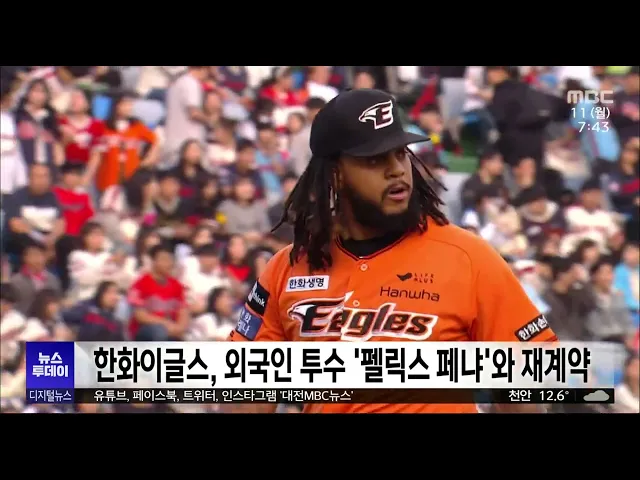 뉴스투데이 뉴스데스크뉴스투데이뉴스데스크 VOD(전체 다시보기)뉴스투데이 VOD(전체 다시보기)유튜브뉴스페이스북 뉴스카카오톡 뉴스인스타그램 뉴스 prev 2023.12.11 - 월요일 next 목원대, 웹툰 교육 명가 '재확인'/투데이 ◀ 앵 커 ▶웹툰을 원작으로 한 드라마나 영화가꾸준히 사랑받으면서 웹툰 작가를꿈꾸는 학생들이 많은데요. 대전에서 처음으로 웹툰학과를 개설했던목원대가 최근 주요 공모전을 휩쓸면서 웹툰 교육의 명가... 최기웅 아산 산란계 농장 고병원성 조류독감, 주변 37개 농가 이동제한 그제 아산시 선장면의 한산란계 농장에서 발생한 조류 인플루엔자가H5형 고병원성으로 확인되면서,해당 농장 닭이 살처분되고 10km 방역대 농가에 이동 제한 조처가 내려졌습니다.충남도는 해당 농장 닭 3... 고병권 내일부터 대전,세종,충남 국회의원 예비 후보자 등록 시작 내년 4월 10일제 22대 국회의원 선거를 앞두고 내일부터 대전과 세종 충남에서 예비 후보자 등록이 시작됩니다. 예비 후보자로 등록하려면,관할 선거관리위원회에 가족관계증명서 등 피선거권에 대한 증명... 고병권 세종시 '지역서점 인증제' 도입 세종시가 지역 서점을 살리기 위해, '지역 서점 인증제'를 도입합니다.인증을 받은 서점은도서를 구입할 공공기관과 우선 계약할 수 있는 권리가 생기며,인증 조건은 세종에서 6개월 이상 영업하고방문용 ... 뉴스팀 세종시, 주정차 과태료 전자고지 서비스 시범 세종시가 주정차 위반 과태료 고지서를 휴대전화로 받아볼 수 있는'모바일 전자고지 서비스'를 오늘부터 이달 말까지 시범운영합니다.시민들은 별도의 신청 절차 없이카카오톡이나 문자로 고지서가 오면,... 뉴스팀 한화이글스, 외국인 투수 '펠릭스 페냐'와 재계 프로야구 한화이글스가 도미니카공화국 출신의 오른손 투수 펠릭스 페냐와 재계약했습니다.계약 조건은 계약금 20만 달러에 연봉 65만 달러, 인센티브 20만 달러 등 최대 105만 달러에 달합니다.페냐는 지... 뉴스팀 충남 최우수 브랜드 쌀 '서천 길산내쌀' 선정 충남에서 가장 우수한 쌀은 서천군의 '길산내쌀'인 것으로 나타났습니다.충남도 농업기술원이 지난 2월 응모한 브랜드 쌀 26종을 대상으로품질 관리 우수 브랜드를 조사한 결과, '길산내쌀'이 1위로 뽑혔... 고병권 대전시 건축행정평가 전국 1위 차지 대전시가국토교통부가 실시한 건축 행정평가에서전국 8대 특·광역시 가운데 1위를차지했습니다.건축 행정평가는국토교통부가 지자체 건축 행정 절차의 합리성안전 관리, 행정 개선 노력 등을26개 지표를 ... 고병권