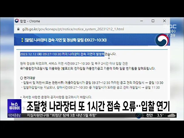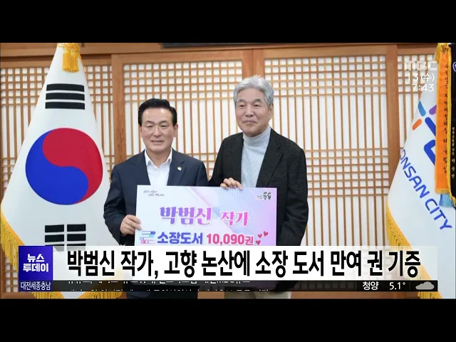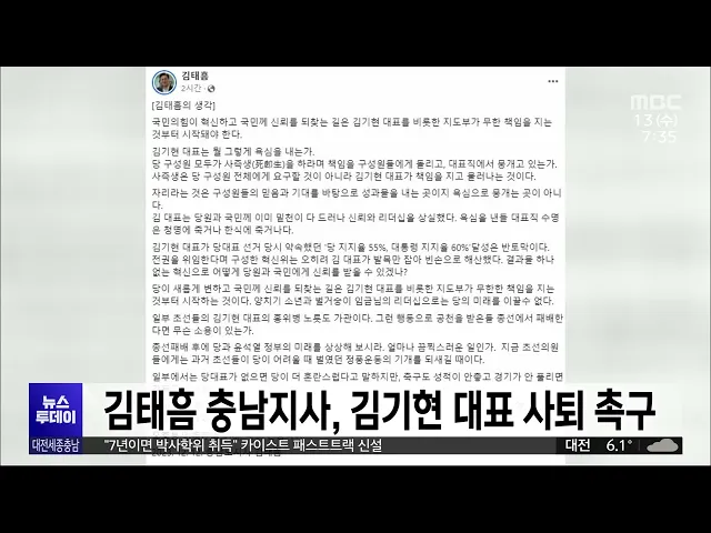 뉴스투데이 뉴스데스크뉴스투데이뉴스데스크 VOD(전체 다시보기)뉴스투데이 VOD(전체 다시보기)유튜브뉴스페이스북 뉴스카카오톡 뉴스인스타그램 뉴스 prev 2023.12.13 - 수요일 next 총선 레이스 시작..예비후보 등록/투데이 ◀ 앵 커 ▶내년 4월 열릴 국회의원선거가 120일 앞으로 다가왔습니다.어제부터 예비 후보자 등록이 시작돼본격적인 선거전이 시작됐는데요.첫날부터 많은 후보들이 예비후보로 등록해뜨거운 총선 열기를 엿... 이승섭 김태흠 충남지사 김기현 대표 사퇴 촉구 김태흠 충남지사가 김기현 국민의힘 대표의사퇴를 촉구하고 나섰습니다.김 지사는 SNS에 국민의힘이 혁신하고국민께 신뢰를 되찾으려면 김기현 대표를비롯한 지도부가 무한 책임을 지는 것부터시작해야 한... 문은선 '선거법 위반' 혐의 박상돈 천안시장에 항소심도 실형 구형 지난해 지방선거에서 공직선거법을 위반한 혐의로 기소돼 1심에서 무죄를 선고받은 박상돈 천안시장에게 검찰이 항소심에서 실형을 구형했습니다.검찰 측 항소로 대전고법에서 열린 박 시장의 항소심 결심... 김윤미 전신주 들이받아 960여 곳 정전…피해 속출/투데이 ◀ 앵 커 ▶어제 새벽 대전에서청소차가 전신주를 들이받아일대가 10시간가량 정전됐습니다.등교했던 학생들은 불이 안 들어와 집으로 돌아가야 했고음식점과 가게는 냉동식품이 녹고카드 결제가 안 돼 하루... 뉴스팀 조달청 나라장터 또 1시간 접속 오류..입찰 연기 오늘 오전 9시 27분,조달청의 국가종합전자조달시스템인 나라장터에 오류가 생겨 접속이 지연됐습니다.조달청은 한 시간 만인 오전 10시 30분에서비스를 정상화하고 접속이 지연됐던 시간의입찰 건을 모두... 이승섭 천안시, 제6산단 조성사업 대체 주간사 공개 모집 천안시가 민관합동 방식으로 조성하는천안 제6 일반산업단지 추진이 부진하자프로젝트 파이낸싱 대출이 가능한대체 주간 건설출자자를 공개 모집합니다.공모에 참여할 업체는 오는 29일까지참가의향서를 ... 문은선 국민은행 콜센터 상담사 240명 해고/투데이 ◀ 앵 커 ▶연말을 앞두고 콜센터 비정규직 상담사 240여 명이 졸지에 직장을 잃게 생겼습니다.KB 국민은행 측이 상담 건수가 줄었다며콜센터 2곳과 계약을 해지하면서 이들에게 해고 통보를 한 건데요,고... 고병권 대전시, 겨울철 호흡기감염병 주의보 계절 독감으로 불리는 인플루엔자를비롯해 다양한 호흡기 감염병이 동시 유행해 방역 당국이 개인 위생 수칙 준수를 당부하고 나섰습니다.대전시는 인플루엔자와 발작적 기침을 동반하는 백일해는 예방접... 조형찬 대전시, 변이바이러스 분석 항목 1개->8개로 확대 대전보건환경연구원이 감염병 세계화와호흡기 질환 확산 대응을 위해변이 바이러스 분석 항목을 기존 1개에서 8개로 확대했습니다.기존에는 코로나19만 했지만최근 인플루엔자, 아데노바이러스, 보카,리노... 문은선 박범신 작가 고향 논산에 소장 도서 10,090권 기증/대전MBC 겨울환상, 은교 등 수많은 흥행작품을 집필하며 '영원한 청년작가'로 불리는논산 출신의 박범신 작가가 소장 도서 만여 권을 논산시 공공도서관에 기증했습니다. 기증 도서는 만 90권으로 시가로는 1억 5... 조형찬 "7년이면 박사학위 취득" 카이스트 패스트트랙 신설 카이스트가 대학 입학 후 7년이면 박사학위를 취득할 수 있는 패스트트랙,이른바 '20대 박사 육성 프로그램'을 신설해 오는 2025년부터 도입합니다.이 프로그램은 학사과정을 3년 안에 마무리하고 석박사 ... 김윤미