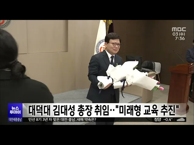뉴스투데이 뉴스데스크뉴스투데이뉴스데스크 VOD(전체 다시보기)뉴스투데이 VOD(전체 다시보기)유튜브뉴스페이스북 뉴스카카오톡 뉴스인스타그램 뉴스 prev 2024.1.3 - 수요일 next 여야, 새해 충청권 표심 다지기/투데이 ◀ 앵 커 ▶'총선의 해'답게, 새해 시작부터캐스팅보트인 충청권 표심을 공략하기 위한 여야의 움직임이 바쁩니다.한동훈 국민의 힘 비상대책위원장이새해 전국 순회의 첫 일정으로 어제대전을 찾았고, 더불... 김지혜 총선 석 달 앞으로..관전 포인트는?/투데이 ◀ 앵커 ▶올해 2024년의 가장 큰 이벤트 중 하나가 바로 22대 국회의원 총선거입니다.현 정부 지지도와 세대교체론, 선거 제도 변화 등 충청권 총선 결과에 영향을 줄 요인들이 많을 텐데요.신년기획 첫 ... 고병권 김석필 천안시 부시장 취임.."새로운 시대 함께 열어가겠다" 충남도 여성가족정책관과 경제실장 등을 역임한 김석필 천안시 부시장이 취임했습니다.김 부시장은 "시민의 목소리를 가까이에서 듣고 역량과 경험을 총동원해 박상돈 시장을 뒷받침해 천안의 새로운 시대... 김광연 대덕대 김대성 총장 취임...재무건전성 확보 주력 대덕대 16대 김대성 총장이 취임식을 갖고 4년 임기를 시작했습니다.김 총장은 취임사에서 대학의 전면적인쇄신과 개혁이 시대적 요구라며, 교육환경 개선을 통한 미래형 교육으로학생들이 망설임 없이 지... 문은선 순천향대 천안병원 박형국 교수, 22대 병원장 취임 순천향대 천안병원 신경과 박형국 교수가 제 22대 신임 병원장으로 취임했습니다.30년 동안 신경과 교수로 지내며 뇌전증과 뇌졸중 치료에 전념해 온 박 병원장은 "교육과 연구, 진료가 유기적으로 공존하... 김광연 민선 8기 3년 차.. 새해 약속은?/투데이 ◀ 앵 커 ▶각각 민선 8기와 4기 3년 차를 맞는대전시와 충남도 그리고 세종시 등지자체들도 새해 업무를 시작했습니다.경제도시와 행정수도 완성, 탄소중립경제 선도 등 뿌린 씨앗을 성과로 거두는 해를 약... 김태욱 출연연도 새해 시무식..기초연, 융합과학 연구클러스터 출범 정부출연연구원 등 대덕특구 내 연구기관도 갑진년 새해를 맞아 어제잇따라 시무식을 열고 예산 삭감 등 어려운 연구 환경 속에서도 새로운 각오를 다졌습니다.한국핵융합에너지연구원은 시무식을 갖고 ... 김윤미 청와대 세종 집무실 연구 용역 마무리..행복청 이달 중순 발표 예정 세종시에 대통령 제2집무실을 설치하는 연구 용역이 마무리돼 이달 중순 발표될 것으로 보입니다. 행정중심복합도시건설청은 용역사로부터 지난주 연구 결과를 받았으며이달 안에 새해 업무 브리핑을 열고... 고병권 충남도, 유치 대상 공공기관 44곳으로 확대·조정 오는 4월 총선 이후 공공기관 지방 이전 논의가 확대될 것으로 예상되는 가운데충남도가 충남혁신도시 중점 유치 대상 공공기관을 기존 34곳에서 44곳으로 확대·조정했습니다.도는 기관 우선 이전권 요구 ... 김태욱 새해가 왔지만..전세사기 피해는 진행형/투데이 ◀ 앵 커 ▶새해를 마냥 희망차게 맞이할 수 없는 사람들이 있습니다.바로 전세사기를 당한 피해자들인데요.보상도, 대책도 마땅치 않아피해자들의 근심은 해가 바뀌어도 그대로입니다.이승섭 기자입니다.◀ ... 이승섭 세종 청년인구, 전체 대비 31.5% 차지 2023 세종시 청년 통계에 따르면 젊은 도시로 꼽히는 세종시의 청년 인구는 2022년 말 기준 12만 907명으로 전체 인구의 31.5%를 차지하는 것으로 조사됐습니다. 또 청년들은 신도시인 동 지역에 주로 거... 박선진 카이스트 등 4대 과기원, 영재학교도 조기 진학 허용 카이스트를 비롯한 4대 과학기술원에 내년부터 영재학교 재학생들도 조기 진학이 가능해집니다.과학기술정보통신부는 그동안 일반고와 과학고 학생만 가능했던 과학기술원 조기 진학 대상을 영재학교로 확... 김윤미 농협 충남본부, 홍예공원 도민 참여 숲 예금상품 출시 농협 충남세종본부가 내포신도시 홍예공원 도민 참여 숲 기금 조성을 위한 예금상품을 출시했습니다.예금 계좌는 개인은 100만 원 이상, 법인은 100만 원에서 10억 원 이하로농협 충남본부에서 개설할 수 ... 김태욱