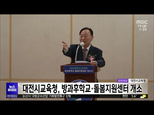 뉴스투데이 뉴스데스크뉴스투데이뉴스데스크 VOD(전체 다시보기)뉴스투데이 VOD(전체 다시보기)유튜브뉴스페이스북 뉴스카카오톡 뉴스인스타그램 뉴스 prev 2024.1.19 - 금요일 next 대전 도심융합특구 기대와 과제/투데이 ◀ 앵 커 ▶수도권 쏠림과 지방소멸 위기 극복을 위해 새해 도심융합특구와 기회발전특구 등 이른바 4대 특구를 통한 지방시대 개막이 새로운 화두로 떠오르고 있습니다. 대전 MBC 뉴스는 오늘 4대 특구의 ... 김지혜 기획특구 소멸지역에 기회될까?/투데이 ◀ 앵 커 ▶수도권 쏠림에 더해 지방소멸 위기까지 겪는 지역은 무엇보다 청년층을 잡아둘 좋은 일자리가 필요합니다. 이에 입주기업들에게 파격적인 세제혜택과 규제완화 등을 담은 기회발전특구도 추진 ... 조형찬 행복청, 입법·국정시설 들어설 세종동 일대 특별관리구역 추진 행정중심복합도시건설청이국회 세종의사당과 대통령 제2집무실,국립박물관단지가 들어설 세종시 세종동을 특별관리구역으로 지정하는 방안을 추진합니다.행정도시특별법은 국가 주요 기능이 들어서거나 시... 문은선 충남도의회, 소아청소년과 의료공백 예방 조례안 입법예고 충남도의회가 소아청소년과 의료공백을최소화하기 위한 조례안을 입법 예고했습니다.도의회 이현숙 의원이 대표 발의한해당 조례안은 도지사가 소아청소년과 의료 개선에 관한 시책을 수립·시행하고 소아... 문은선 대전 진잠·복용파출소 통·폐합 없어 경찰청이 인력과 장비를 효율적으로 운영하기위해 지구대와 파출소 통폐합을 추진중인 가운데 대전에서 폐쇄 대상으로 거론됐던 진잠파출소가 운영을 계속 이어가게 됐습니다.더불어민주당 조승래 의원은 ... 이승섭 보령 앞바다서 어선 전복 6명 구조.."에어포켓 덕에 생존"/투데이 ◀ 앵 커 ▶오늘(투:어제) 새벽 충남 보령시 장고도앞바다에서 선장 등 선원 6명이 탄 어선이 뒤집어지는 사고가 났습니다.5명은 바다에 표류 중이었고마지막 한 명은 배에 갇혀 있었는데공기주머니 즉 에어... 김태욱 KAIST 올해 창업기업 100개 목표…각종 지원 확대 카이스트가 올해 창업기업 100개 배출을 목표로 창업 지원을 확대합니다.이에 따라 우수 교원 창업기업을 대상으로 신규 컨설팅을 진행하고 초기 단계 스타트업이 짧은 기간에 대기업 수준의 시제품을 제... 문은선 대전시교육청, 방과후학교·돌봄지원센터 개소 대전시 삼성동에 있는 현암초등학교에대전시교육청 방과 후 학교·돌봄 지원센터가문을 열었습니다.센터에서는 늘봄학교 전담 인력을 위한연수를 실시하고, 방과 후 학교와 관련한회계 관리와 맞춤형 상담... 이승섭 대전 제2시립미술관 등 先 디자인 後 사업계획 적용 대전시가 제2시립미술관 등 새로 짓는 건물에 디자인을 먼저 고려하는기획 디자인 방식을 적용하기로 했습니다. 기획 디자인은 디자인 비용을 자유롭게 배정할 수 있어 명품 건축물을 만드는 데 필수적인 ... 고병권 50년 만에 최고 기온..기후 위기 '성큼'/투데이 ◀ 앵 커 ▶최근 딸기 값이 비싼 이유 중의 하나가기후 위기라는 사실 알고 계시나요?겨울답지 않은 포근한 날씨가우리의 일상생활에도 악영향을 끼친 건데요.지난해, 대전과 세종, 충남 지역은 최근 50년 ... 뉴스팀 대전시, 전국 최초 '서예 진흥원' 수탁기관 공모 대전시가 오는 3월 전국에서 처음으로문을 여는 서예 진흥원 운영 수탁기관을 공모합니다.서예진흥원은 중구 선화동 테크노파크에 들어서며, 위탁 기간은 오는 3월부터 2026년 12월까지, 올해 사업비는 4... 고병권 대전 갑천서 멸종위기 맹금류 2종 처음 확인 대전환경운동연합은 갑천에서 멸종위기종인 잿빛개구리매와 큰말똥가리가대전에서는 처음으로 확인됐다고 밝혔습니다.두 종 모두 국내 전역에서 활동하는멸종위기 야생생물 2급 맹금류로,환경운동연합은 ... 문은선 천안 봉주로 배드민턴장 건립사업 문체부 지원사원 선정 천안 봉주로 배드민턴장 건립사업이문화체육관광부 주관 기초생활체육저변확산 지원사업에 선정됐습니다.이 사업은 천안시 성거읍 소우리에 배드민턴 전용 실내체육관을 건립하는것으로, 배드민턴 코트 16... 문은선 김돈곤 청양군수, 충남도 산림자원연구소 반드시 유치하겠다 김돈곤 청양군수가 산림자원연구소 유치를 올해 첫 과제로 삼아 추진하겠다고 밝혔습니다.김 군수는 정례 브리핑에서군 전체 면적의 66%가 임야이고 칠갑산을 중심으로 다양한 산림자원을 보유한 청양군이... 김태욱 예산군, 둘째 자녀부터 대학 입학축하금 2백만 원 지원 예산군이 둘째 자녀부터 대학 입학축하금 2백만 원을 지원합니다.군은 지난해 조례 개정에 따라 다자녀가구 기준을 3자녀에서 2자녀 이상, 막내가 20살 이하인 가구로 완화해 지원 범위가 확대됐다고 밝혔... 김태욱