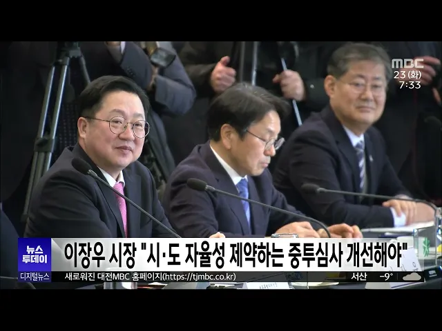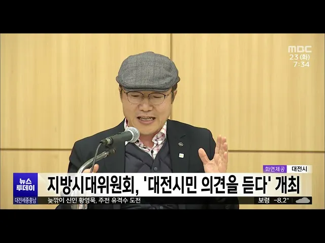 뉴스투데이 뉴스데스크뉴스투데이뉴스데스크 VOD(전체 다시보기)뉴스투데이 VOD(전체 다시보기)유튜브뉴스페이스북 뉴스카카오톡 뉴스인스타그램 뉴스 prev 2024.1.23 - 화요일 next 찬바람에 눈까지.. 당분간 최강 한파/투데이 ◀ 앵 커 ▶올 겨울들어 최강 한파가 찾아왔습니다. 충남 서해안 등에 대설주의보가, 충남 내륙에 한파주의보가 내려진 가운데 오늘 아침 수은주는 영하 10도 아래까지 뚝 떨어졌는데요. 강추위는 이번주 ... 김태욱 서천특화시장에서 큰 불..점포 2백여 곳 전소 어젯밤 11시 10분쯤 서천군 서천읍의서천특화시장에서 큰 불이 났습니다.소방당국은 한때 대응 2단계를 발령하고,진화에 나서 화재 발생 2시간 만에 큰 불길을잡았지만, 시장에 있는 점포 2백여 곳이 모두... 이승섭 이장우 "중투심사 개선해야"..김태흠 "대통령 공약 공모 안 돼" 전국 시·도지사 협의회에서정부의 중앙투자심사제도 개선을 촉구하는목소리가 나왔습니다.이장우 대전시장은 어제서울 프레스센터에서 열린 시도지사협의회 총회에서 "행정안전부의 중앙투자심사제도는전... 문은선 이강진 "'배수의진' 치고 세종'갑'으로 출마지 변경" 더불어민주당 세종을 지역에 예비후보로 등록했던 이강진 전 세종시 정무부시장이 "배수의 진을 치고 세종갑으로 출마지를 변경해 총선 승리에 주력하겠다"고 말했습니다. 이 후보는 대전mbc 취재진과의 ... 조형찬 지방시대위원회 '대전시민 의견을 듣다' 개최 대통령 직속 지방시대위원회가지역 순회 일정으로 어제대전시청에서 '지방시대 종합계획과 대전시의 시행계획'을 공개하는 시민 보고회를 열었습니다.이 자리에선 산업통상자원부와 교육부가 각각 기회 발... 고병권 "김천 이전이 원칙" 노조 반발/투데이 ◀ 앵 커 ▶대전에 있는, 원자로 핵심 설계를 담당하는 원자로설계개발본부가경북 김천으로 급하게 이전을 추진하고있다는 소식, 지난주 대전 MBC가 단독보도해 드렸습니다. 뉴스로 이 사실이 알려지면서 ... 김지혜 철도 지하화 특별법 통과..경부선 천안 구간 반영될까 지상 철도를 지하화하는 특별법이최근 국회를 통과한 가운데 경부선 천안 구간도 반영될지 주목됩니다.철도 지하화 사업은 윤석열 대통령의공약 사업으로, 철도 부지와 주변 지역을 개발해 발생하는 수익... 문은선 태안 국방과학연 인근 주민 소음피해 보상신청 접수 태안군은 국방과학연구소 안흥종합시험센터소음 피해 보상 신청을 다음 달 한 달간접수합니다.대상은 지난해 근흥면과 남면 신온리에 주민등록을 두고 거주한 주민으로, 보상액은 월 최대 6만 원입니다.한... 문은선 세종시 모든 학교 운동장 유해성 여부 조사 세종시교육청 시설지원사업소는 새 학기 시작 전인 다음 달 말까지 지역 104개 모든 학교 운동장의 유해성여부를 조사합니다. 시설지원사업소는 국가 공인 시험연구기관에검사를 맡겨 중금속 함량 등을 조... 문은선 잇단 참사 지우기?...석연찮은 예산 삭감/투데이 ◀ 앵 커 ▶대전시가 지난 3년간 지급하던 세월호 기억 사업 보조금 예산을 세월호 참사 10주기인 올해 모두 삭감하면서 논란이 일고 있습니다. 게다가 시가 민간 위탁하는 센터에서10.29참사 유가족 위로 ... 박선진 충남도, 청년 주택 임차 보증금 이자 지원 확대 충남도가 고금리로 주거비 부담이 큰청년들을 돕기 위해 대출 관련 지원을 확대합니다.도는 올해 대출 한도를 지난해보다 8천만 원 늘어난, 임차보증금의 80% 내에서최대 1억 5천만 원으로 증액했고 대상 ... 문은선 충남도, 올해 외자 유치 30억 달러 목표 충남도가 올해 외국인 투자 30억 달러달성을 목표로 세웠습니다.이는 비수도권 외자 유치 규모 1위에해당하는 것으로, 도는 바이오매스·수소·미래차 등 미래 첨단기술을 보유한 외국인 투자 기업을 중점 ... 문은선 생전 국립묘지 안장 여부 확인, '나이 상관없는 질병'까지 확대 국가유공자 등이 생전에 국립묘지 안장 여부를 확인할 수 있는 기준이 기존 75살 이상에서 나이에 상관없이 질병으로 인해 여생이 얼마 남지 않은 경우까지 확대됩니다.국가보훈부는 생전 심의신청 기준을... 김윤미 2년 연속 신인왕 배출 도전/투데이 ◀ 앵 커 ▶프로야구 한화 이글스는 지난해,문동주가 최고의 신인 선수 자리에 오르며17년 만에 신인왕 갈증을 풀었습니다.한화는 올해도 잠재력이 풍부한 신인 선수들이 많아 2년 연속 신인왕 배출을 기대... 이승섭