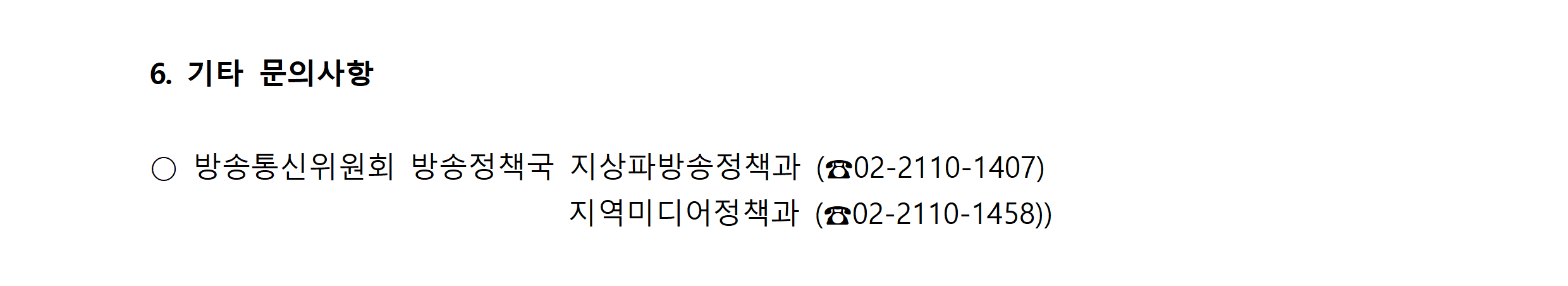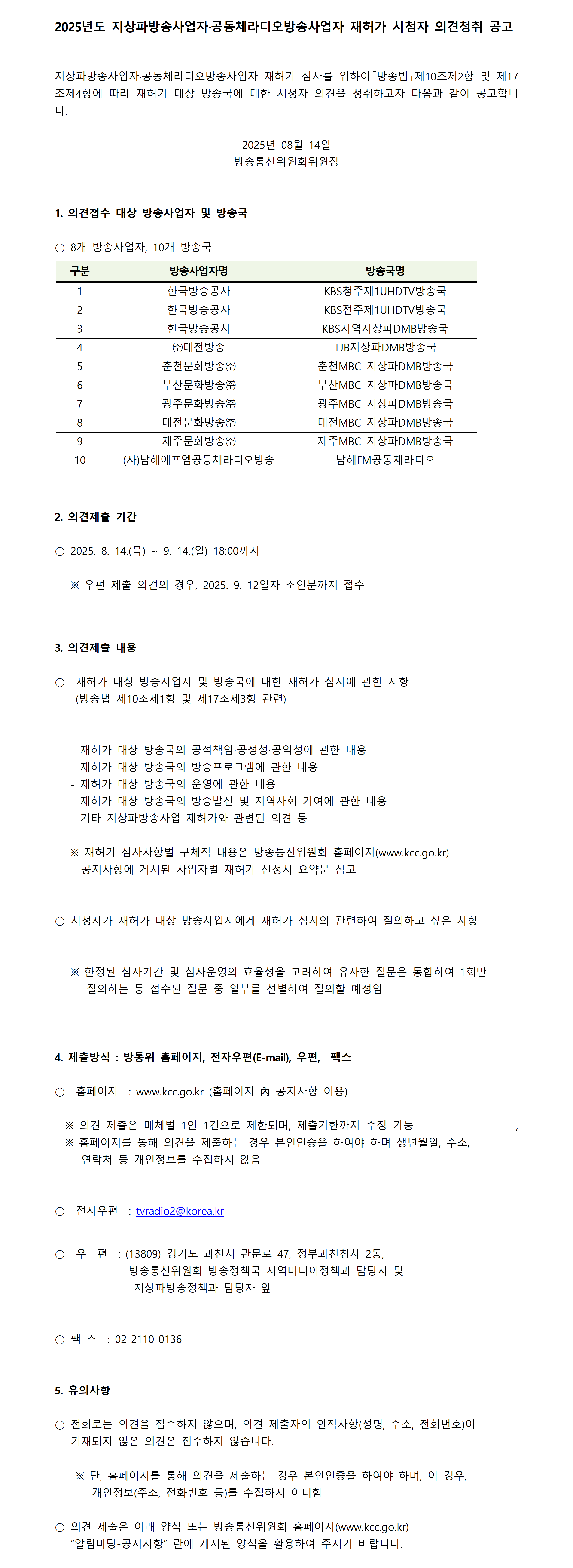공지사항 2025년도 지상파방송사업자·공동체라디오방송사업자 재허가 시청자 의견청취 공고 등록일 : 2025-08-14 07:32 조회수 : 12 ※ 시청자의견서 양식 (다운로드) ※ 대전MBC 사업계획서 요약문 (다운로드) 수정 삭제 이전글 목록