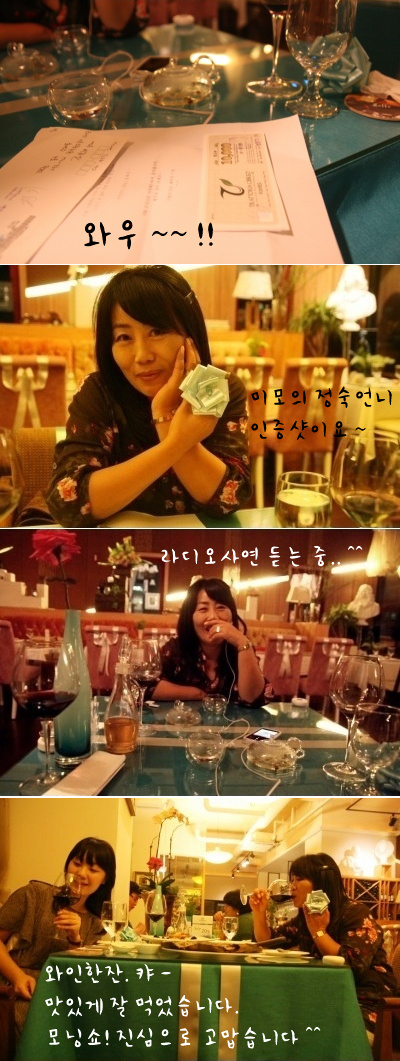 FM모닝쇼 월 화 수 목 금 07시 00분 홈 사연과신청곡 떡드세요 꽃을드려요 선곡표 이벤트게시판 후기게시판 후기게시판 정숙언니와 함께 식사 :) 조회수 : 148 생각지도 못했는데모닝쇼에서 치브레오 2인식권을 선물로주셔서사연속 주인공 정숙언니와 예쁜레스토랑에서 맛있는 저녁을 즐겼답니다 - 와인도 한잔! 하며 모닝쇼에 나온 사연도 못들은 언닐 위해 mp3에 담아가서 들려주었구요 헤헤진심으로 고맙고 또 감사해요~모닝쇼 앞으로도 열심히 청취할께요 :) 수정 삭제 이전글 다음글 목록