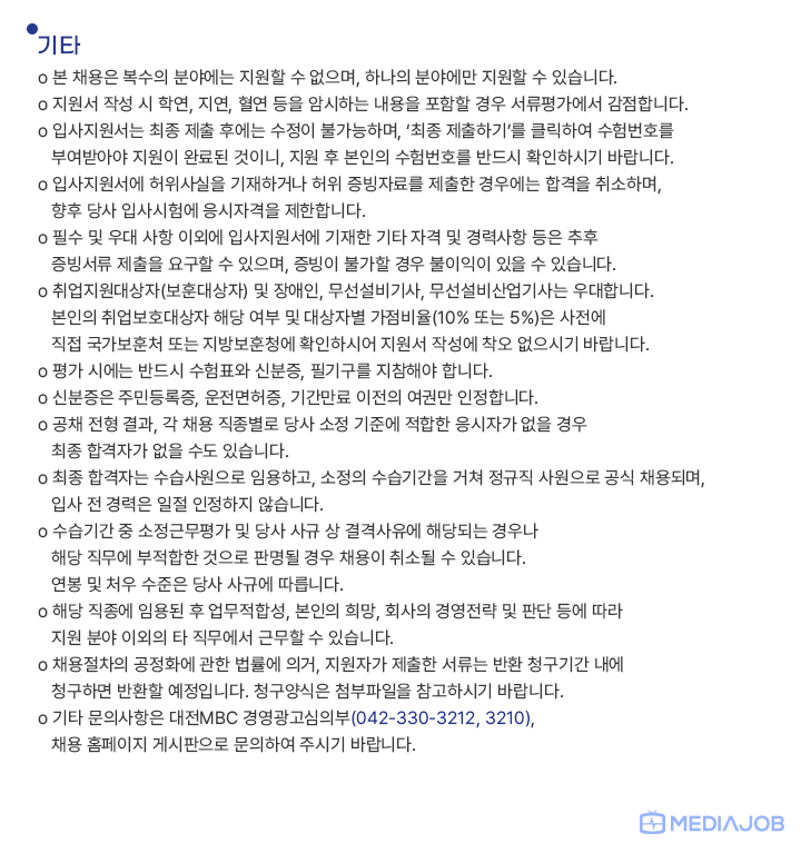 - 채용홈페이지(http://tjmbc.saramin.co.kr)를 통해서만 접수하실 수 있습니다.