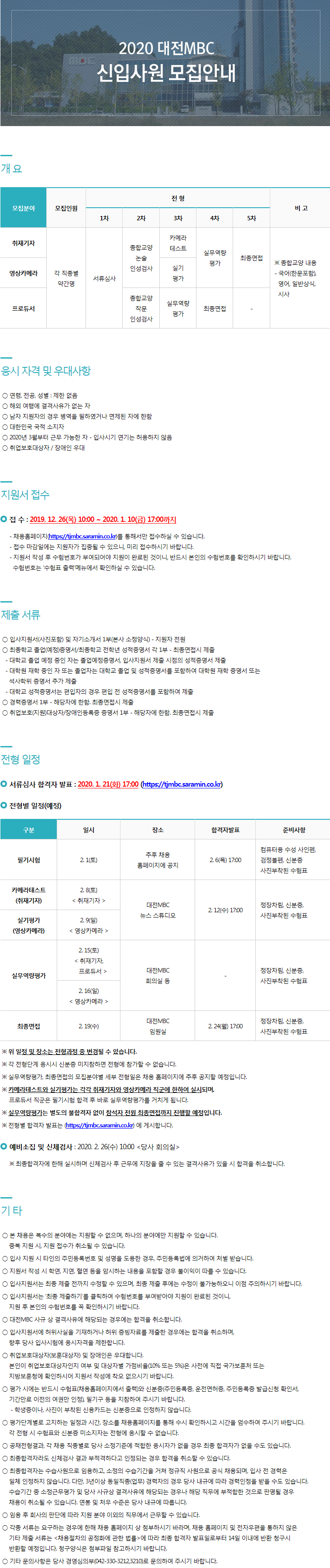채용안내 2020년 대전MBC 신입사원 모집안내 등록일 : 2019-12-27 16:15 조회수 : 2610 2020년 대전MBC 신입사원 모집안내 바로가기2020년 대전MBC 신입사원 모집안내 바로가기 수정 삭제 이전글 다음글 목록