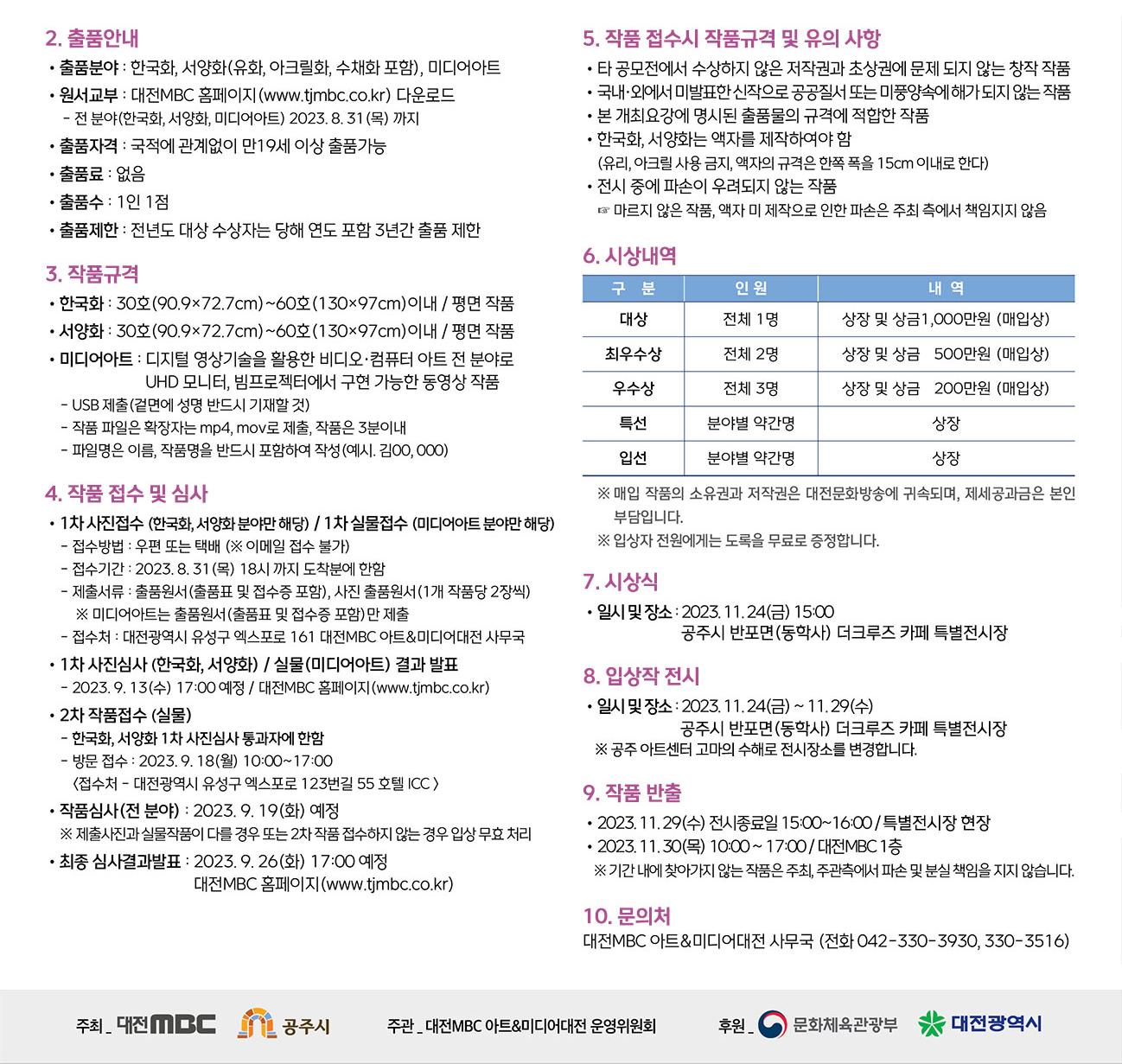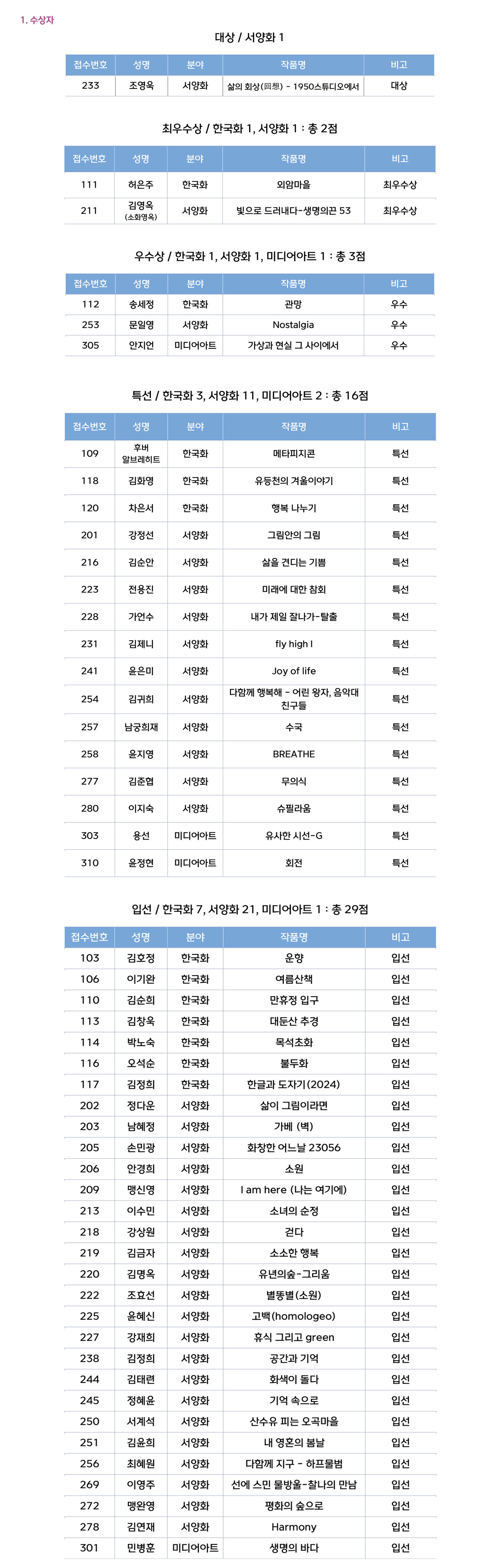 - 한국화, 서양화(유화, 아크릴화, 수채화 포함), 미디어아트