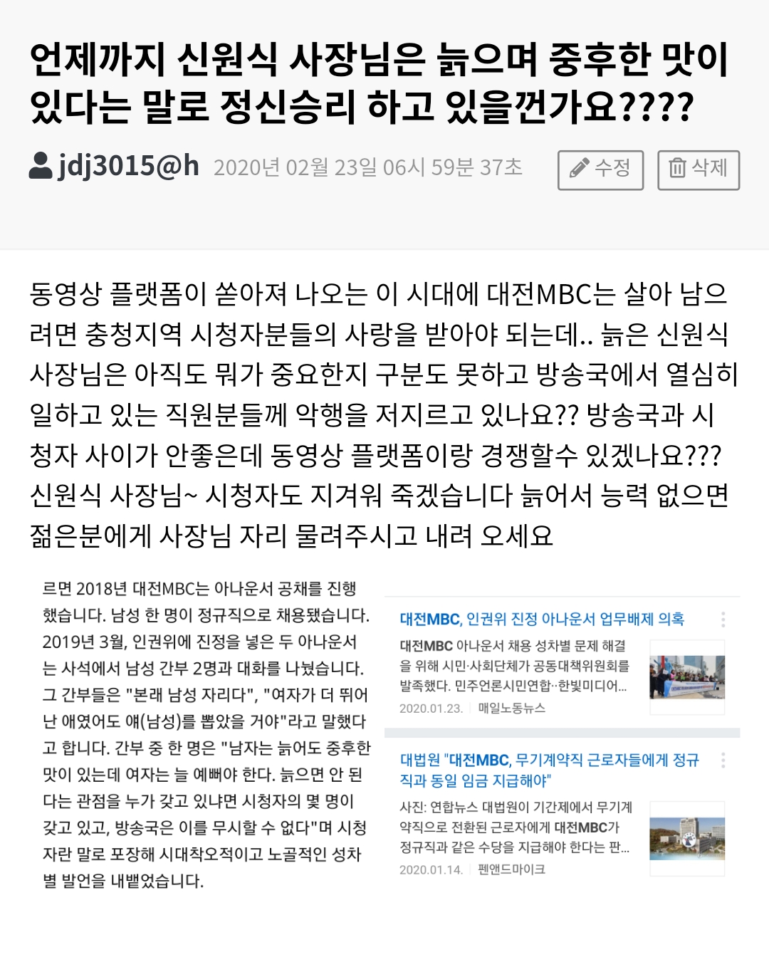 시청자의견 시청자 의견 언제까지 신원식 사장님은 늙으면 중후한 맛이 있다는 말로 정신승리 하고 있을껀가요??? 등록일 : 2020-03-02 11:15 조회수 : 109 여러분의 의견을 남겨주세요 ※ 댓글 작성시 상대방에 대한 배려와 책임을 담아 깨끗한 댓글 환경에 동참해 주세요. 0/2000 등록 수정 삭제 이전글 다음글 목록