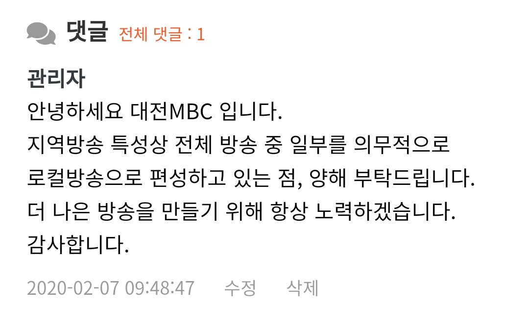[지금까지 제가 올린글이랑은 별게로 쓰는 글입니다] 아무리 의무적으로 로컬 방송을 해야 된다고 해도.. 어제와 같은 너를 만났다 프로그램이라면.. 시청자를 조금이라도 생각했다면... 요령껏 로컬 시간대 조절 할수있는거 아닌가요??? 대전MBC방송국 사람들은 더 나은 방송을 만들기 위한다고 말만하지.. 노력하는 모습은 하나도 없네요?? 차라리 댓글을 달지나 마시지.... 밑에 사진을 보고 느껴지는게 없으신가요????  뭐가 중요한지 모르시나요???